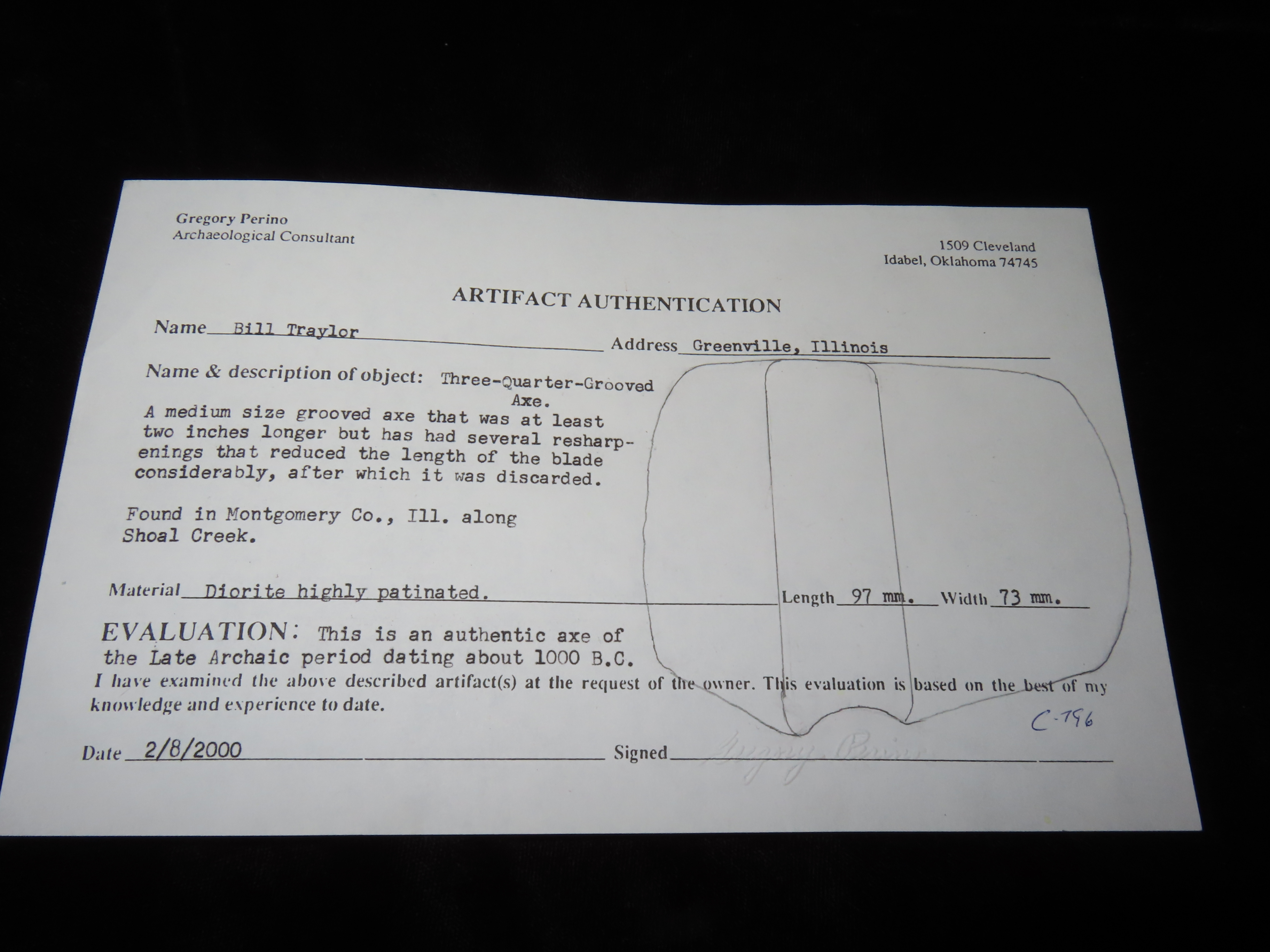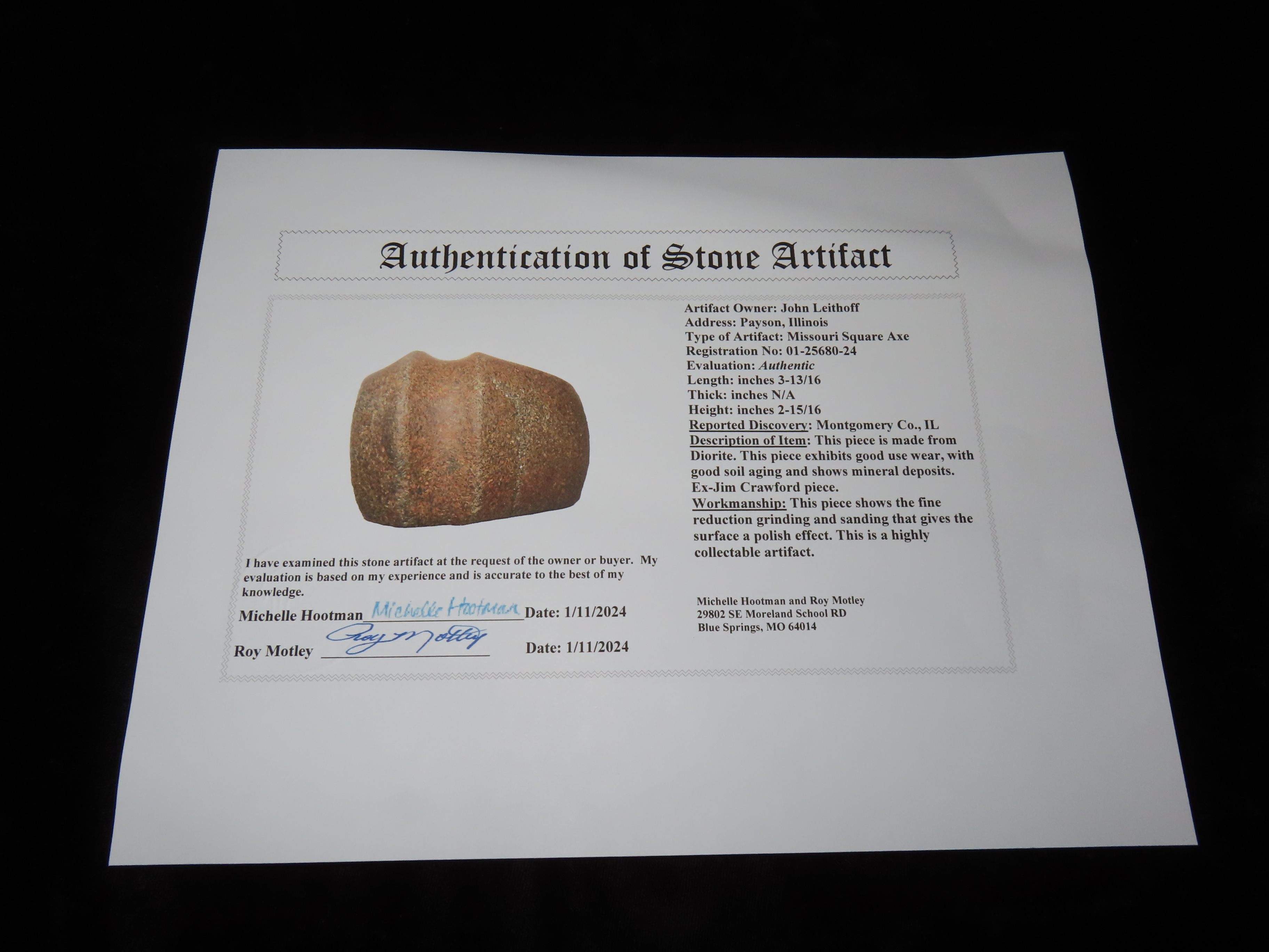3 13/16″ Missouri Square Axe, 2xCOA-Perino/Motley, found in Montgomery Co., Illinois along Shoal Creek, Perino notes on COA that axe was at least 2″ longer, but has had several resharpenings which reduced the blade length prior to being discarded. Ex Jim Crawford, Ex John Leithoff Collection