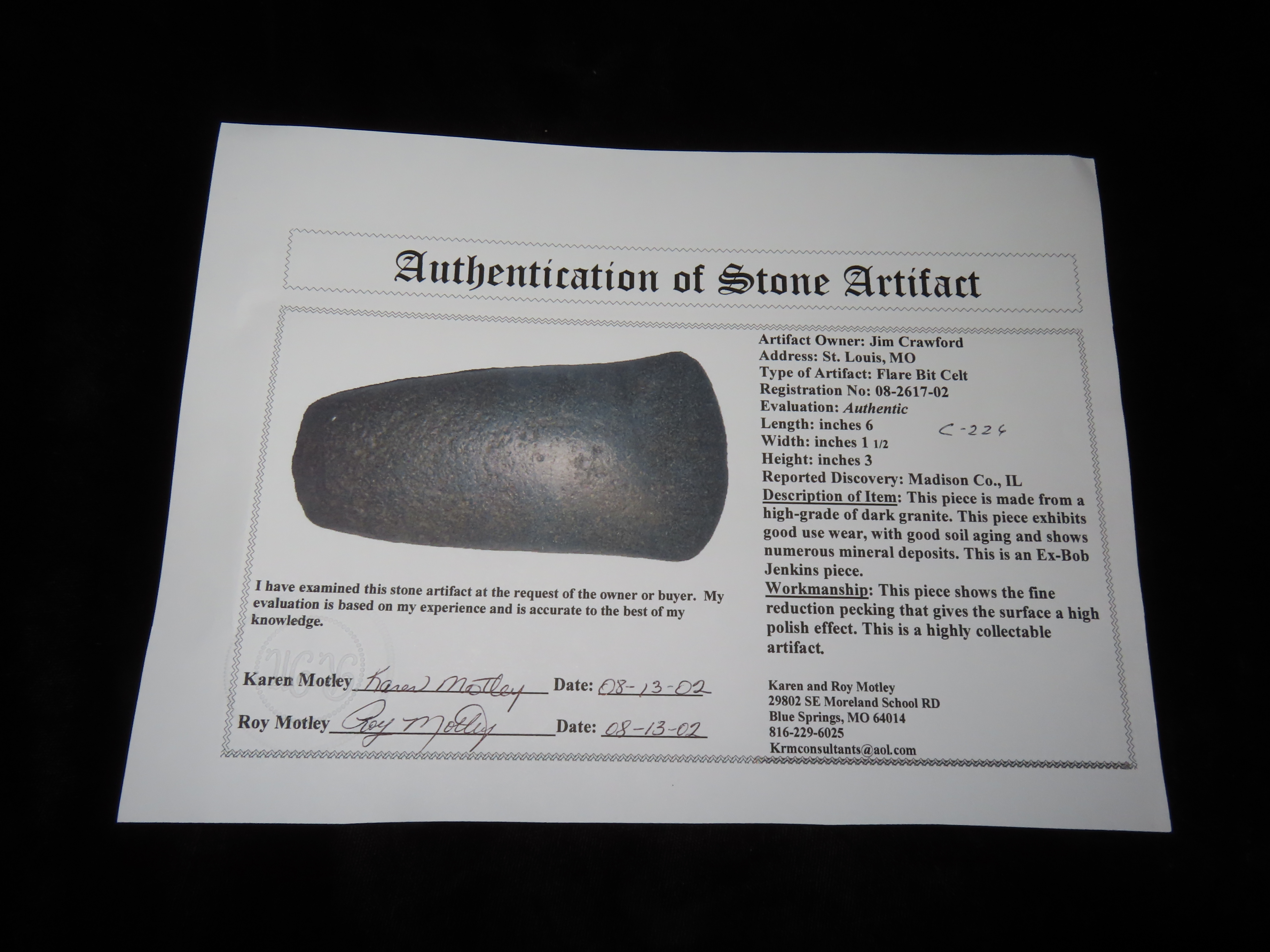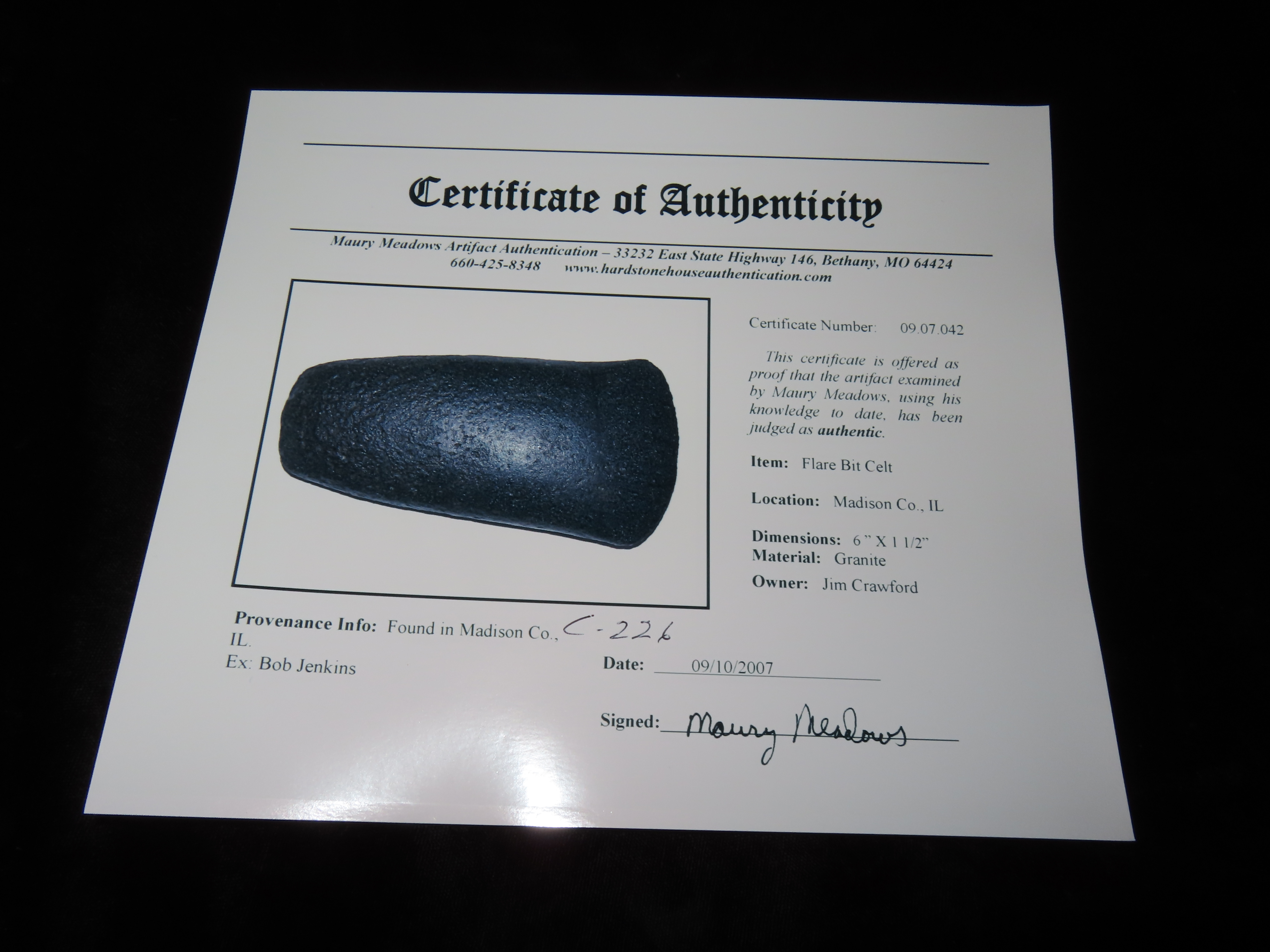6″ Flare Bit Celt, 2xCOA-Meadows/Motley, found in Madison Co., Illinois, Ex Bob Jenkins, Ex Jim Crawford, Ex John Leithoff Collection