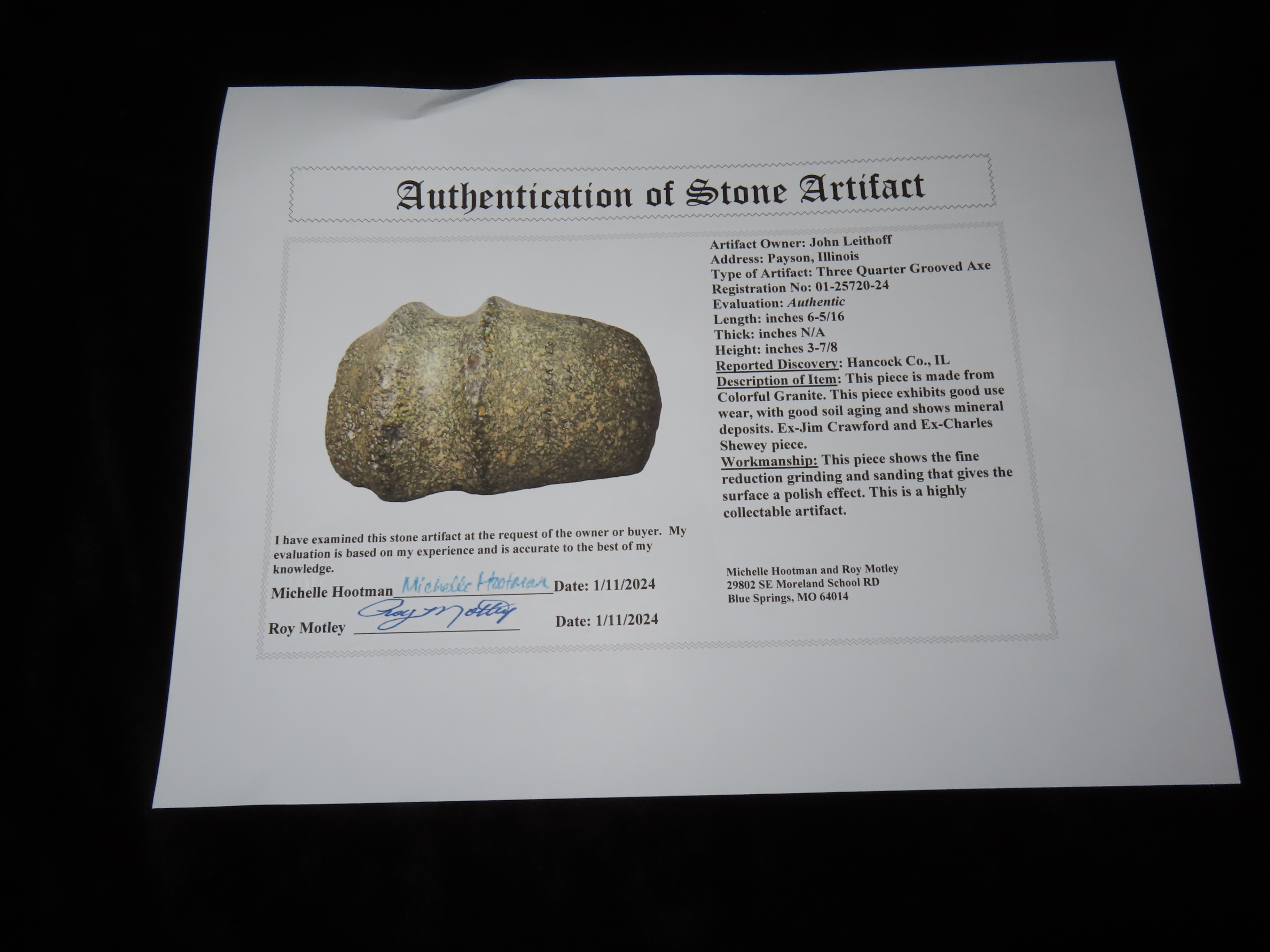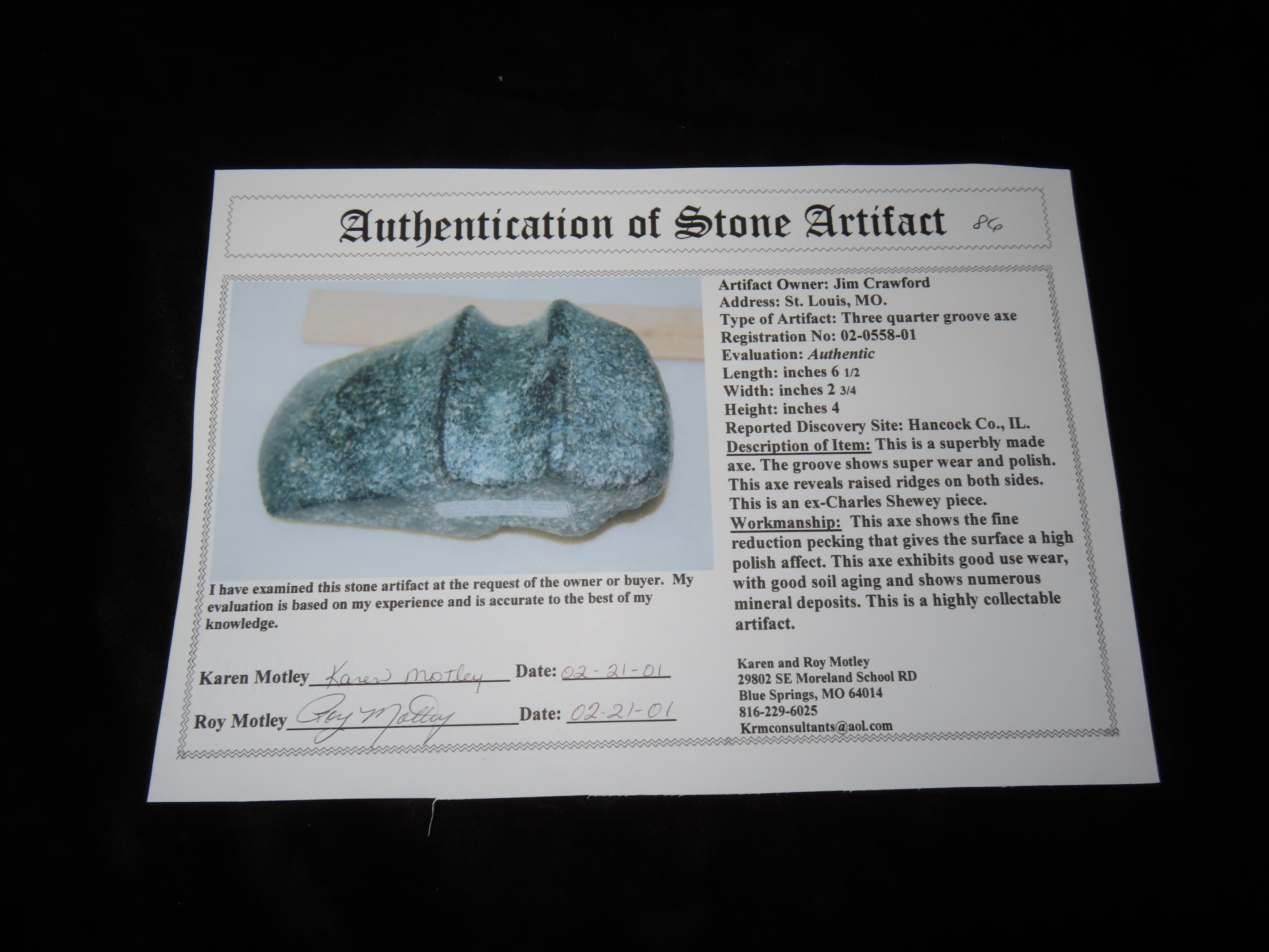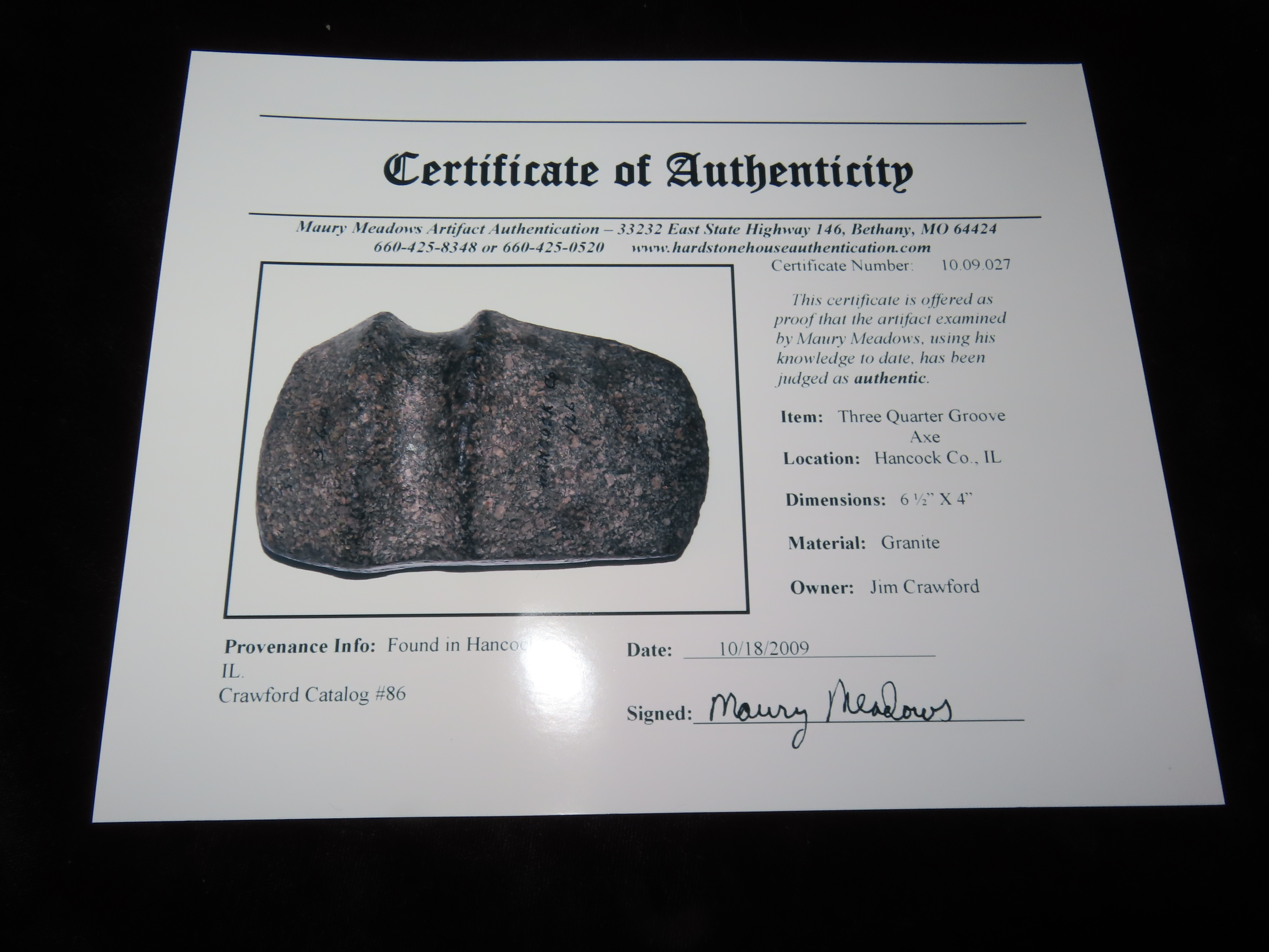 6 1/2″ 3/4-Groove Axe, 2xCOA-Meadows/Motley, found in Hancock Co., Illinois, Ex Jim Crawford, Ex Charles Shewey, Ex John Leithoff Collection