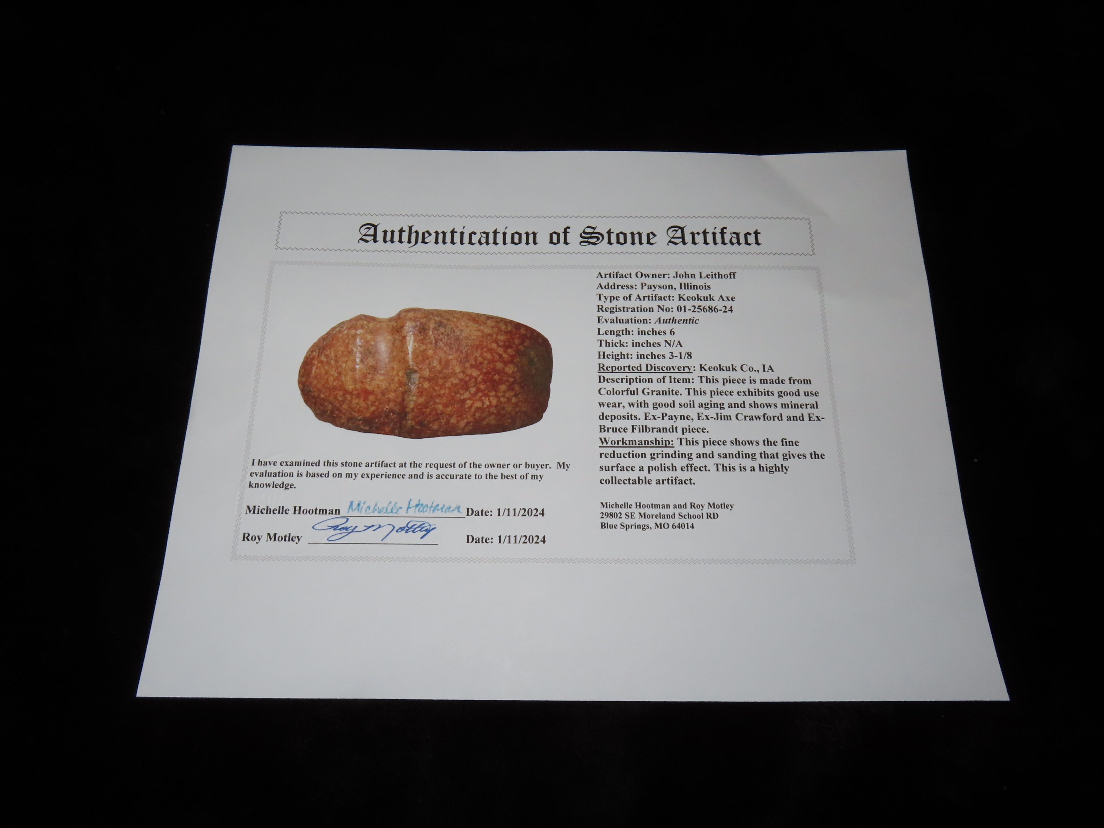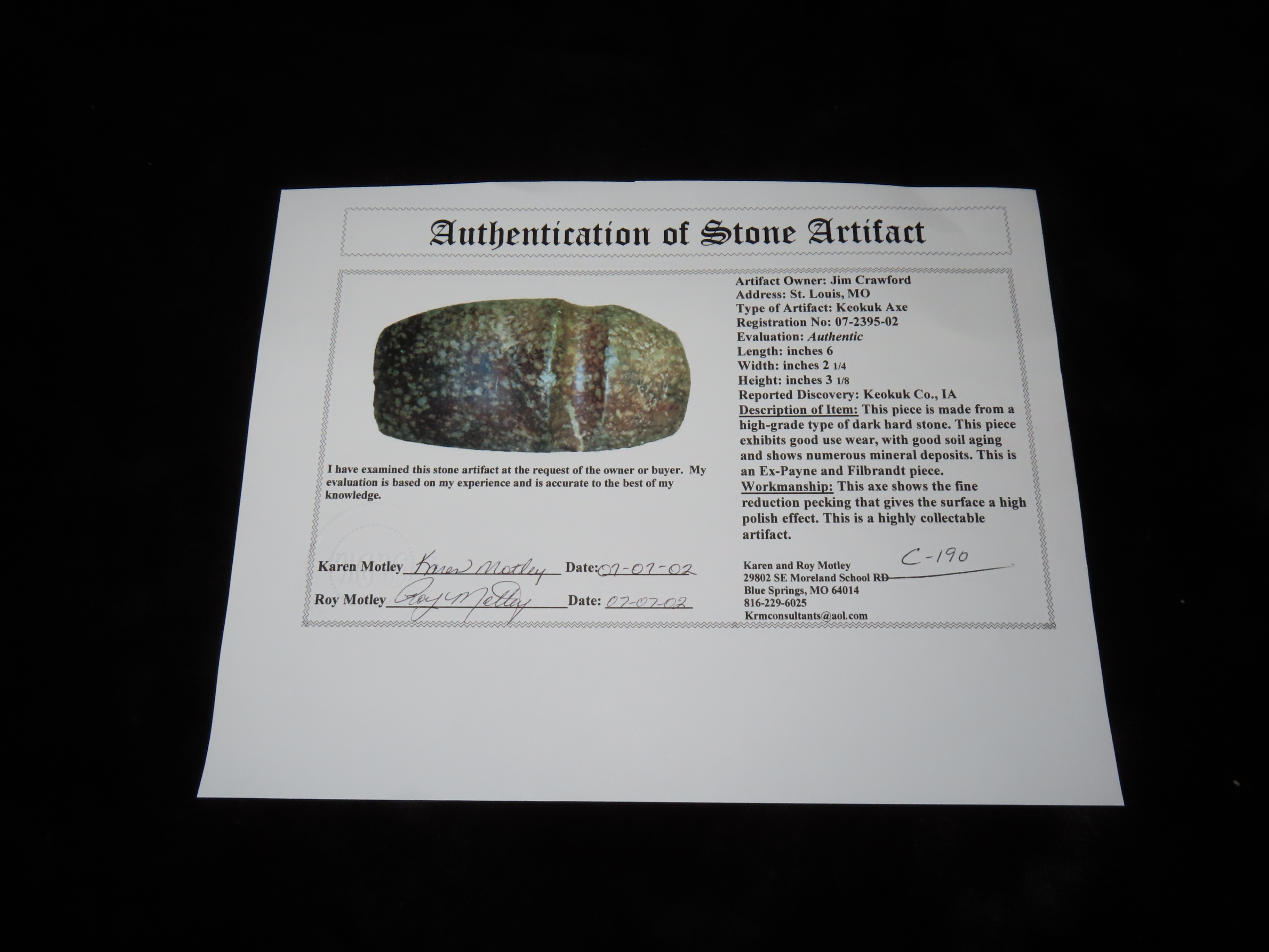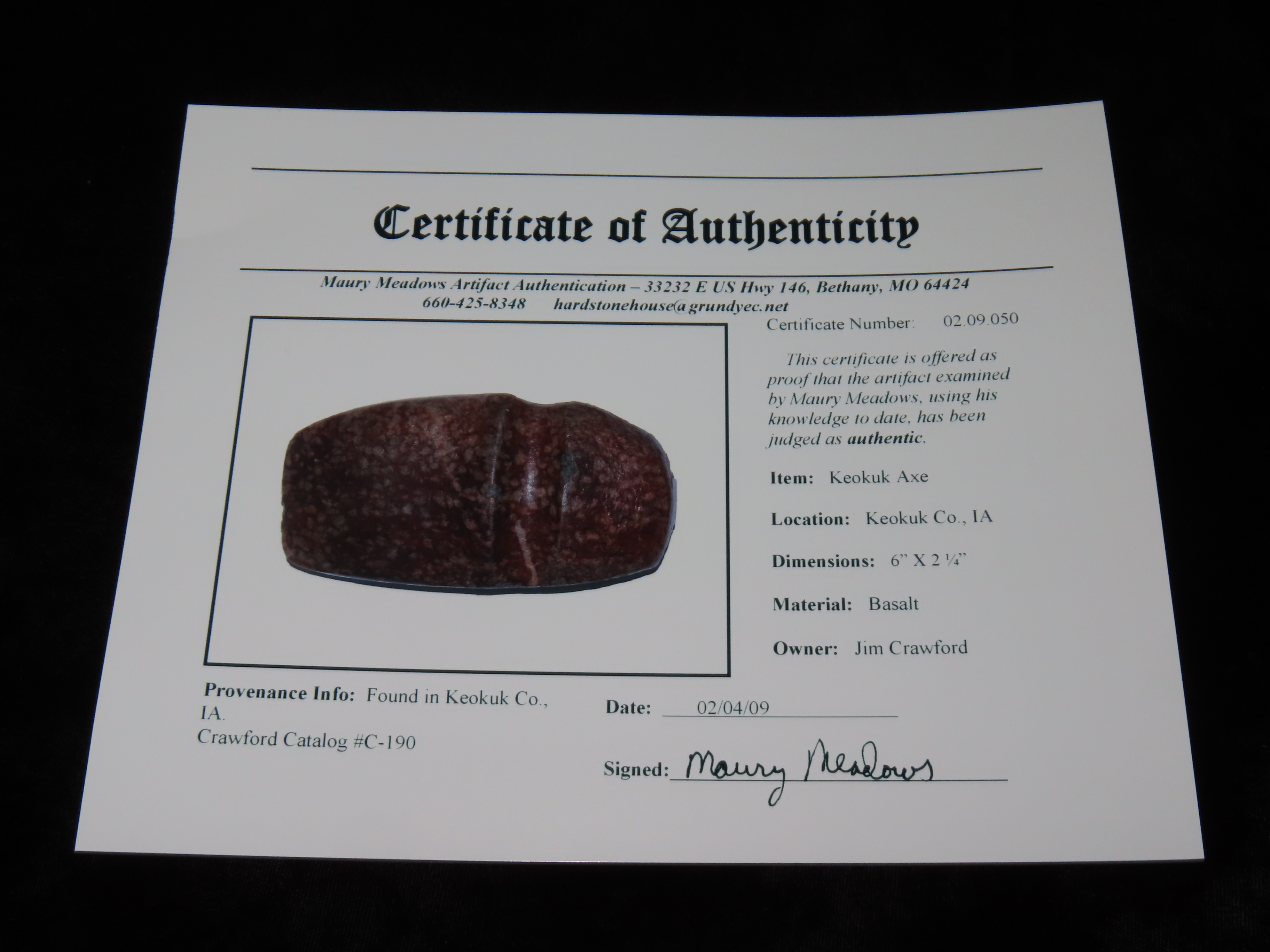 6″ Keokuk Axe, 3xCOA-Meadows/2xMotley, found in Keokuk Co., Iowa, Ex Jim Crawford, Ex Payne, Ex Bruce Filbrandt, Ex John Leithoff Collection