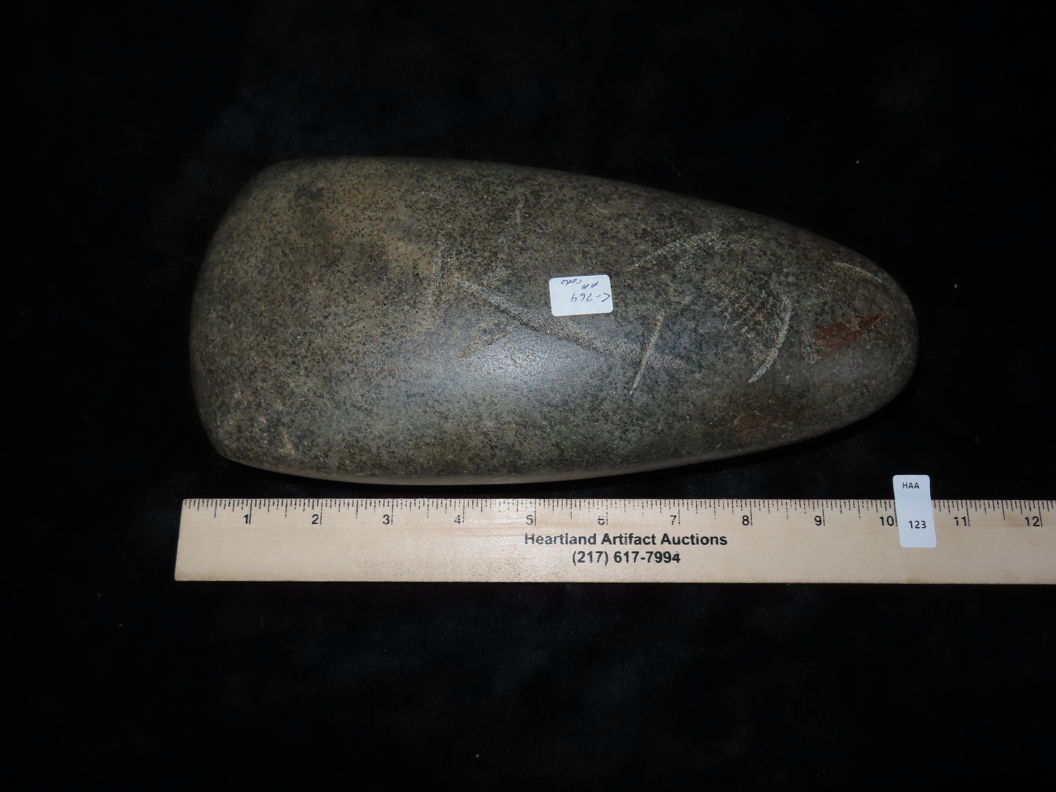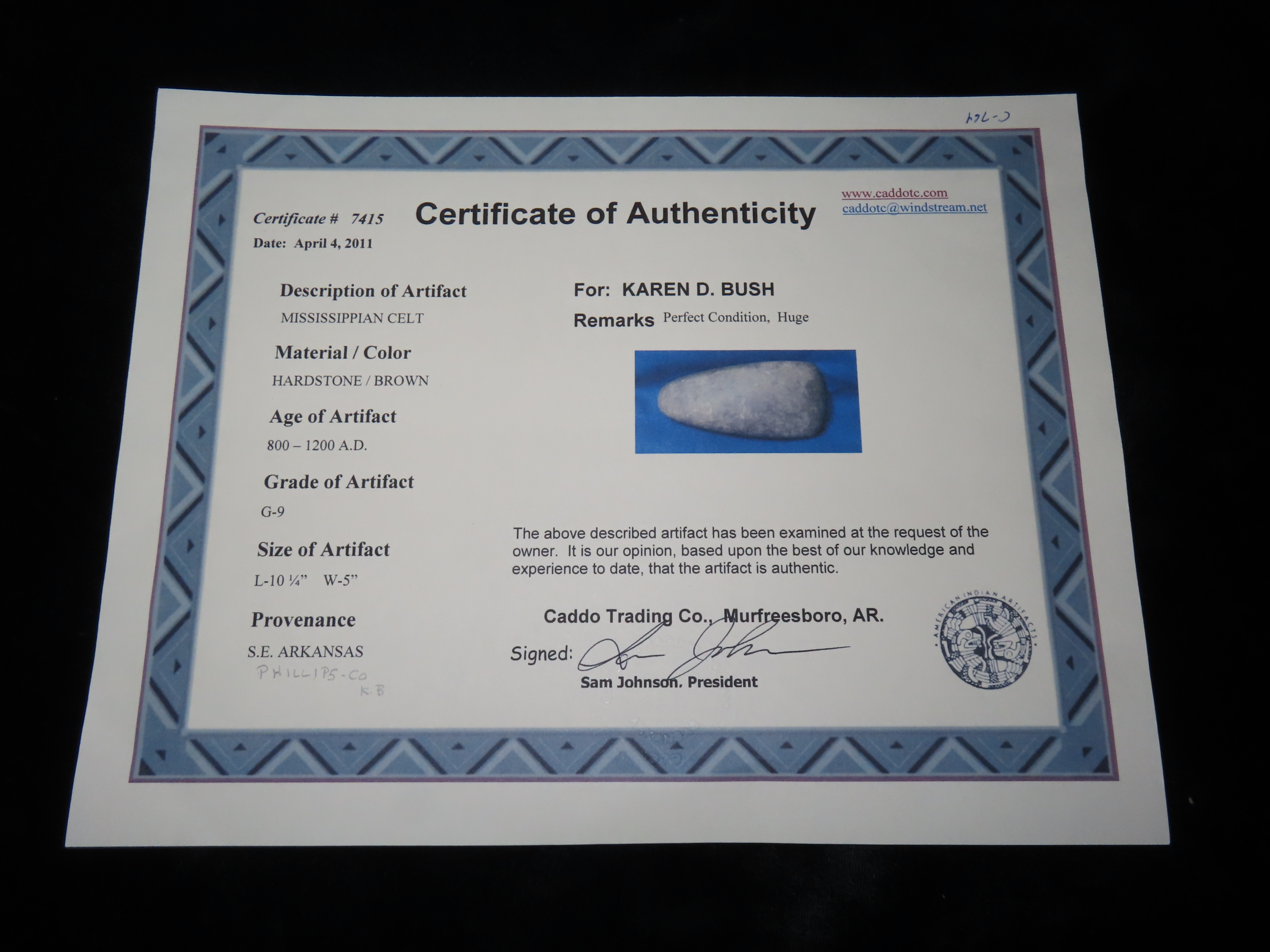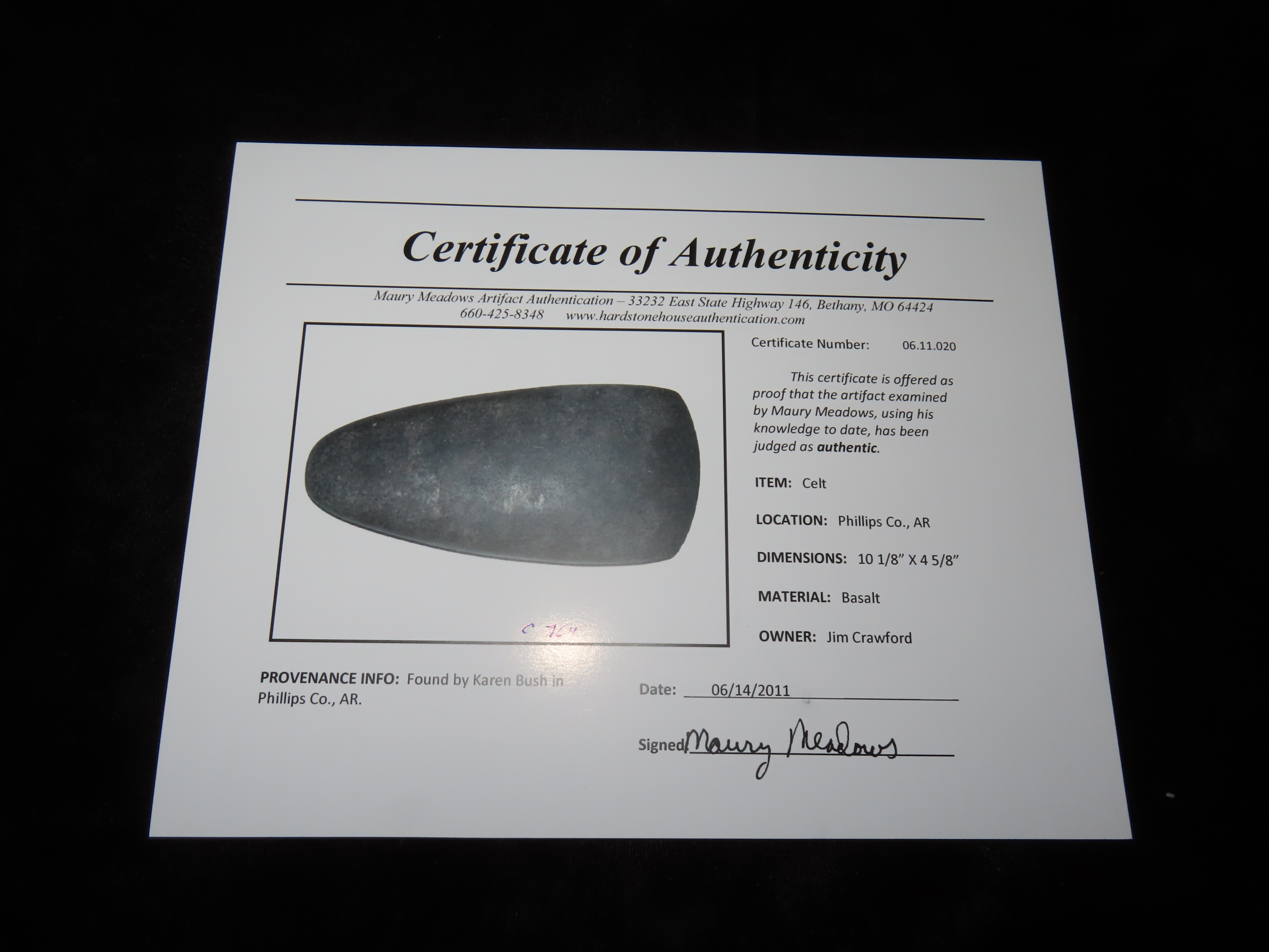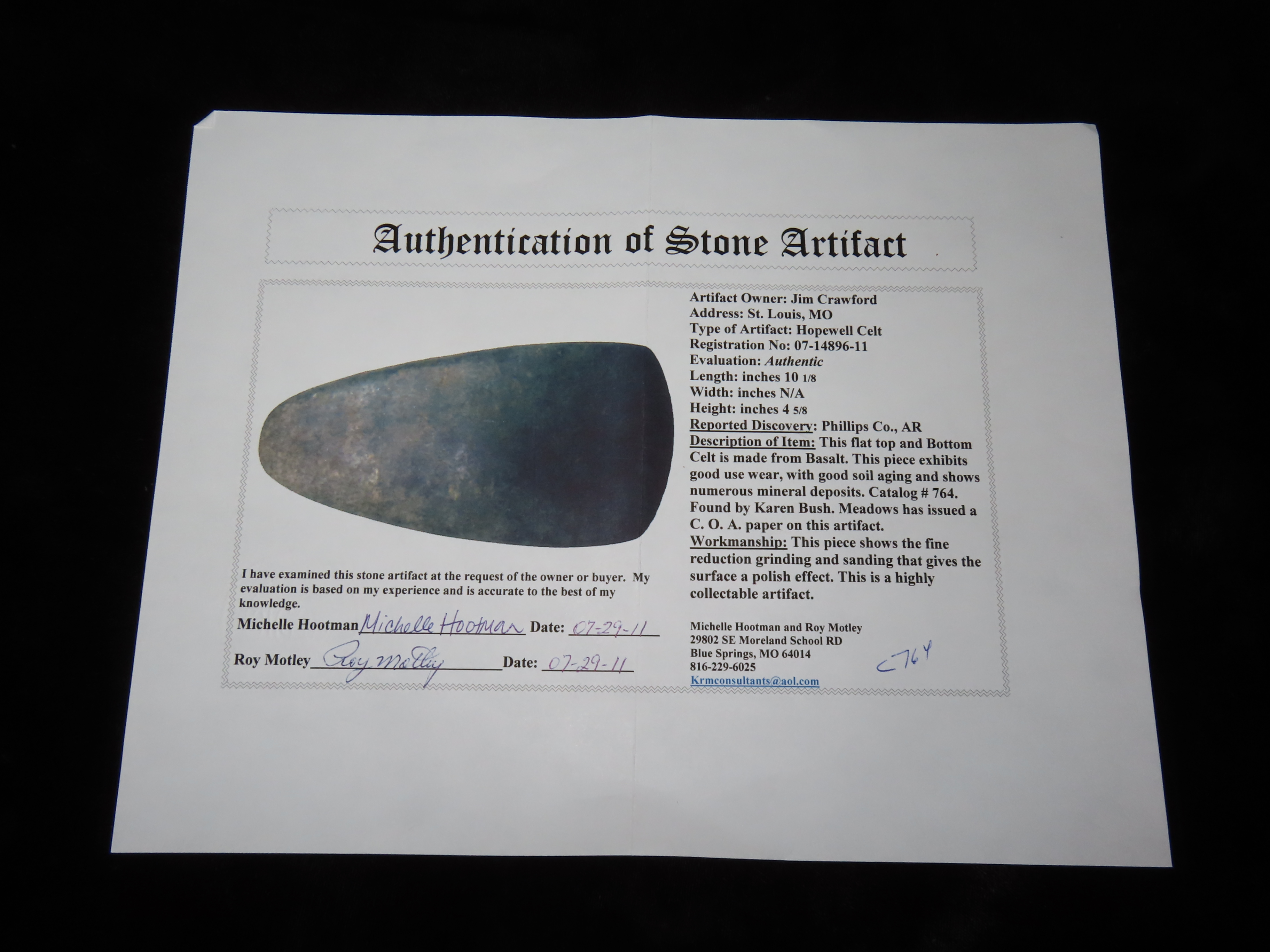 10 1/8″ Hopewell Celt, 3xCOA-Meadows/Johnson/Motley, found in Phillips Co., Arkansas by Karen Bush, Ex Jim Crawford, Ex John Leithoff Collection
