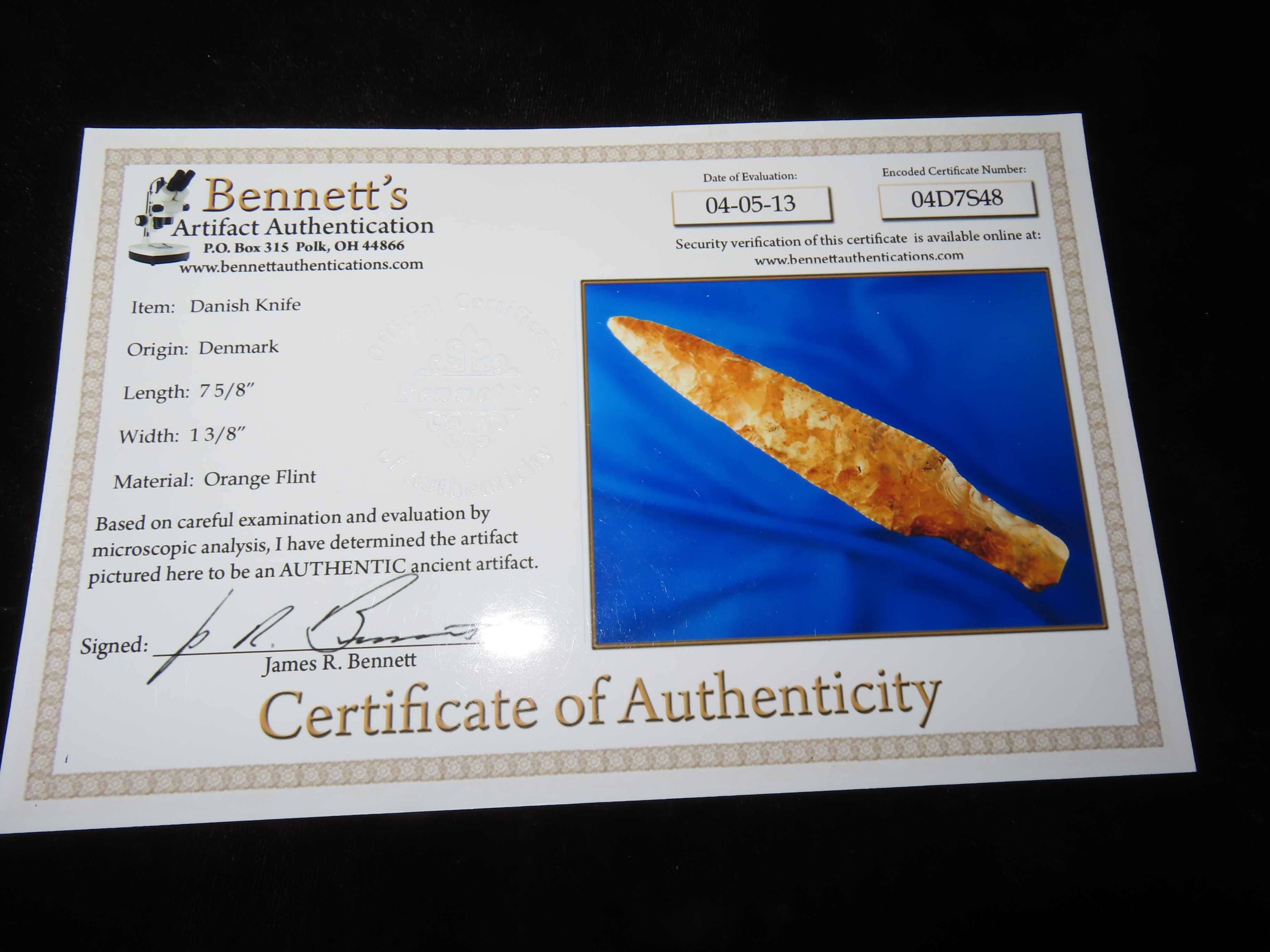 7 5/8″ Danish Knife, Bennett COA, found in Denmark, Ex Duane Schneider Collection