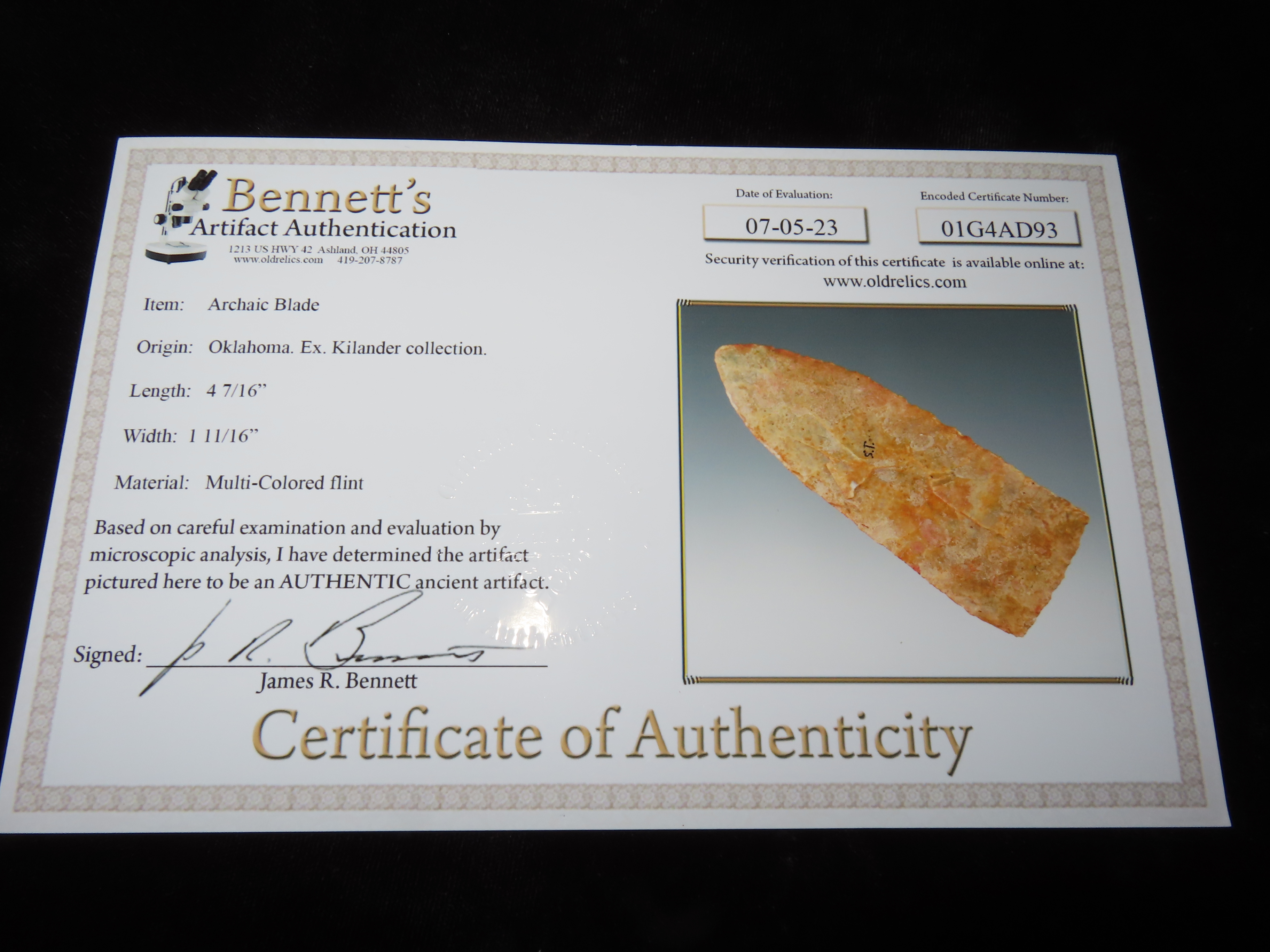 4 7/16″ Very Fine Archaic Blade, found in Oklahoma, Ex Kilander, Ex Duane Schneider Collection