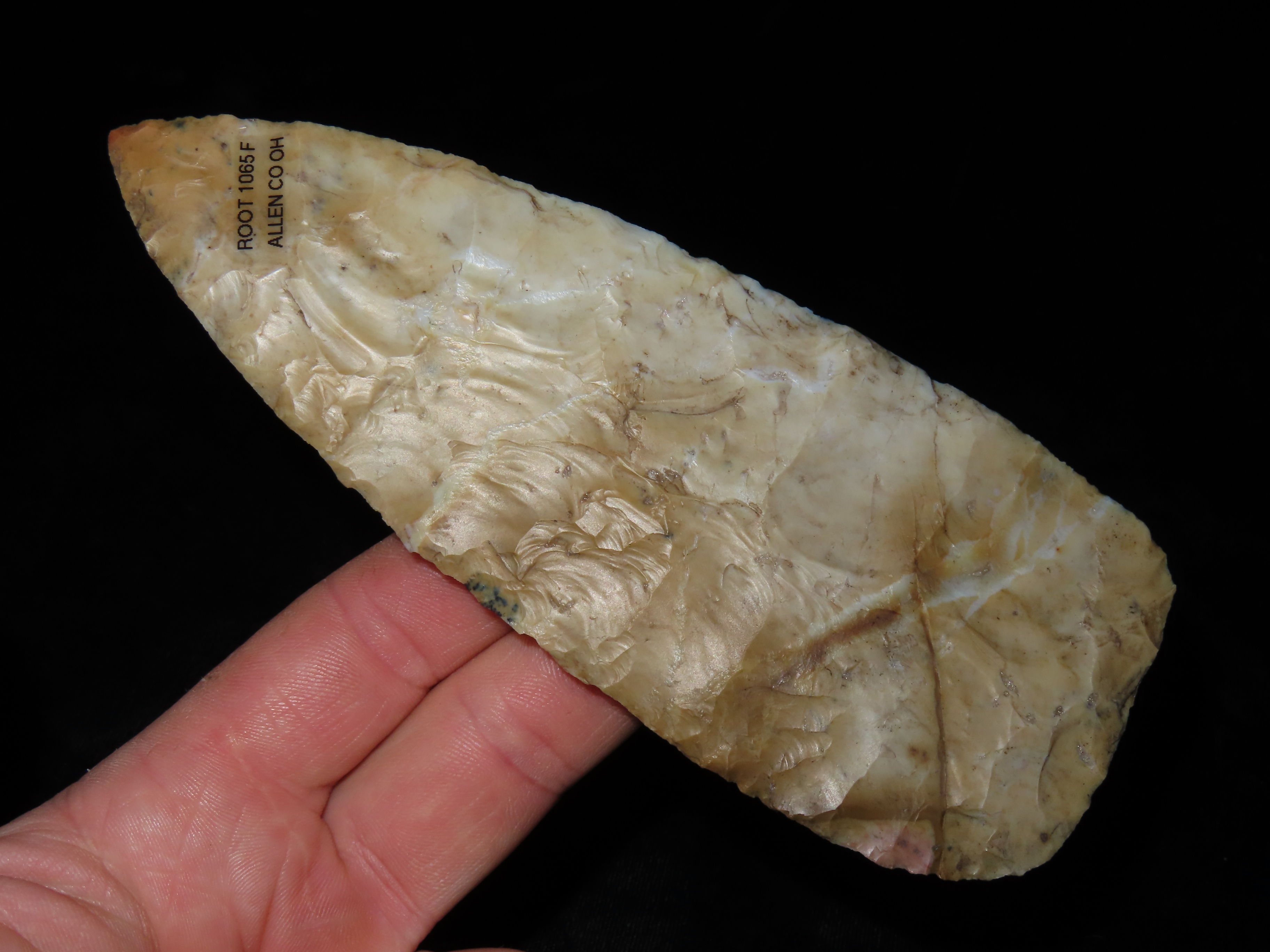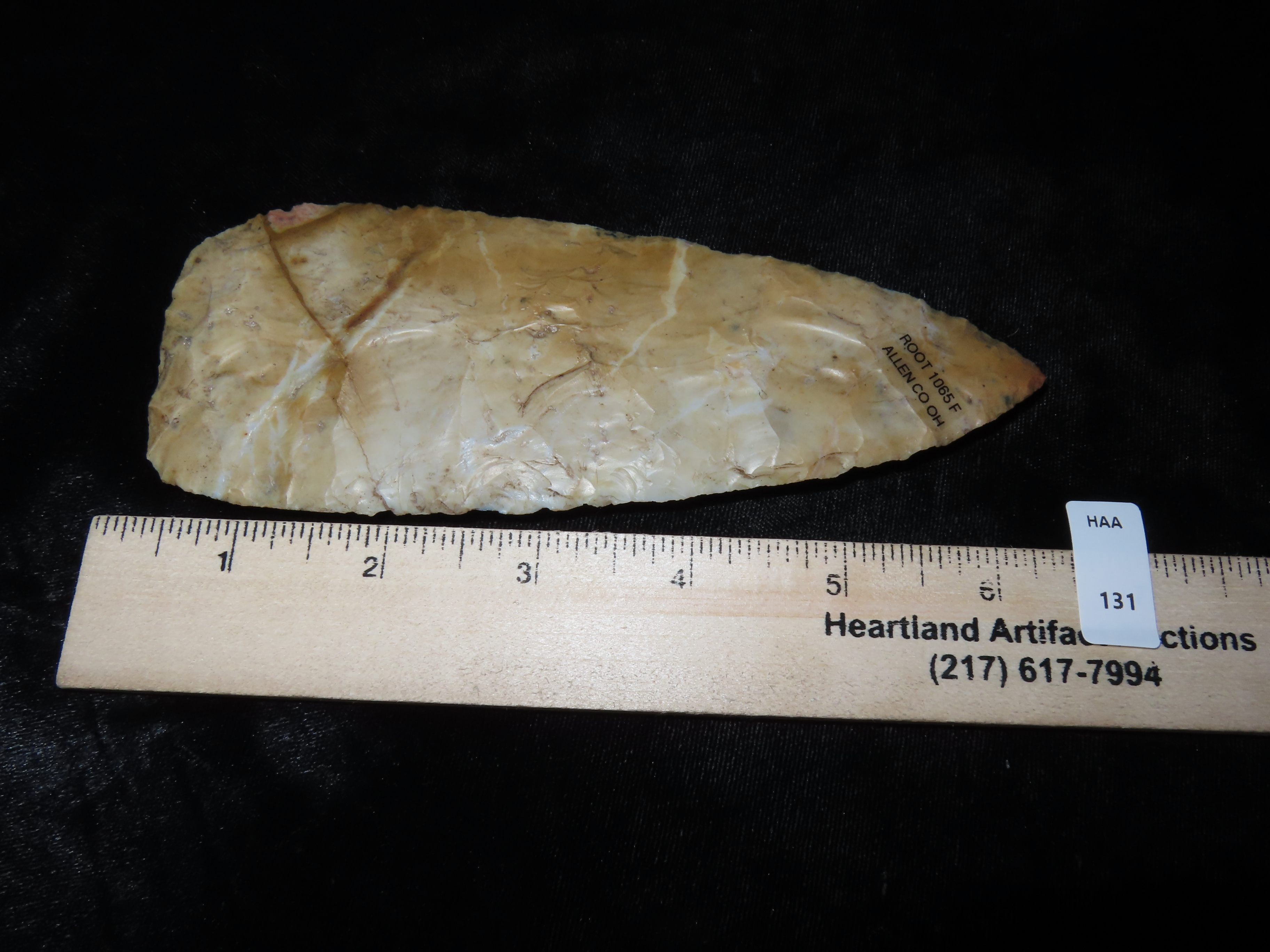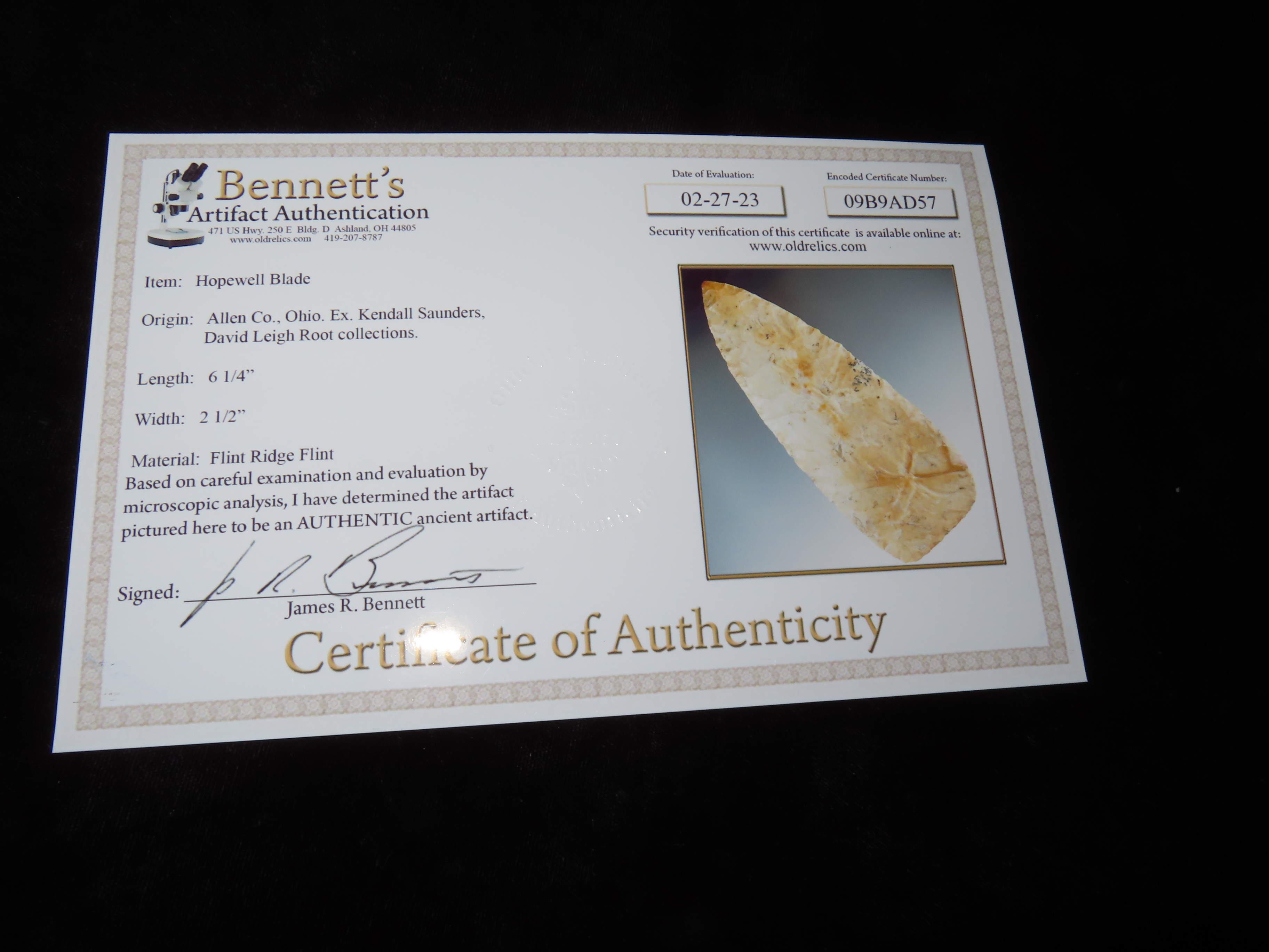 6 1/4″ Massive Hopewell Blade, Bennett COA, found in Allen Co., Ohio, Ex Kendall Saunders, Ex David Leigh Root, Ex Duane Schneider Collection