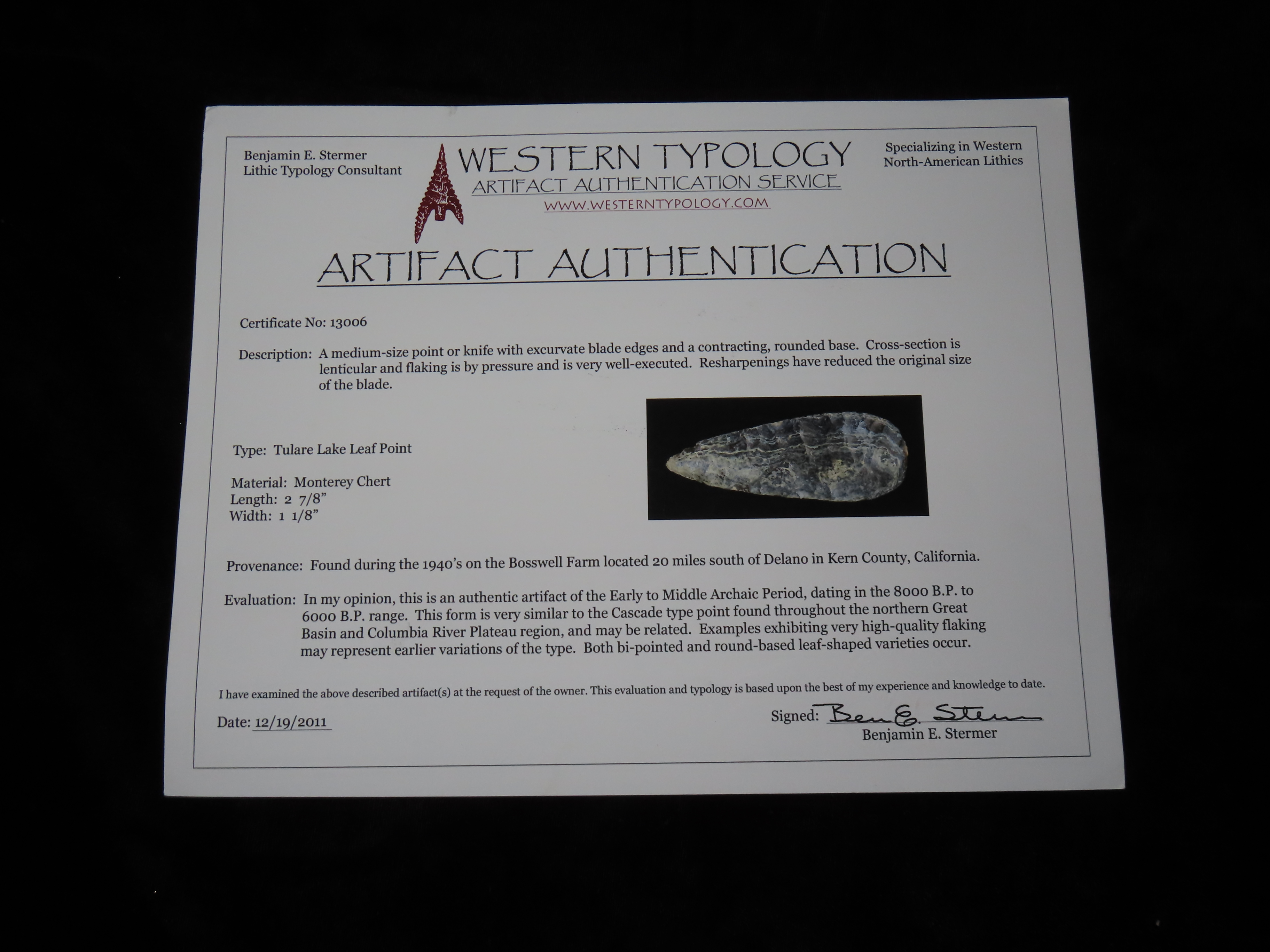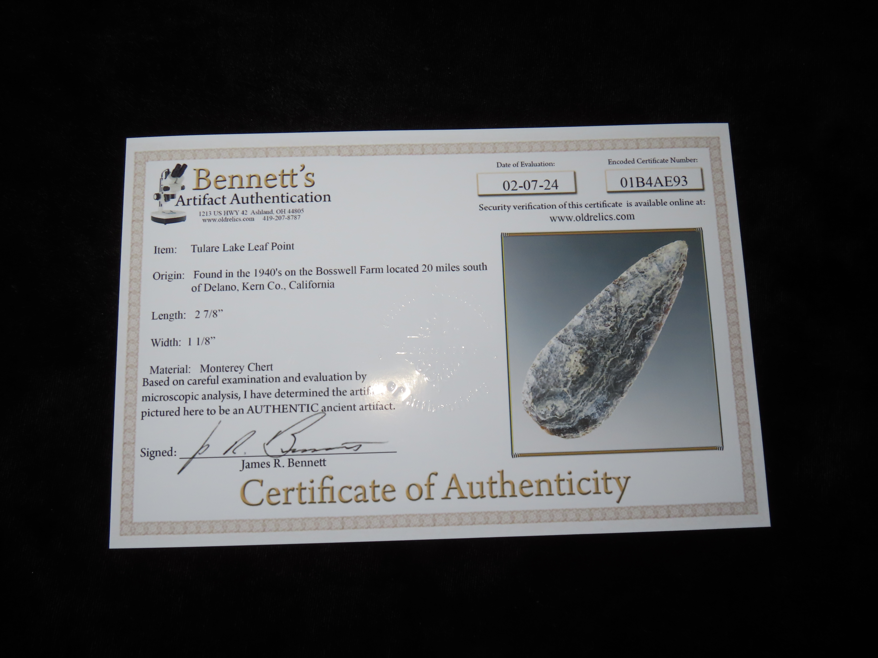 2 7/8″ Tulare Lake Leaf Point, 2x COA-Bennett/Stermer, made of outstanding Monterey Chert, found in the 40’s on the Boswell Farm, Kern Co., California, Ex Duane Schneider Collection