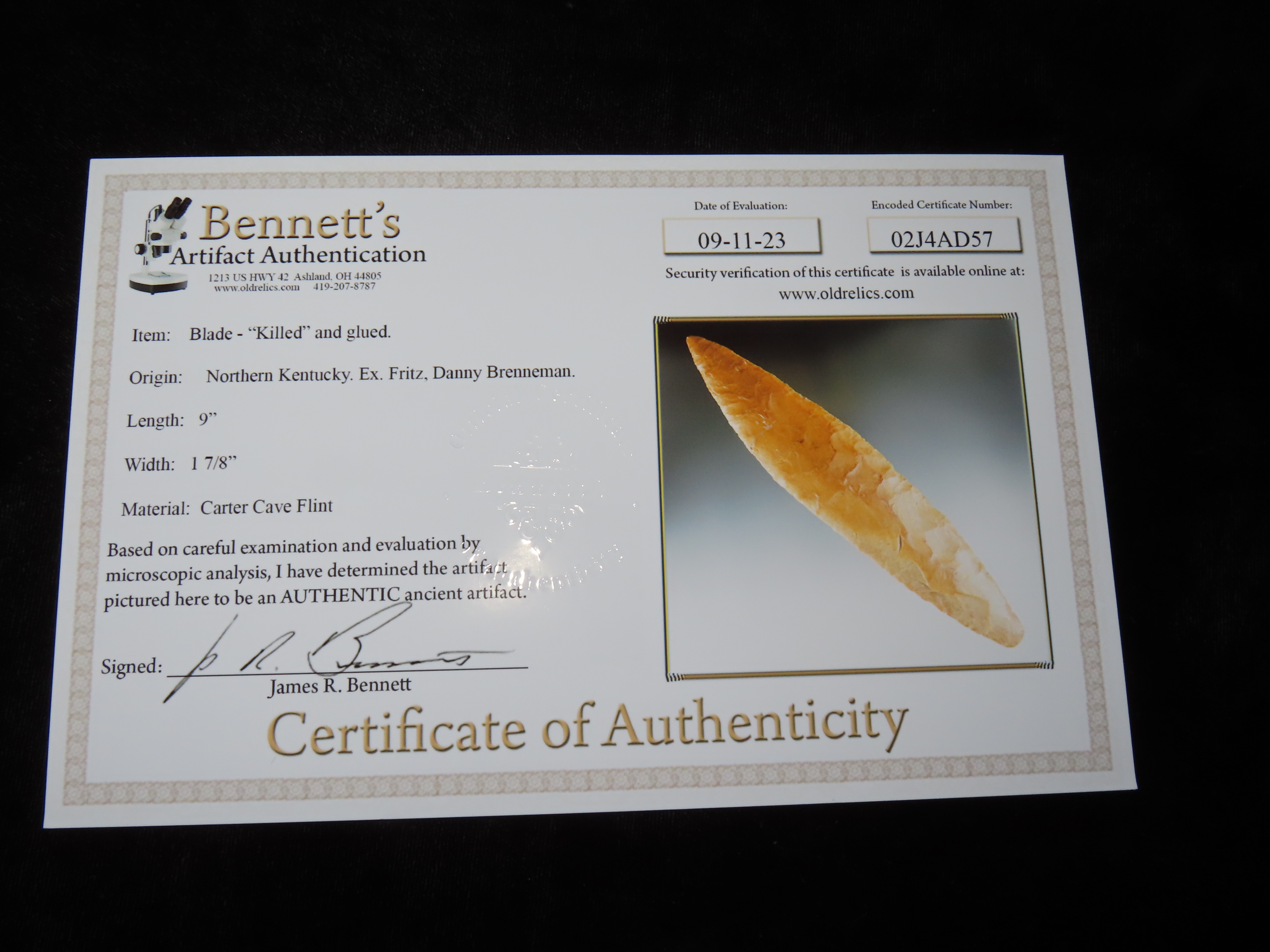 9″ Blade, Bennett COA, Ceremoniously “Killed” and restored, found in Northern Kentucky, Ex Fritz, Ex Danny Brenneman, Ex Duane Schneider Collection