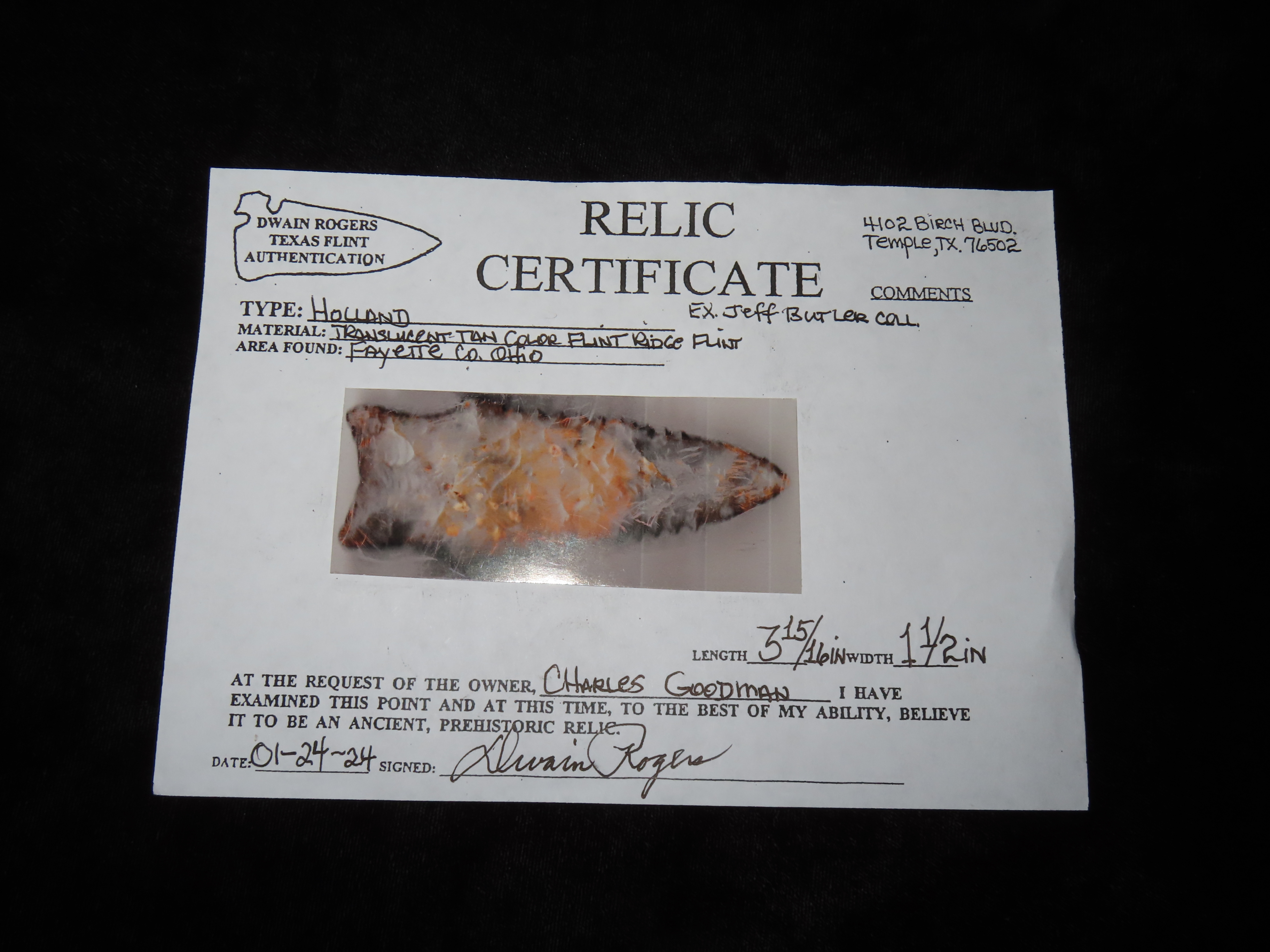 3 15/16" Holland, Rogers COA, Gorgeous Color, found in Fayette Co., Ohio, Es Jeff Butler, Ex Charles Goodman, Ex Duane Schneider Collection