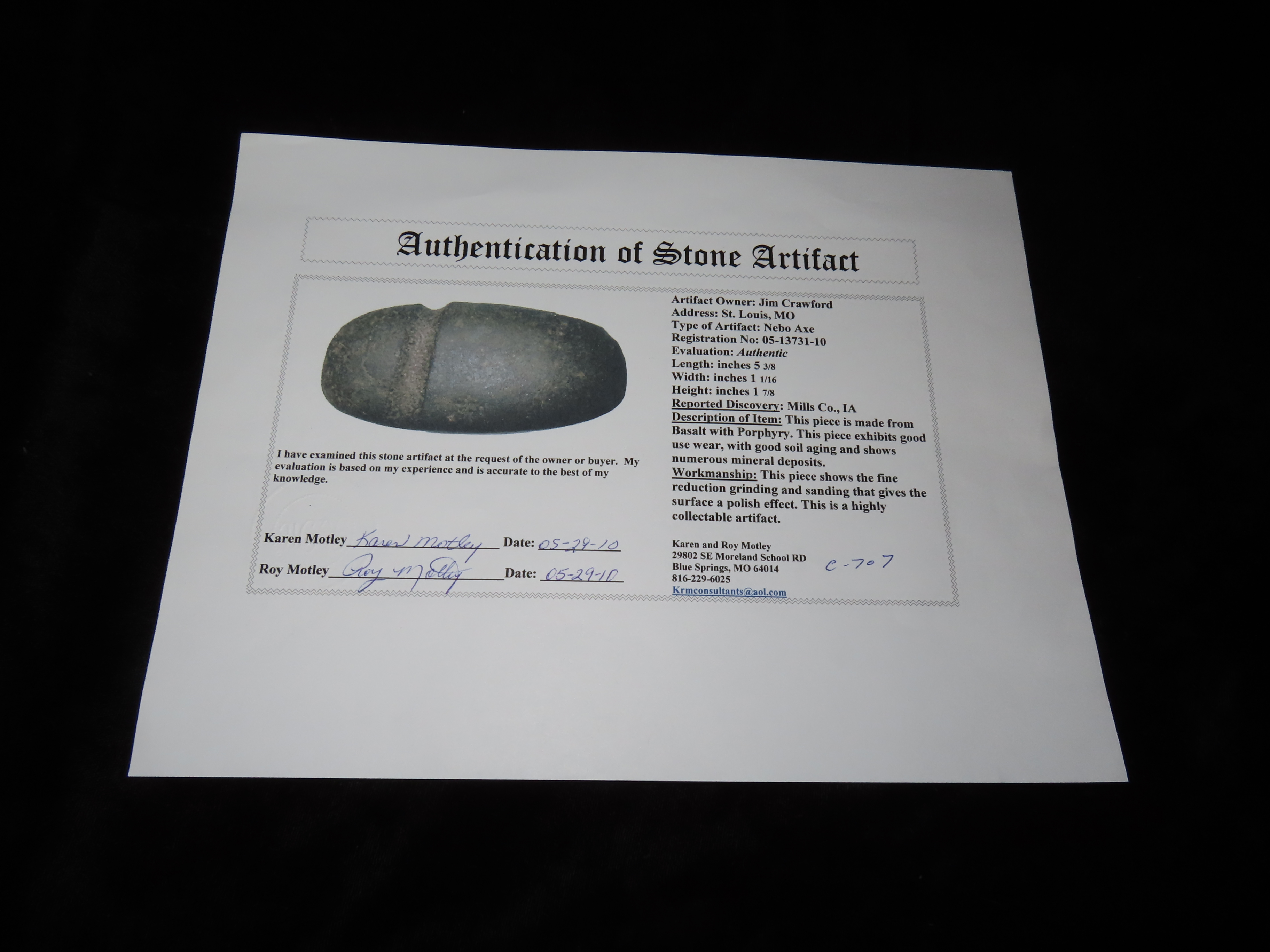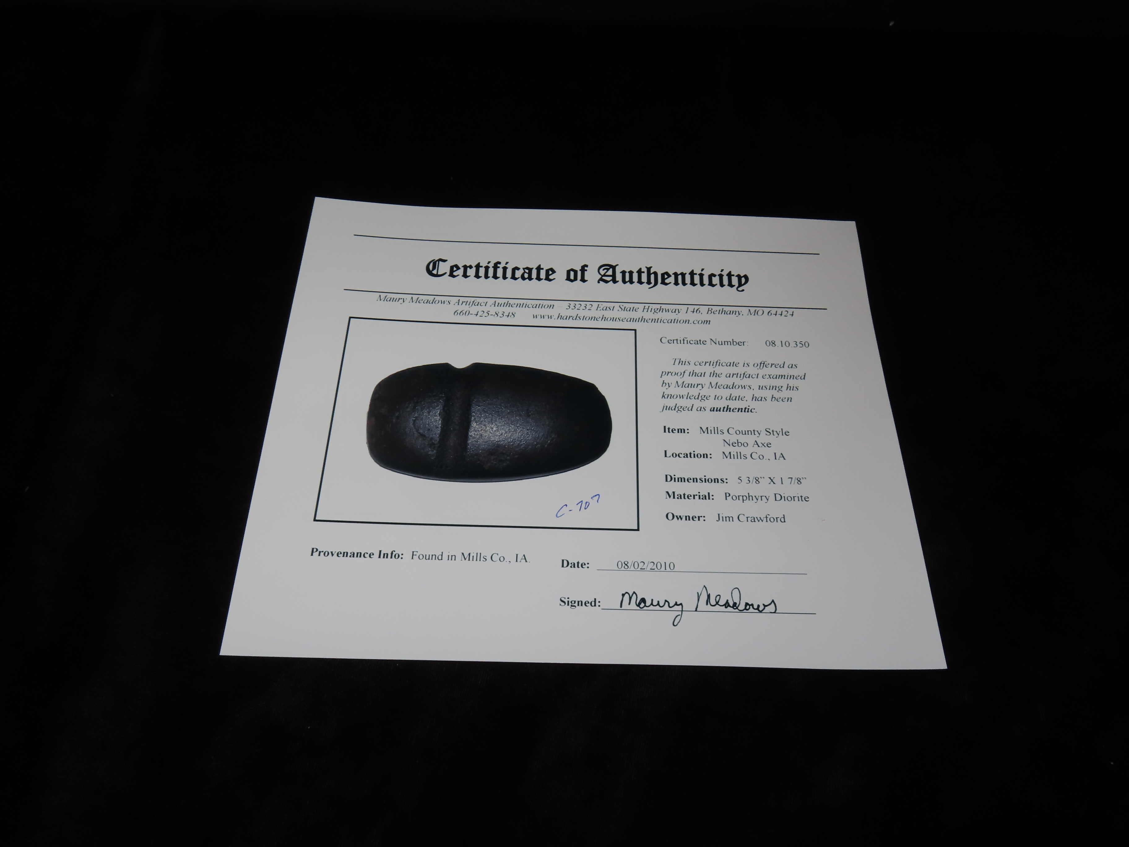 5 3/8″ Nebo Axe, 2xCOA-Meadows/Motley, found in Mills Co., Iowa, Ex Jim Crawford, Ex John Leithoff Collection
