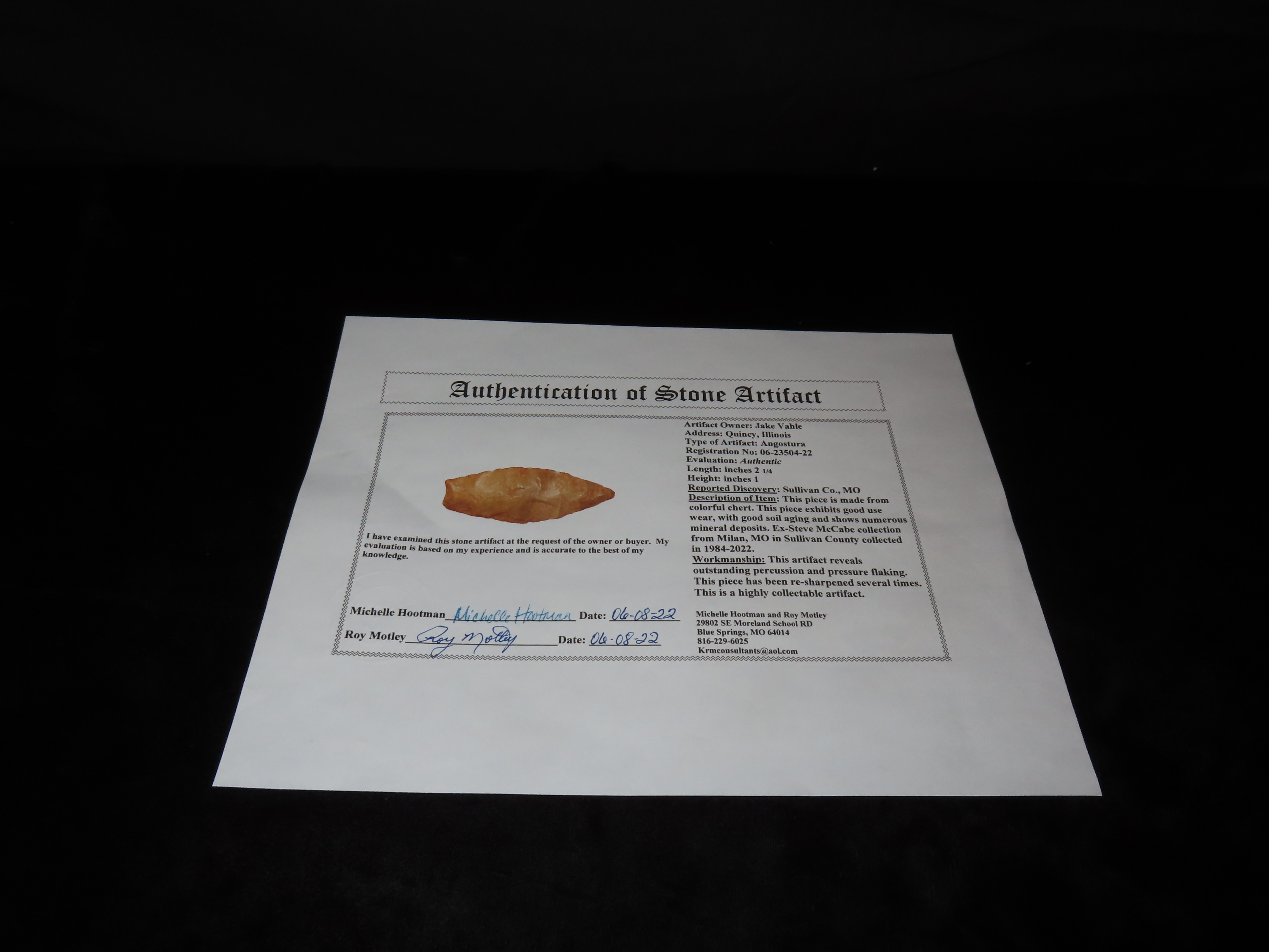 2 1/4″ Angostura, Motley COA, found in Sullivan Co., Missouri, Ex Steve McCabe Collection