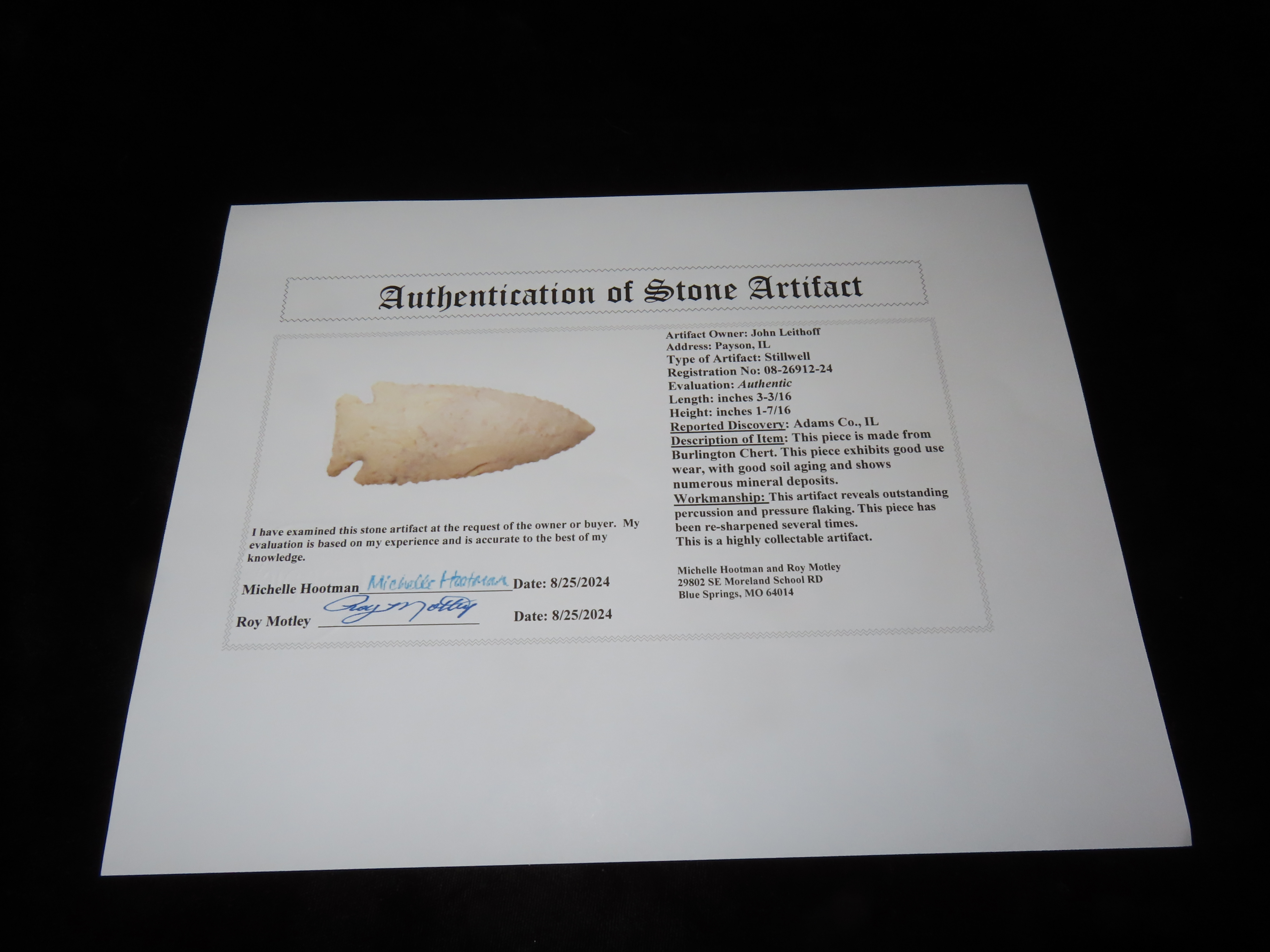 3 3/16″ Stillwell, Motley COA, found in Adams Co., Illinois, Ex John Leithoff Collection