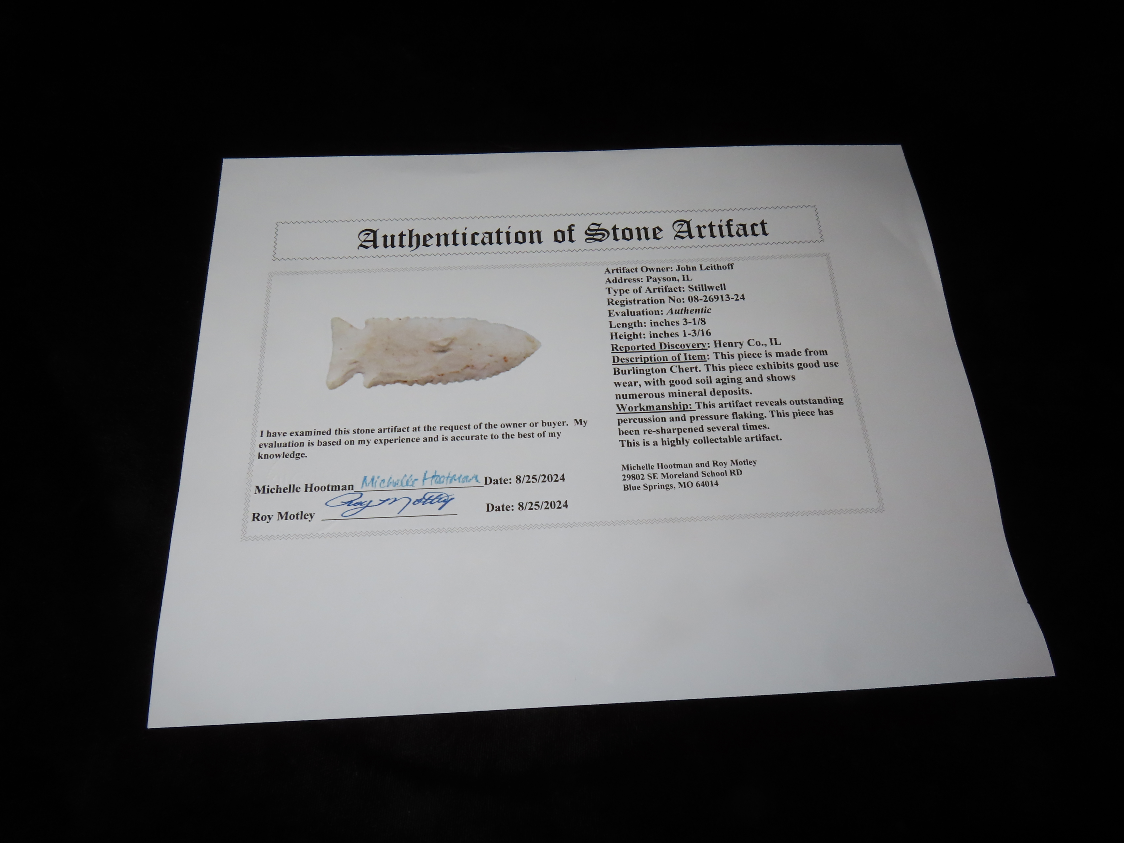 3 1/8″ Stillwell, Motley COA, found in Henry Co., Illinois, Ex John Leithoff Collection
