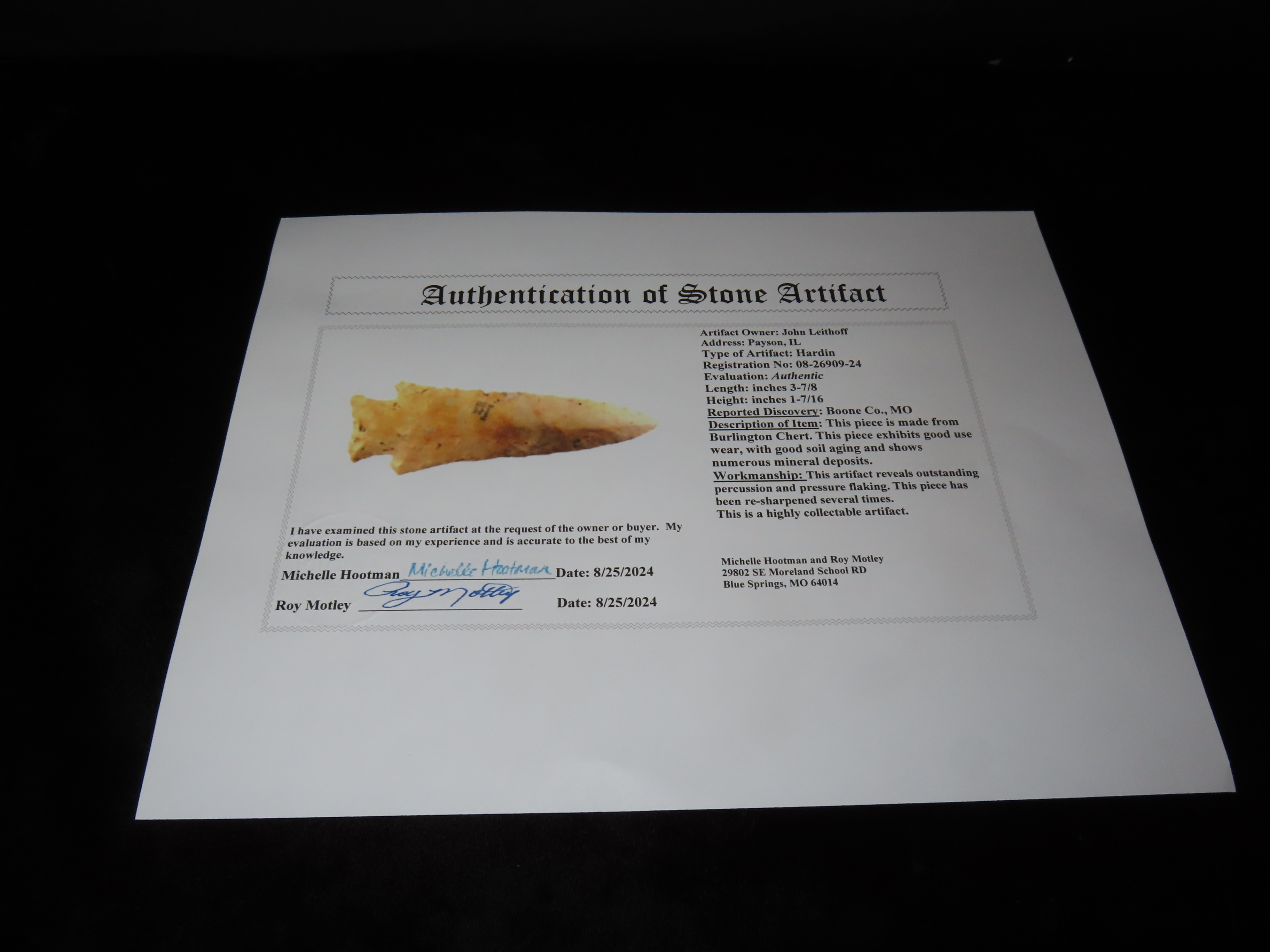 3 7/8″ Hardin, Motley COA, found in Boone Co., Missouri, Ex John Leithoff Collection