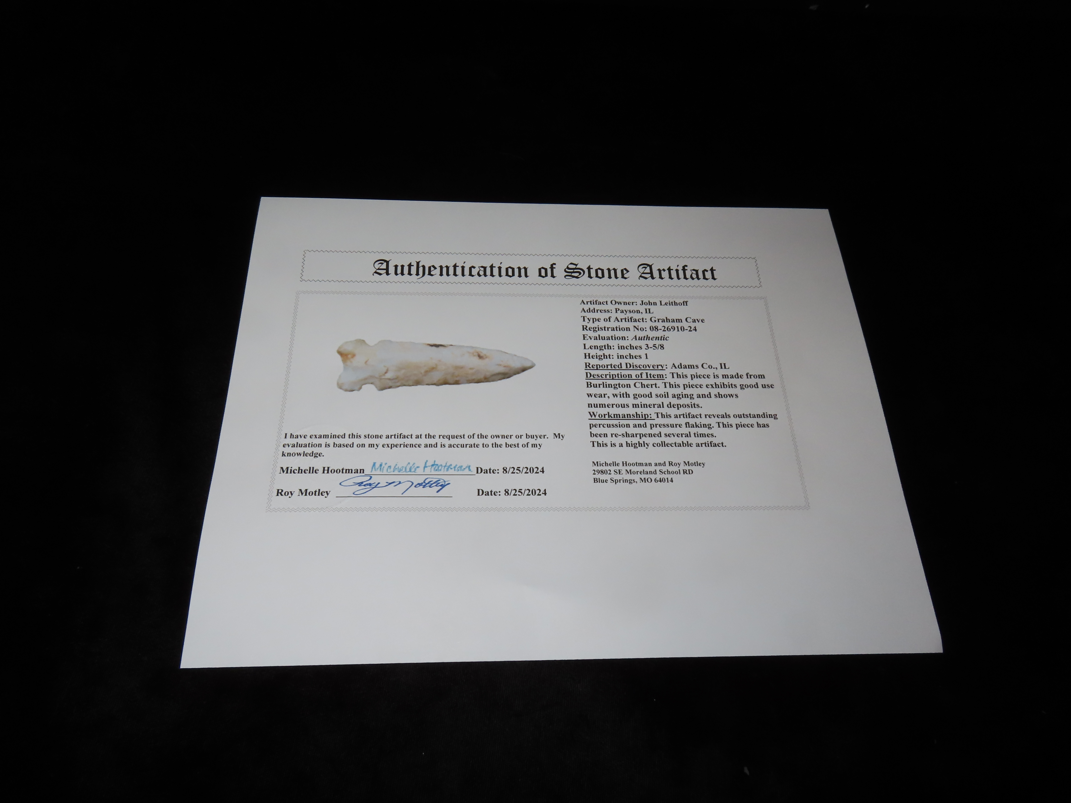 3 5/8″ Graham Cave, Motley COA, found in Adams Co., Illinois, Ex John Leithoff Collection