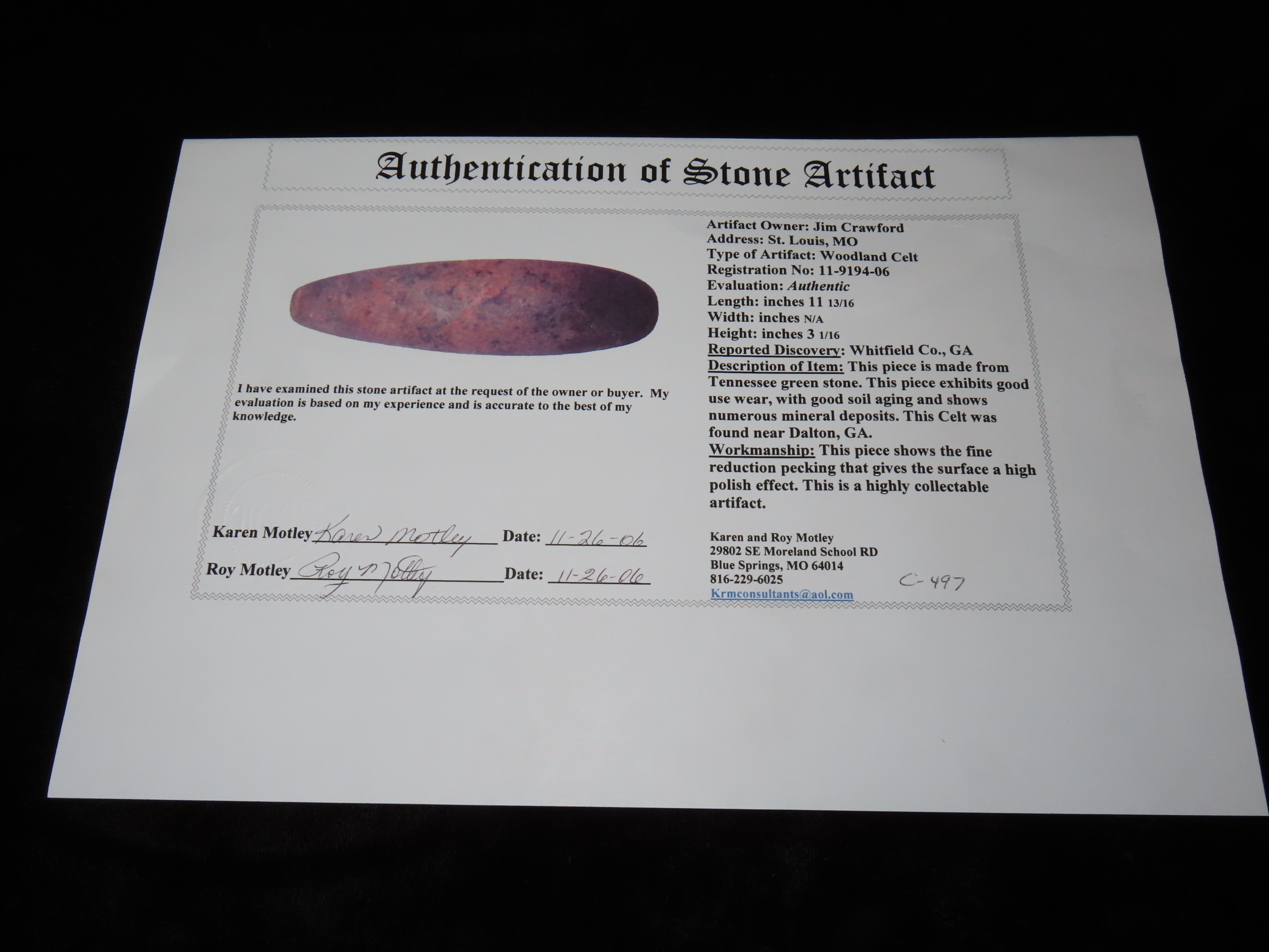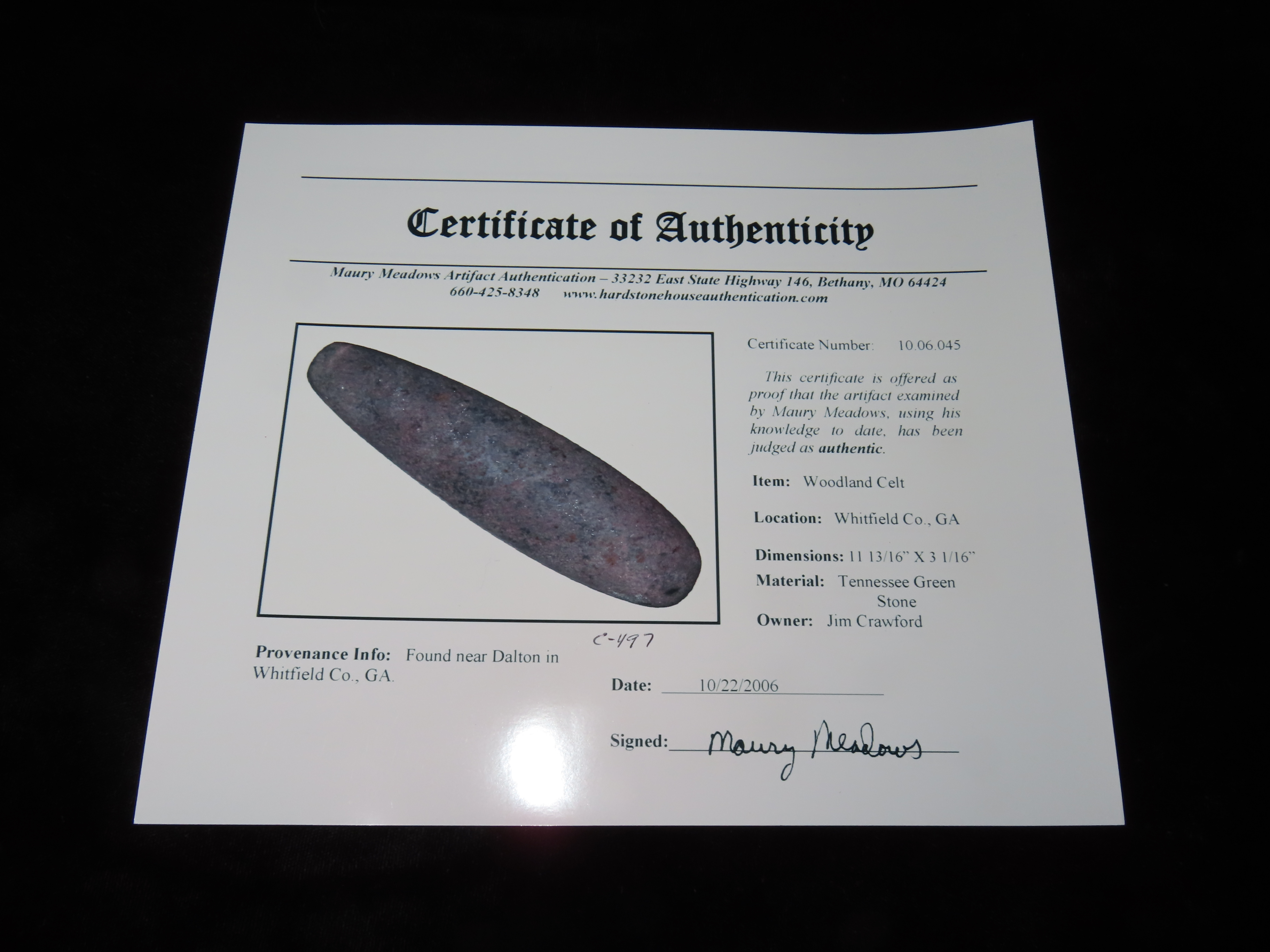 11 13/16″ Woodland Celt, 2xCOA-Meadows/Motley, found in Whitfield Co., Georgia near Dalton, Ex Jim Crawford, Ex John Leithoff Collection