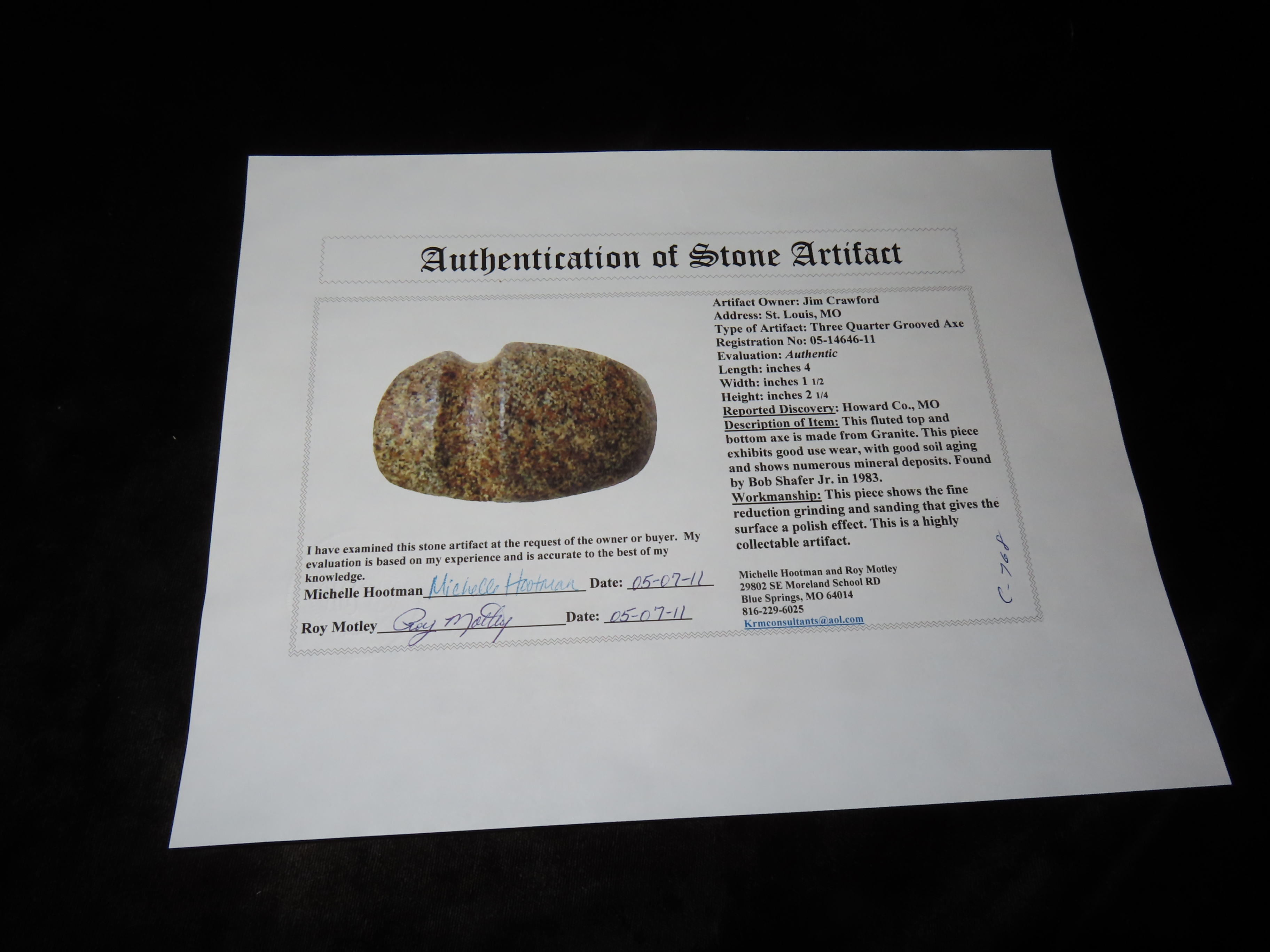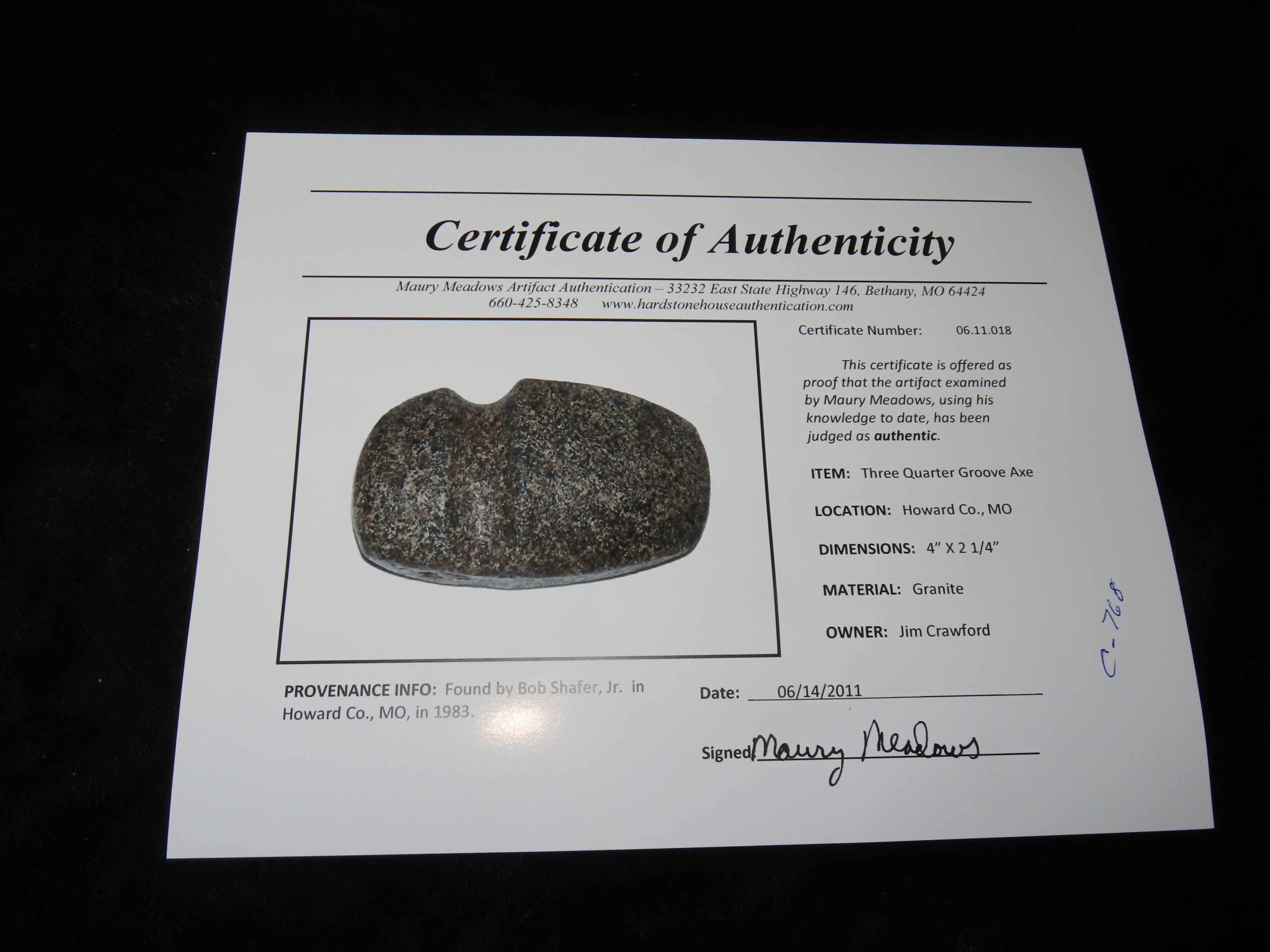 4″ 3/4-Groove Axe, 2xCOA- Meadows/Motley, found in Howard Co., Missouri by Bob Shafer Jr. in 1983, Ex Jim Crawford, Ex John Leithoff Collection