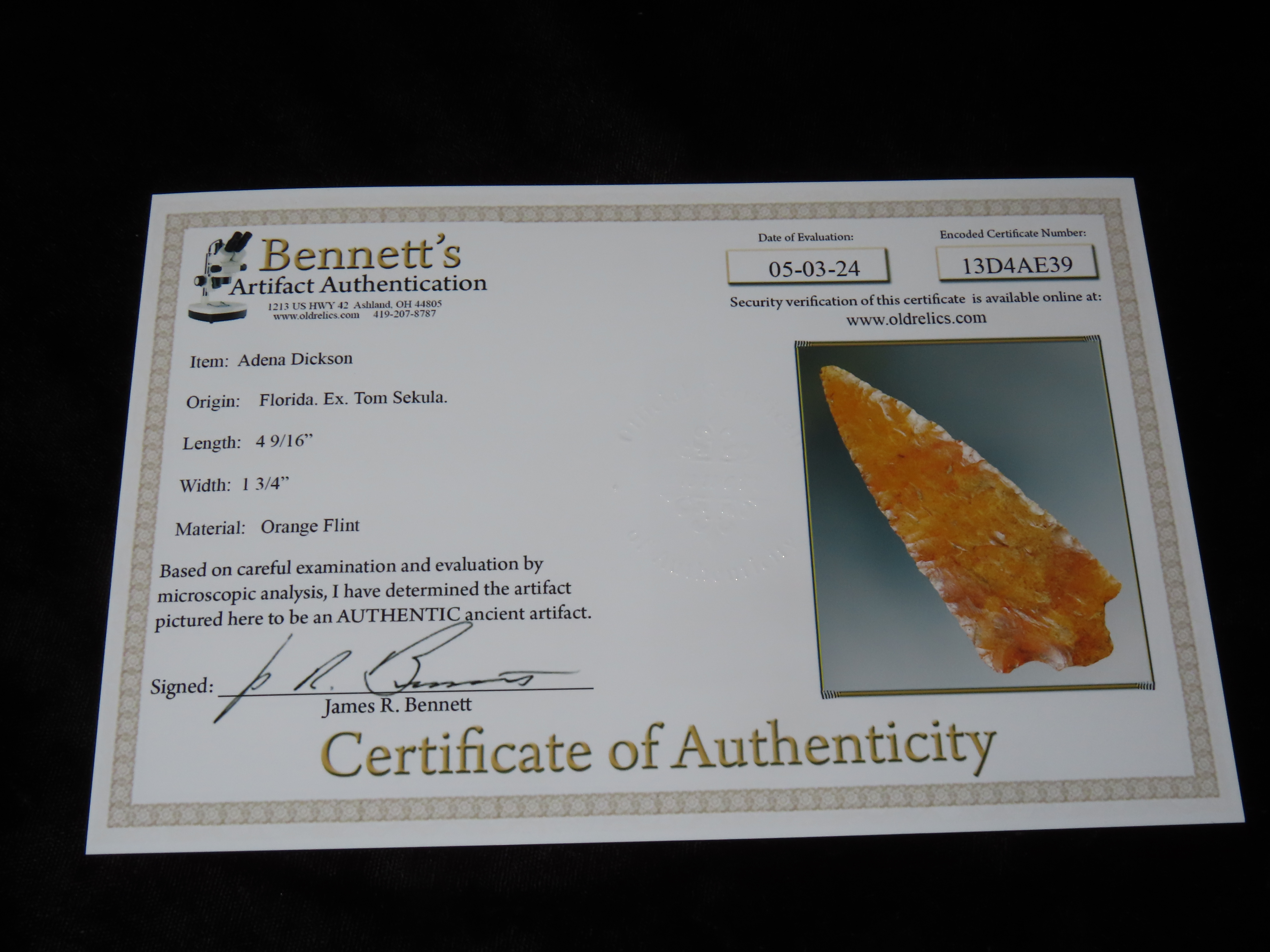 4 9/16″ Adena-Dickson, 2xCOA-Bennett/Howard, found in Florida, Ex Tom Sekula, Ex Duane Schneider Collection