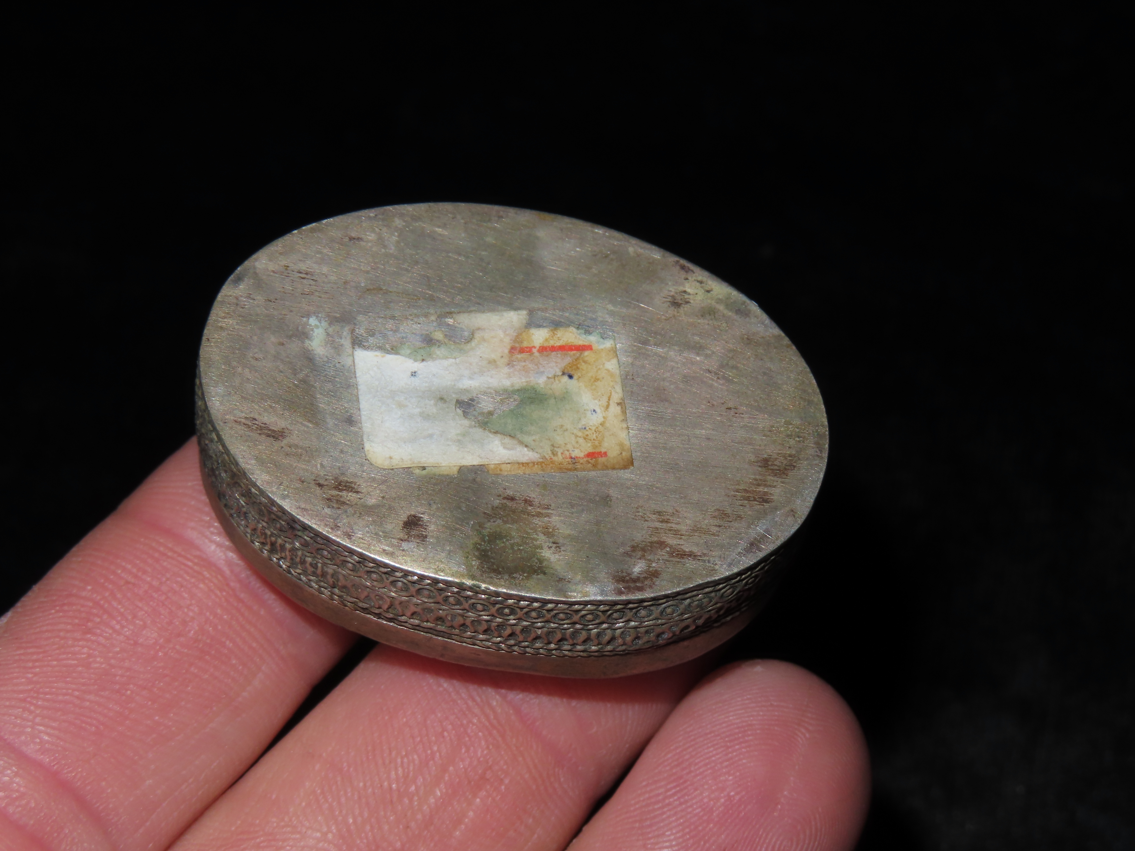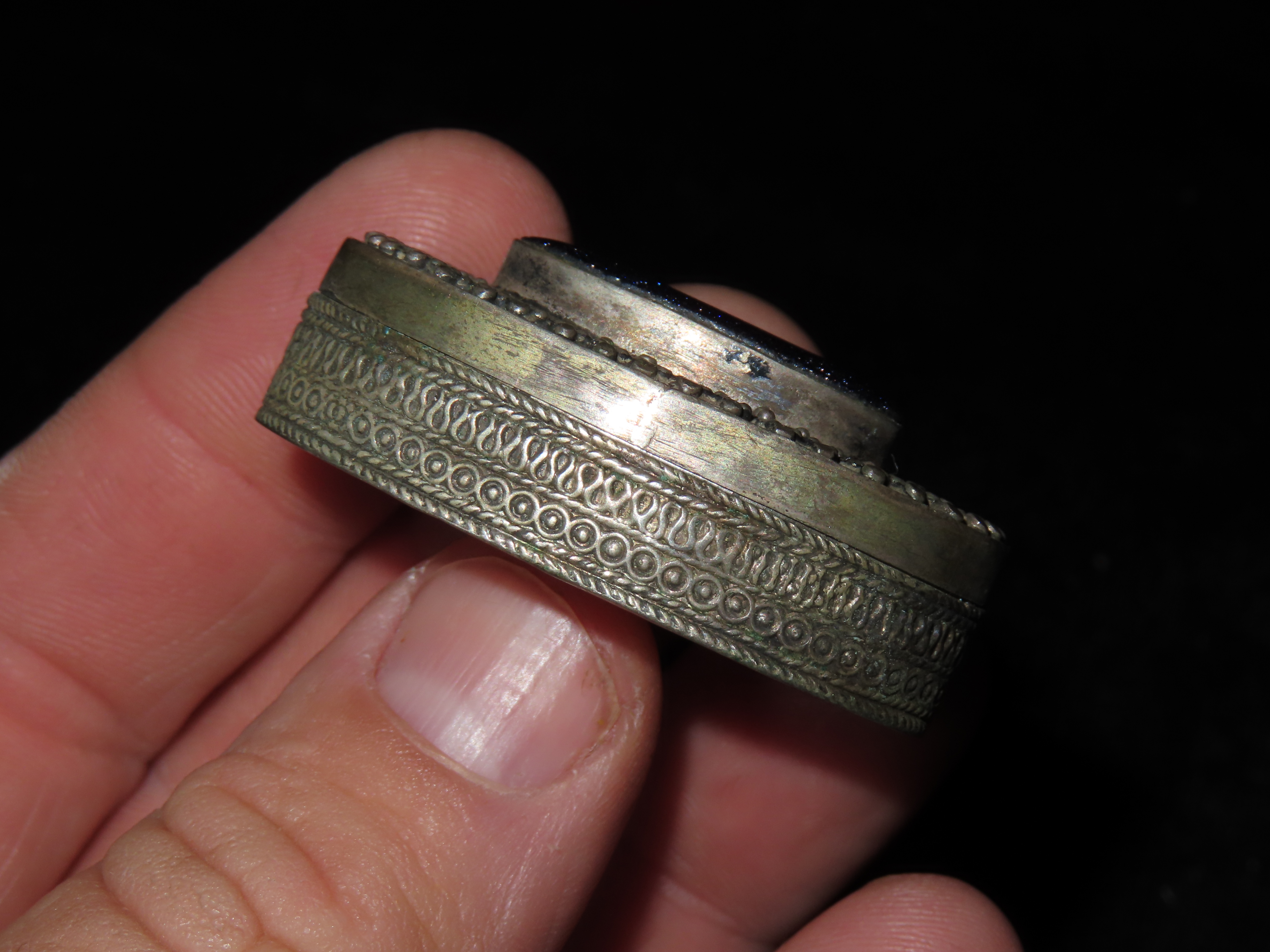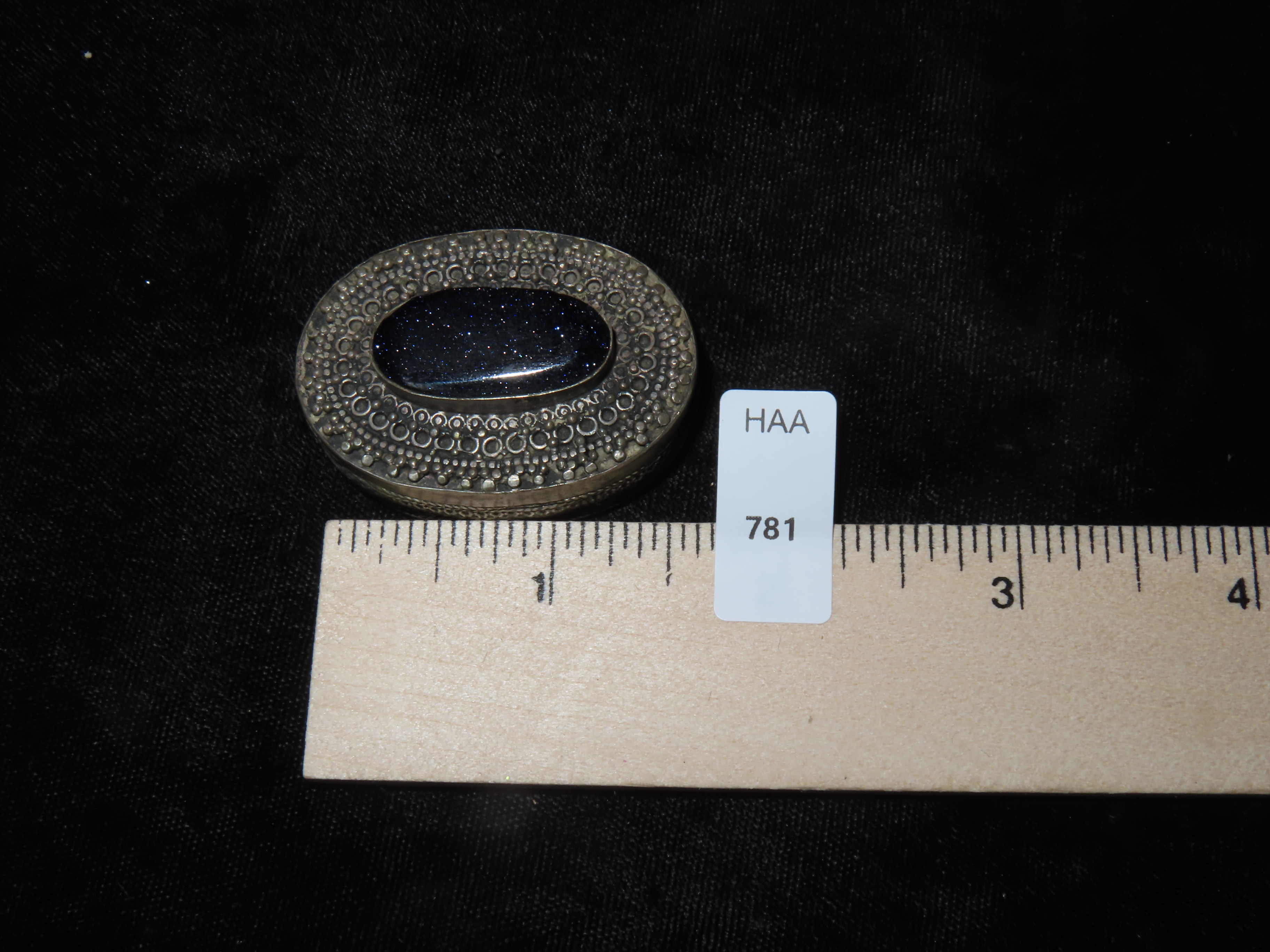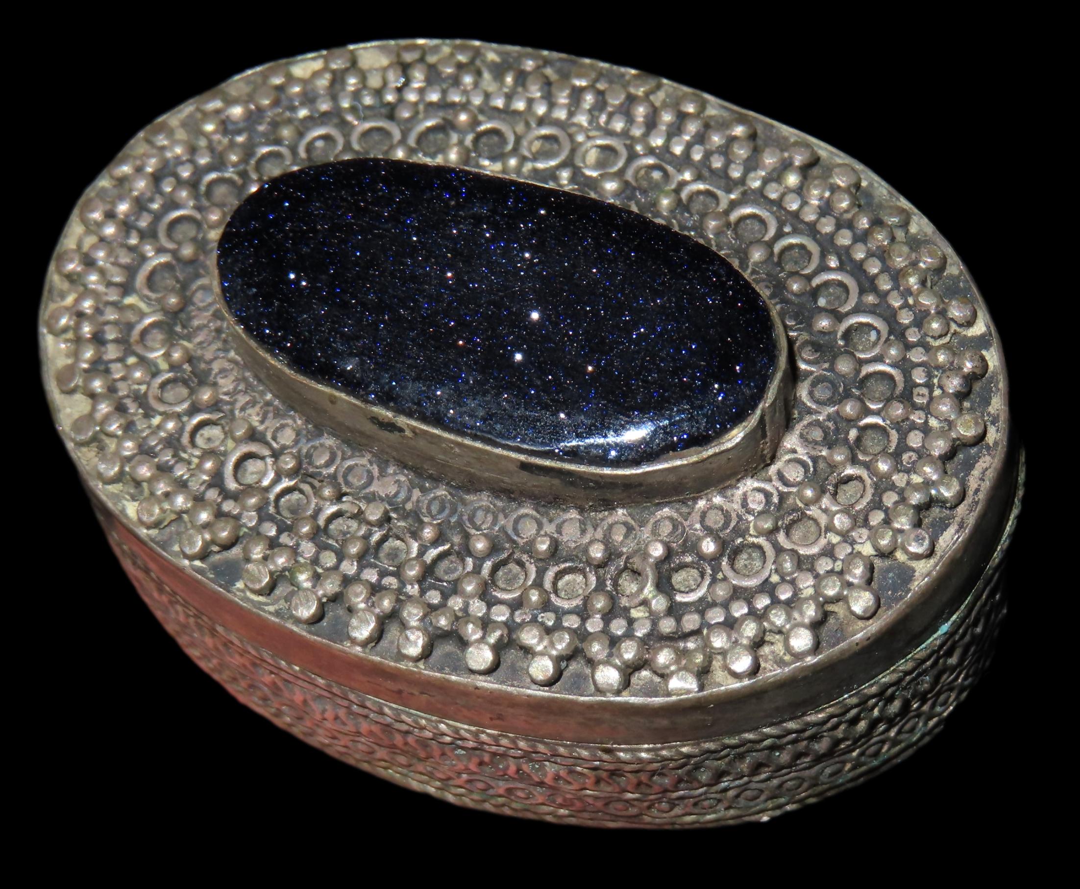 1 3/4″ Vintage Ornate Tin Snuff Box, Blue Sunstone Inlay on Lid, Ex Johnathan Johns Collection