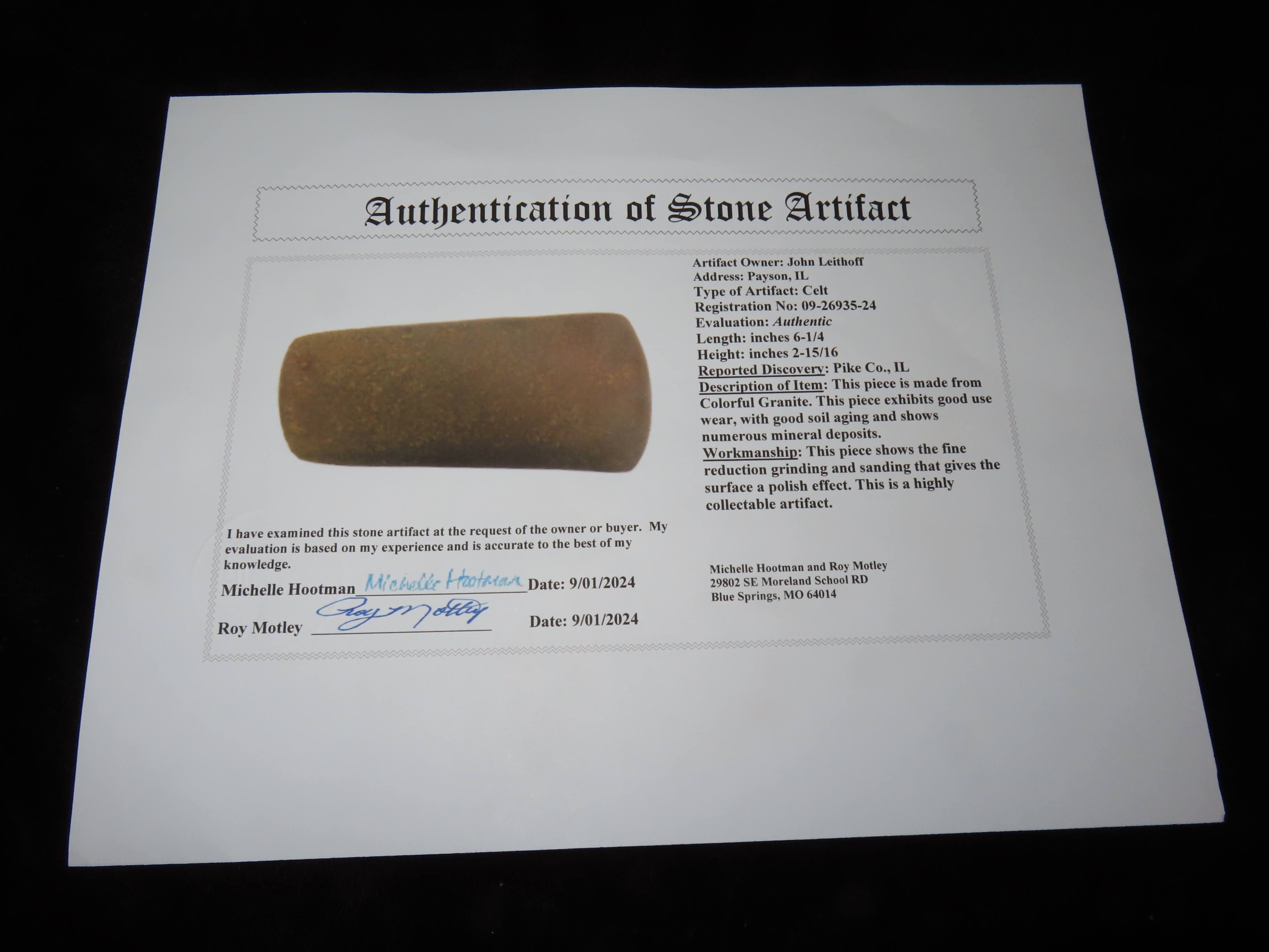 6 1/4″ Celt, Motley COA, found in Pike Co., Illinois, Ex John Leithoff Collection