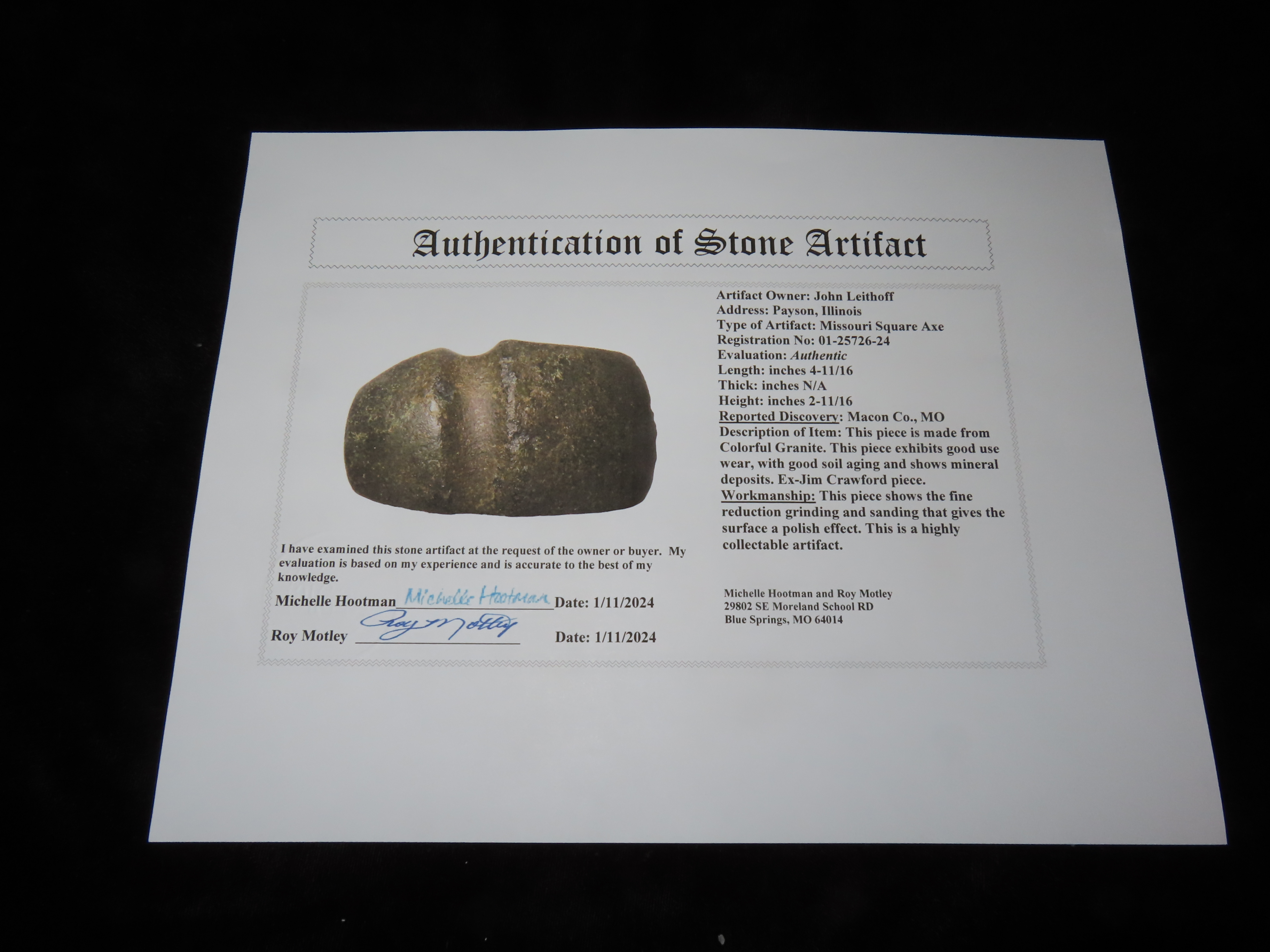 4 5/8″ 3/4-Groove Axe, 2xCOA-Meadows/Motley, found in Macon Co., Missouri, Ex Jim Crawford, Ex John Leithoff Collection