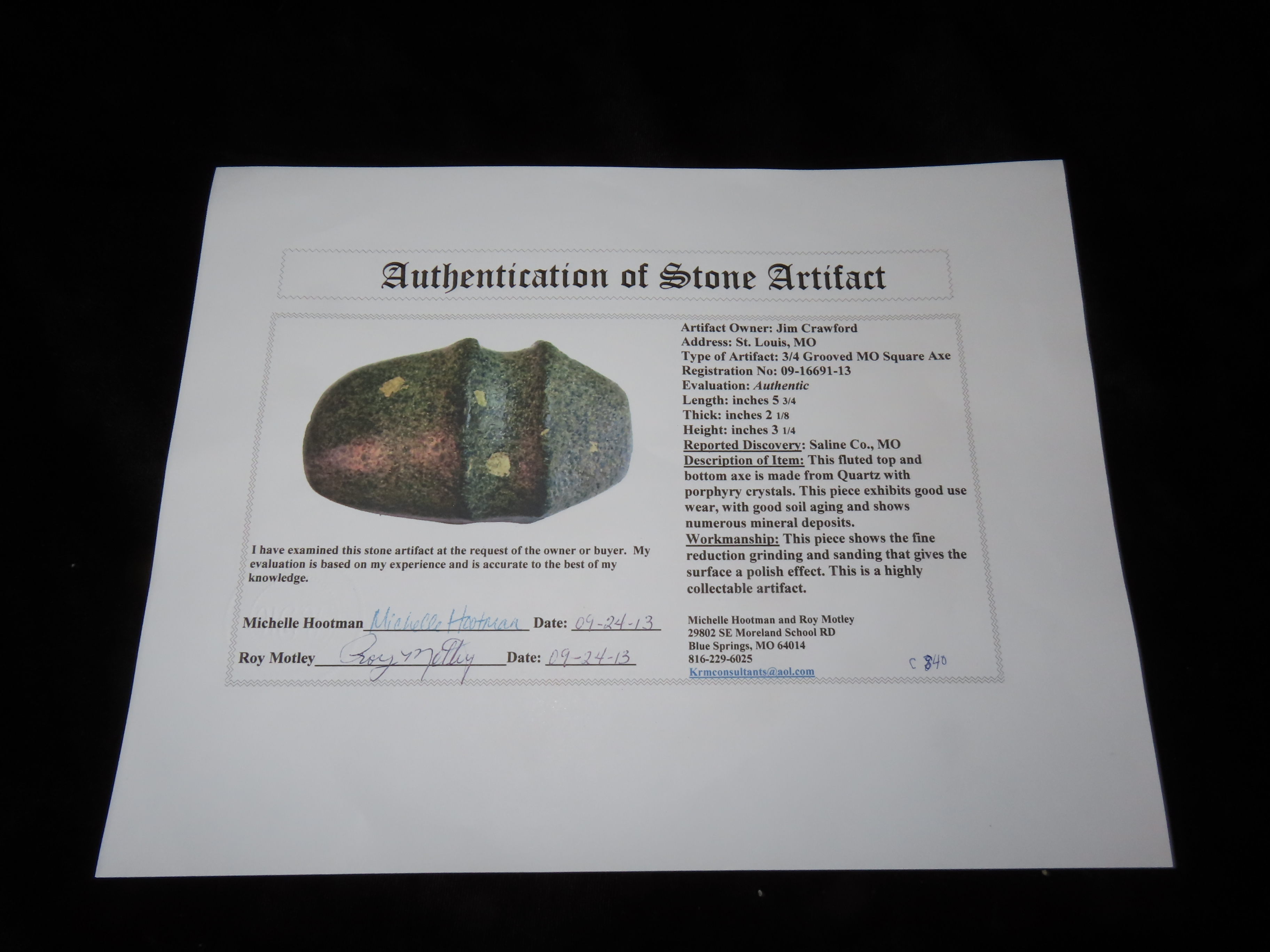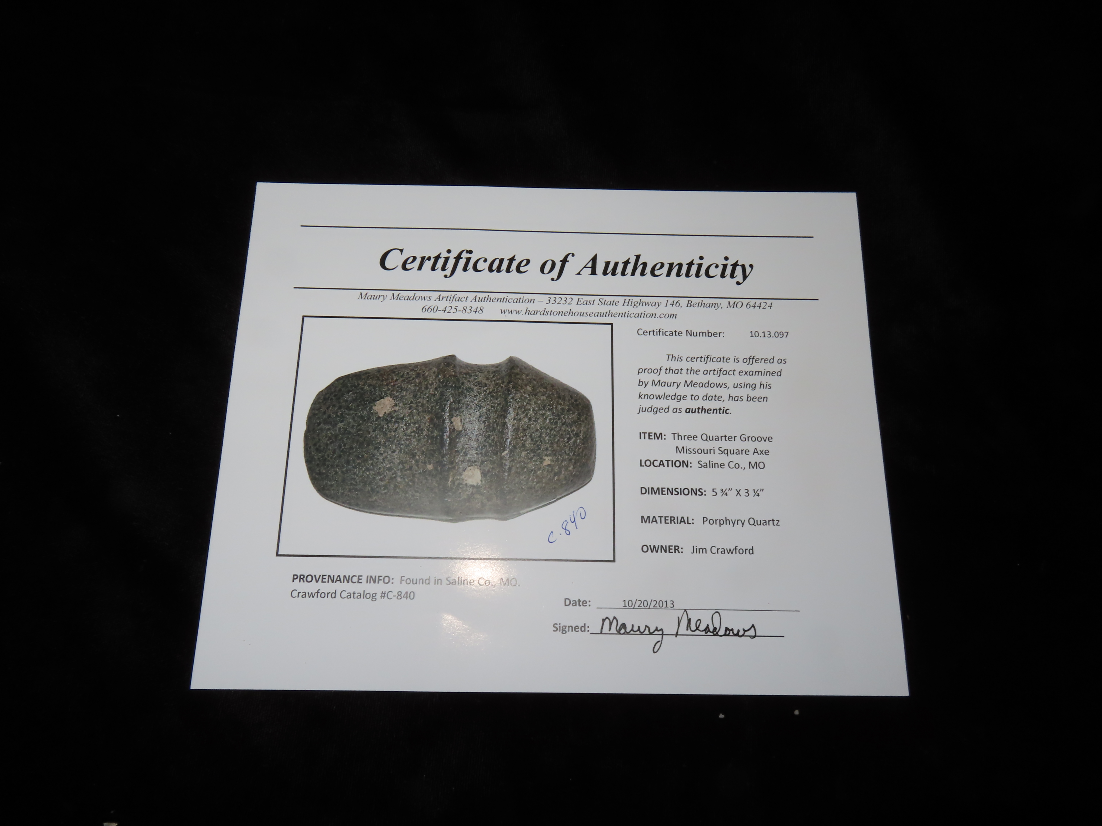 5 3/4″ 3/4-Groove Axe, 2xCOA-Meadows/Motley, found in Saline Co., Missouri, Ex Jim Crawford, Ex John Leithoff Collection