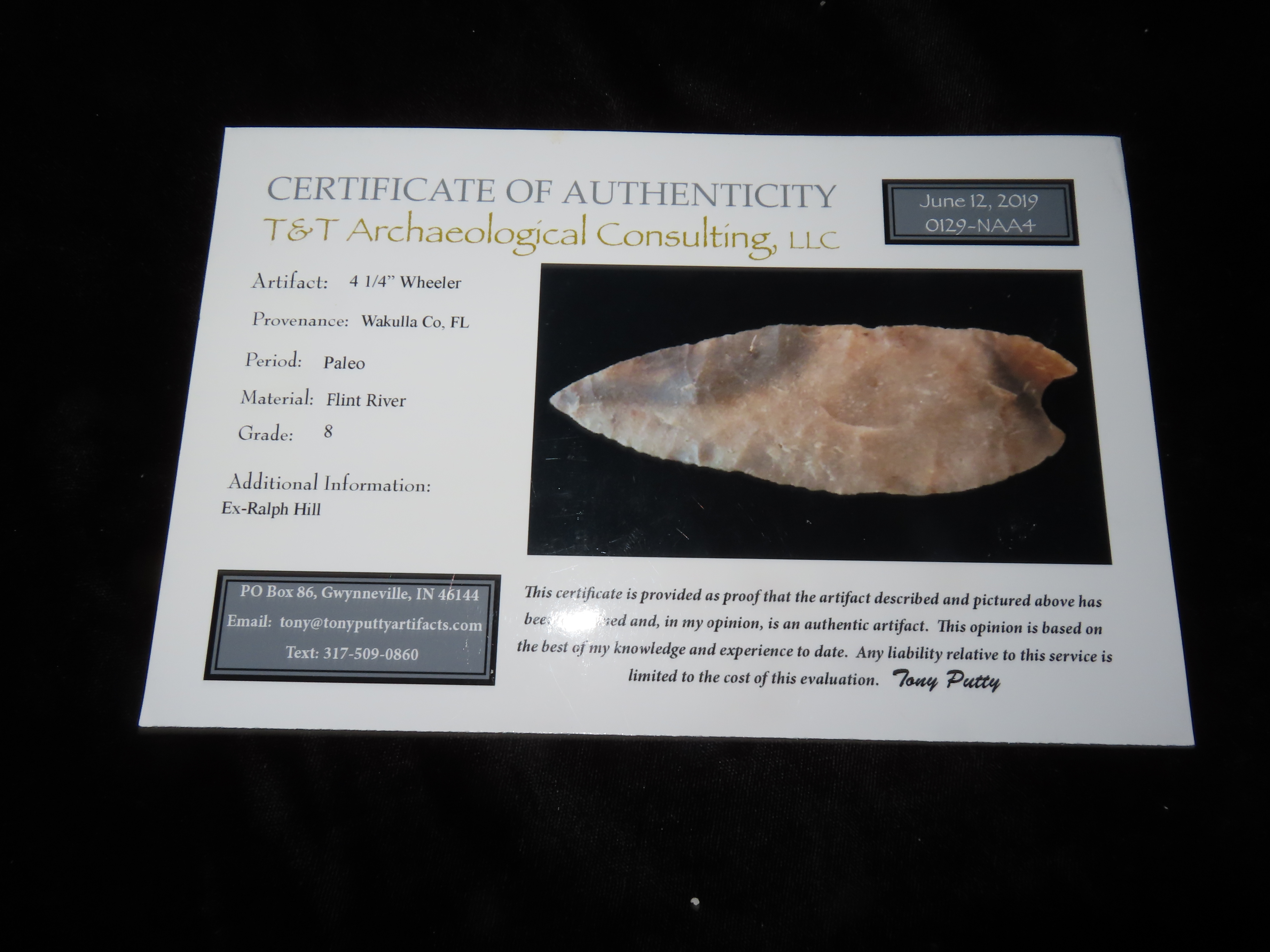 4 1/4″ RARE Wheeler Knife, 2xCOA-Rogers/Putty, found in Wakula Co., Florida, Great Color!, Ex Ralph Hill, Ex Al Kennedy, Ex Duane Schneider Collection