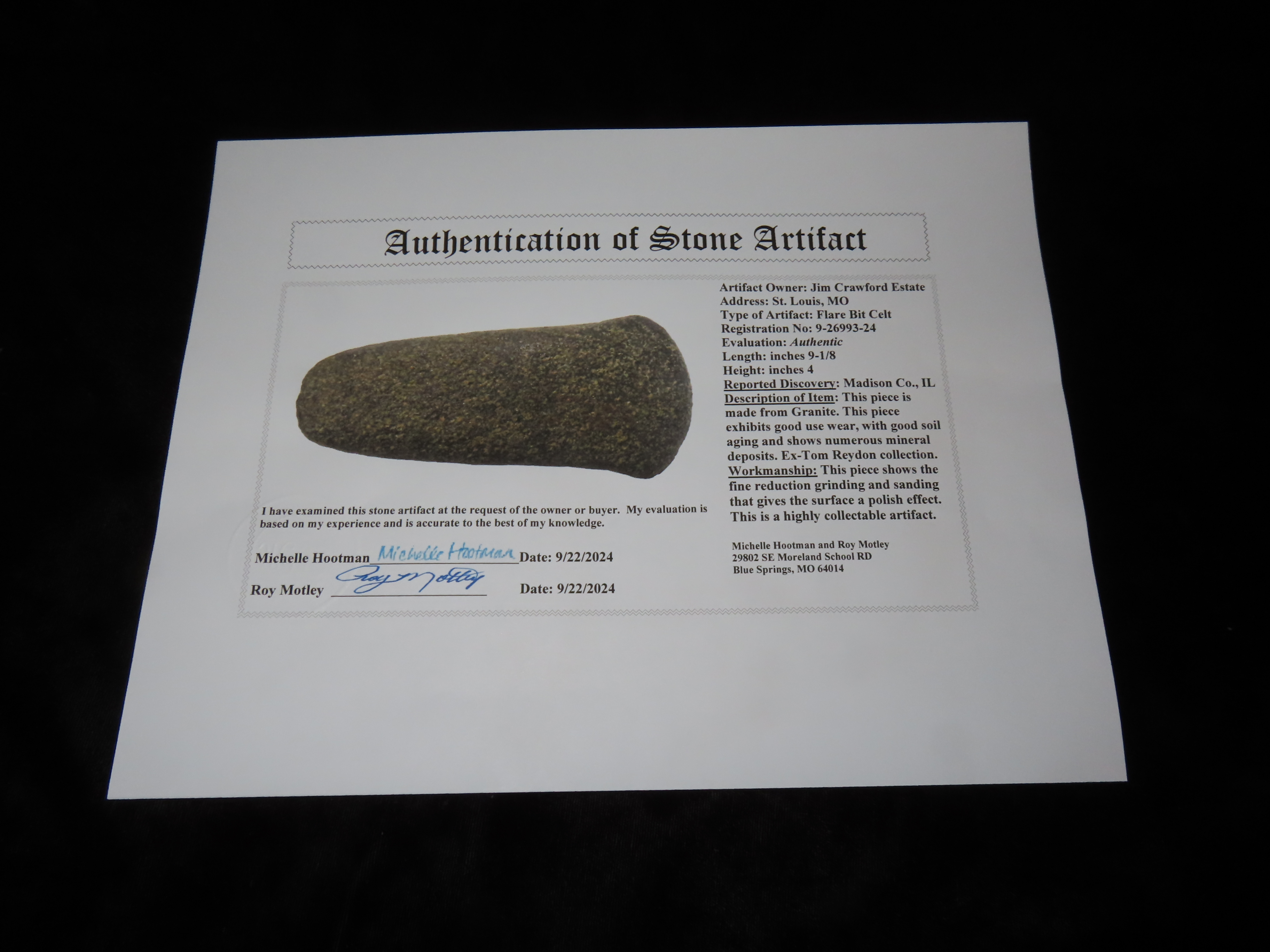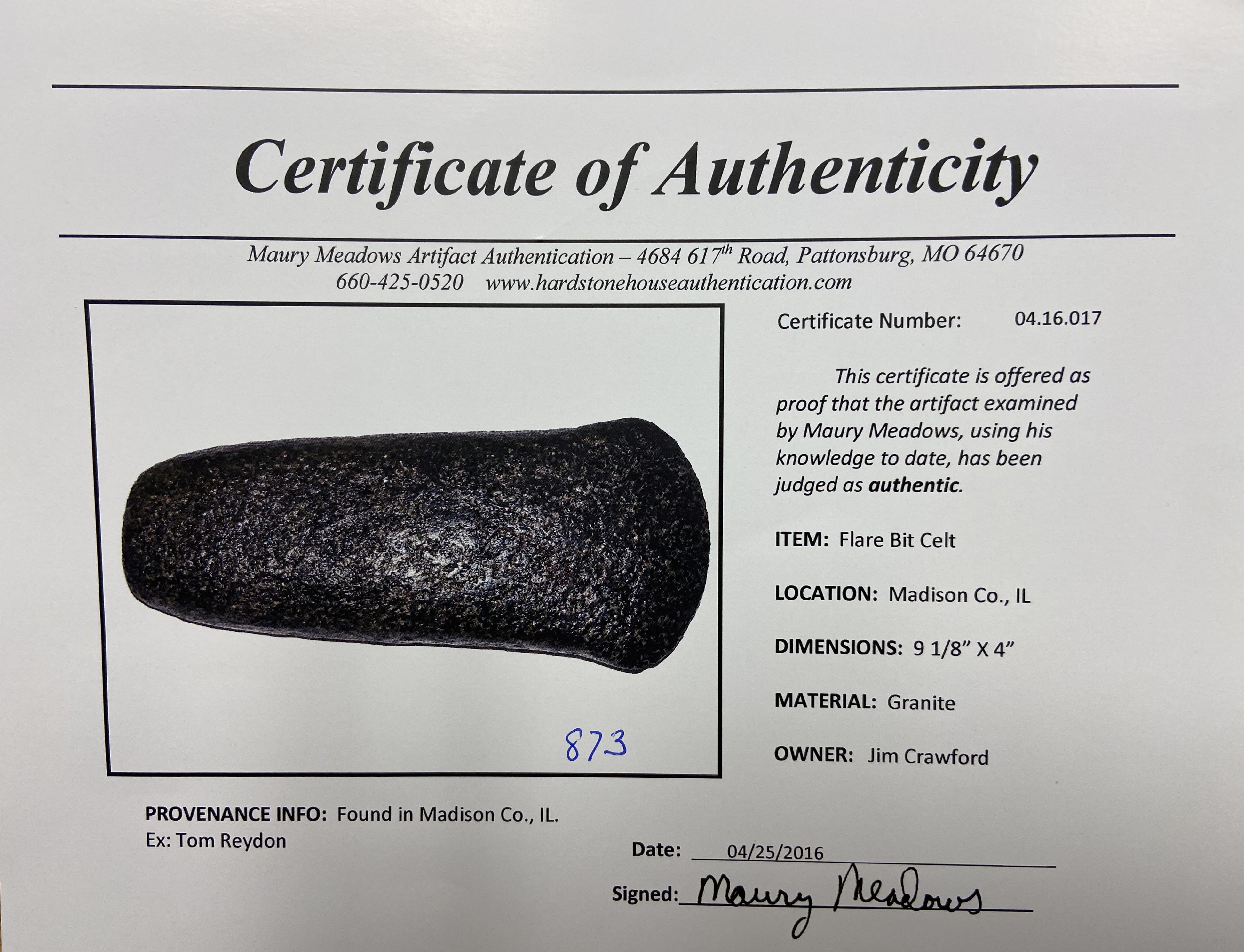 9 1/8″ Flare-Bit Celt, 2xCOA-Meadows/Motley, found in Madison Co., Illinois, Ex Tom Reydon, Ex Jim Crawford Estate, Ex John Leithoff Collection