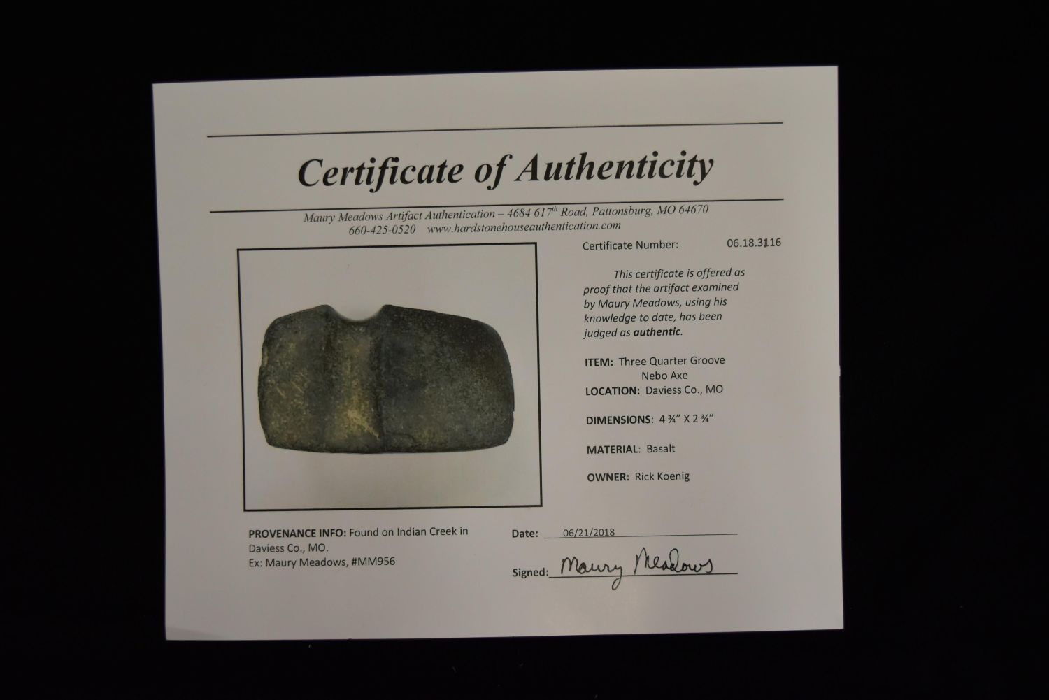 4 3/4" 3/4 Groove Nebo Axe, Meadows COA, Daviess Co, Missouri Condition: 100% Guaranteed Authentic via our Return Policy & Found on Private Property