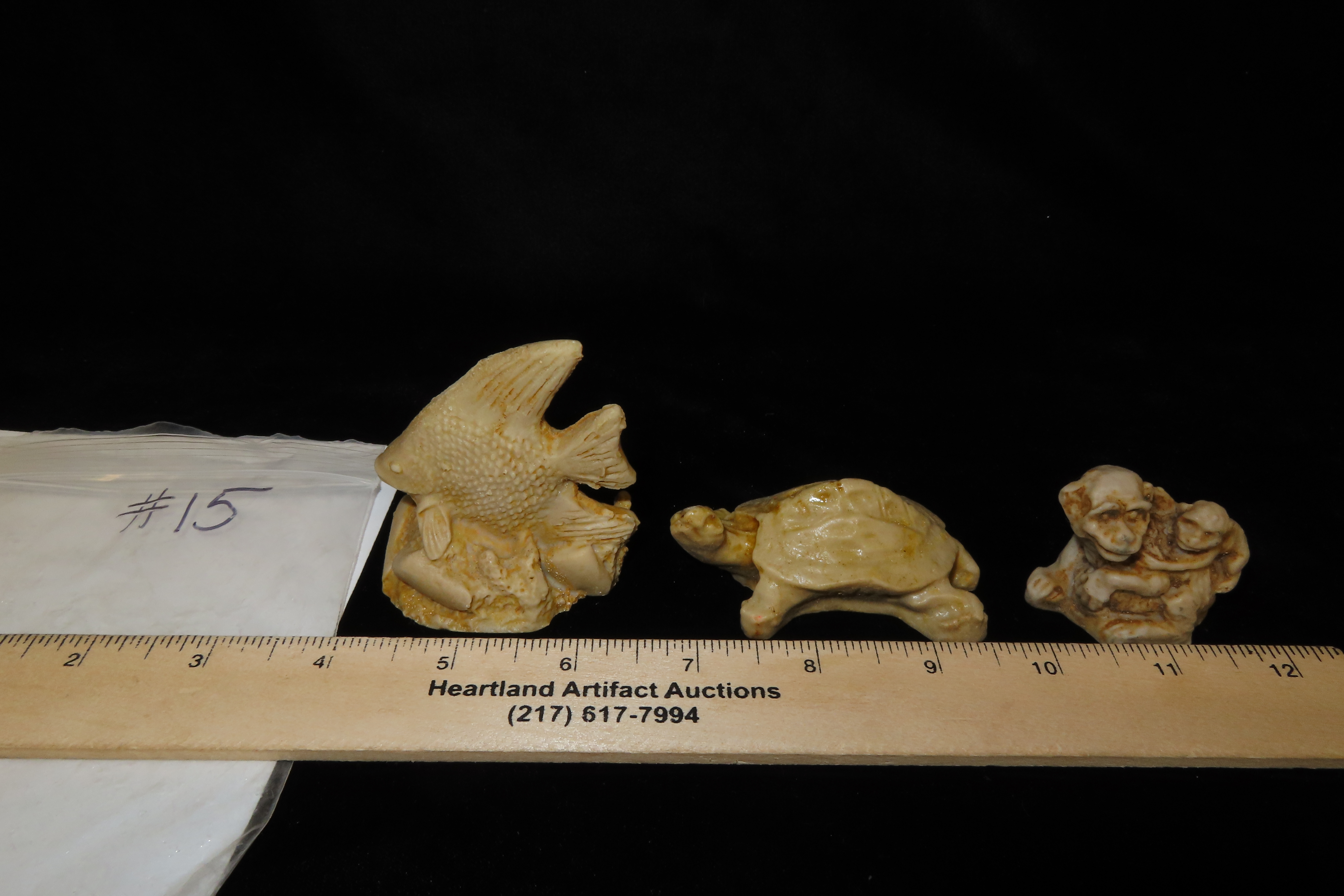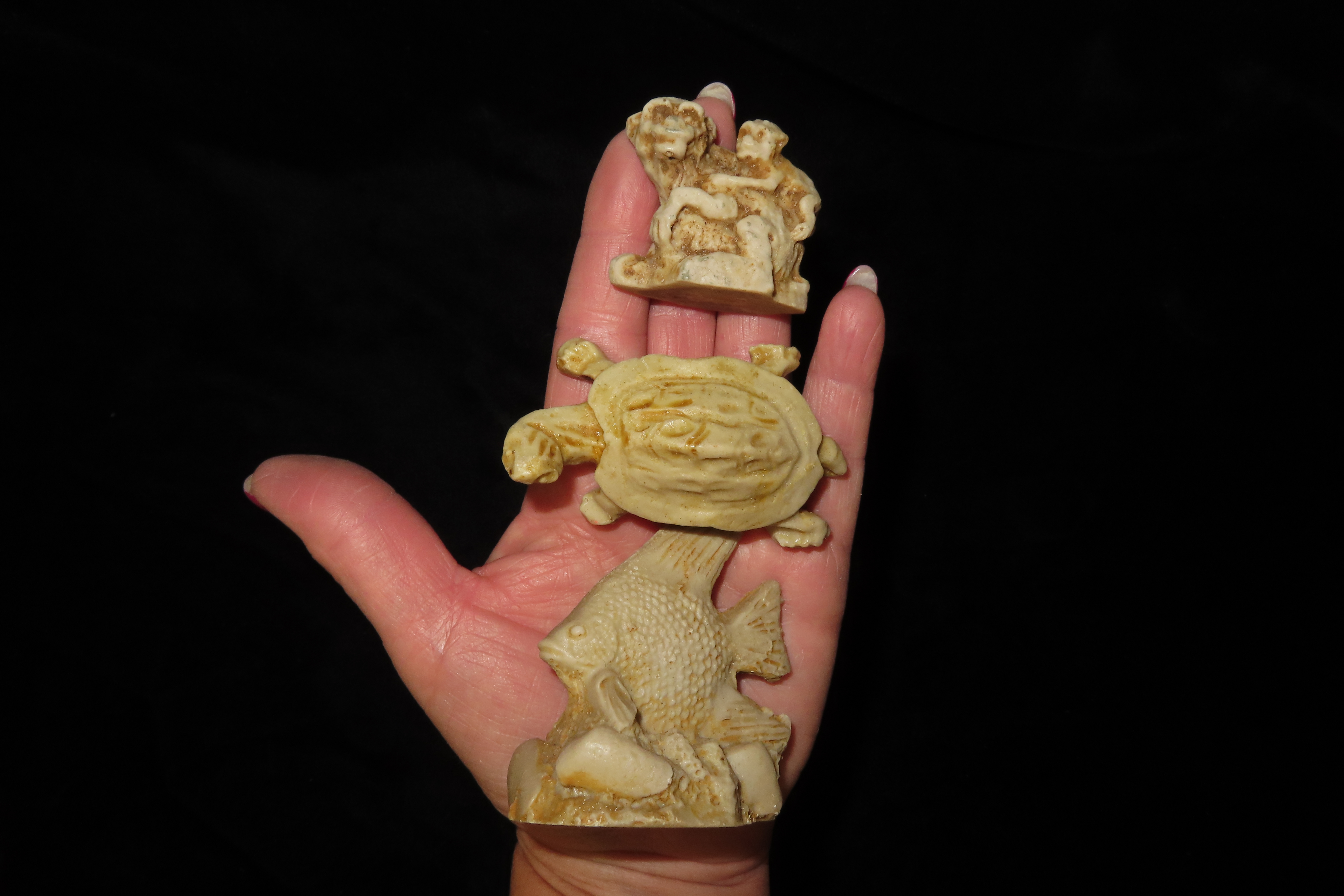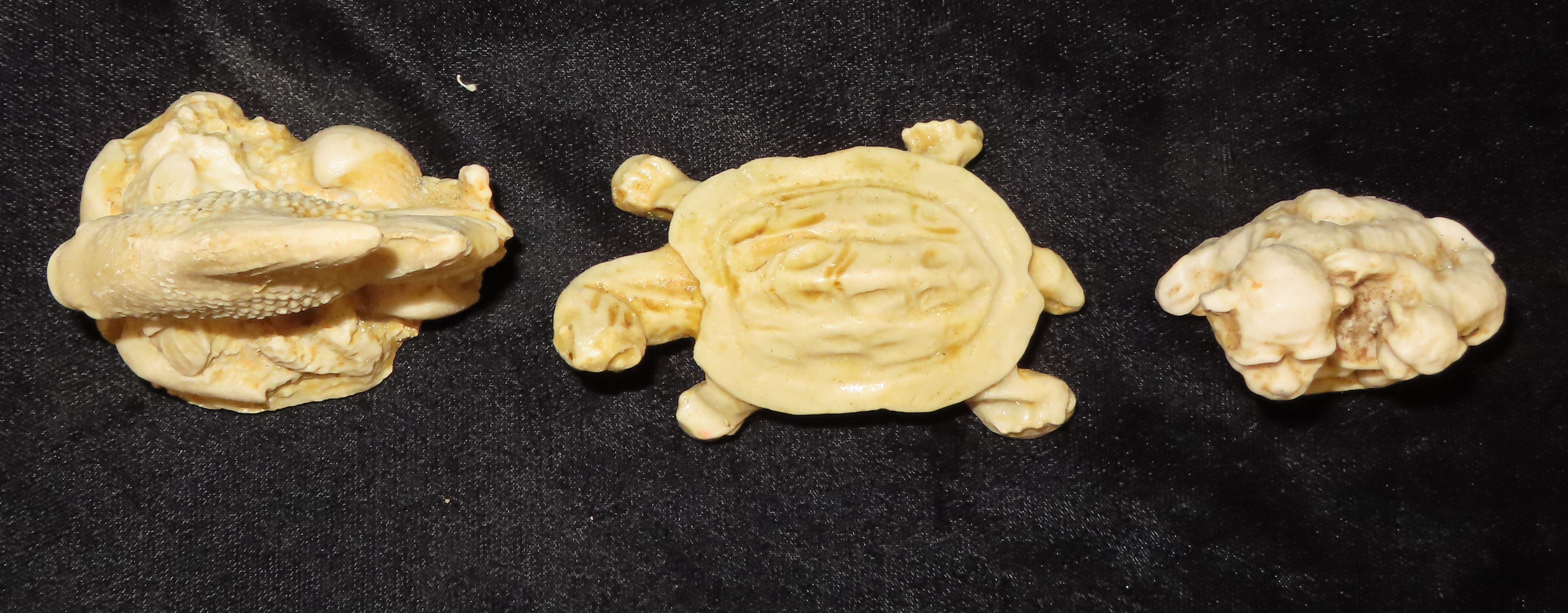 Group of 3 molded bone figurines. Largest is 2 1/2″.Auctioning as Authentic & Unaltered