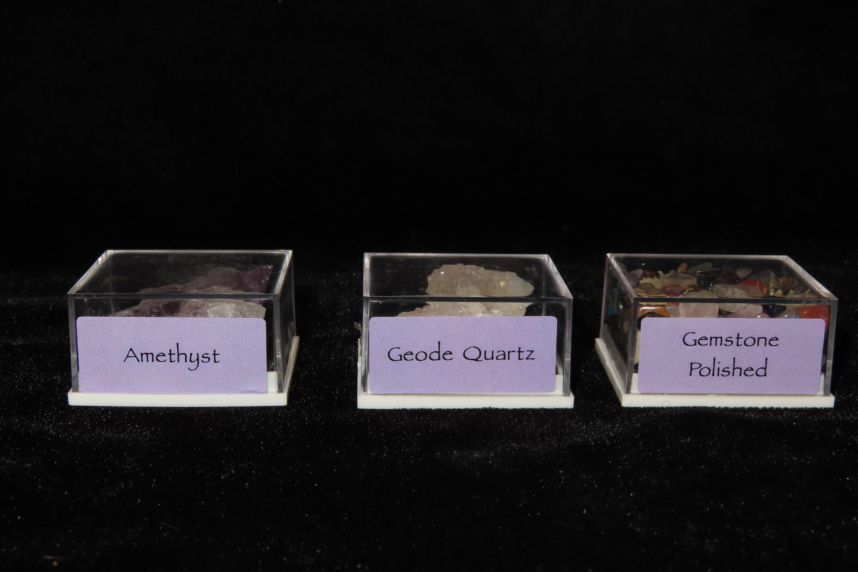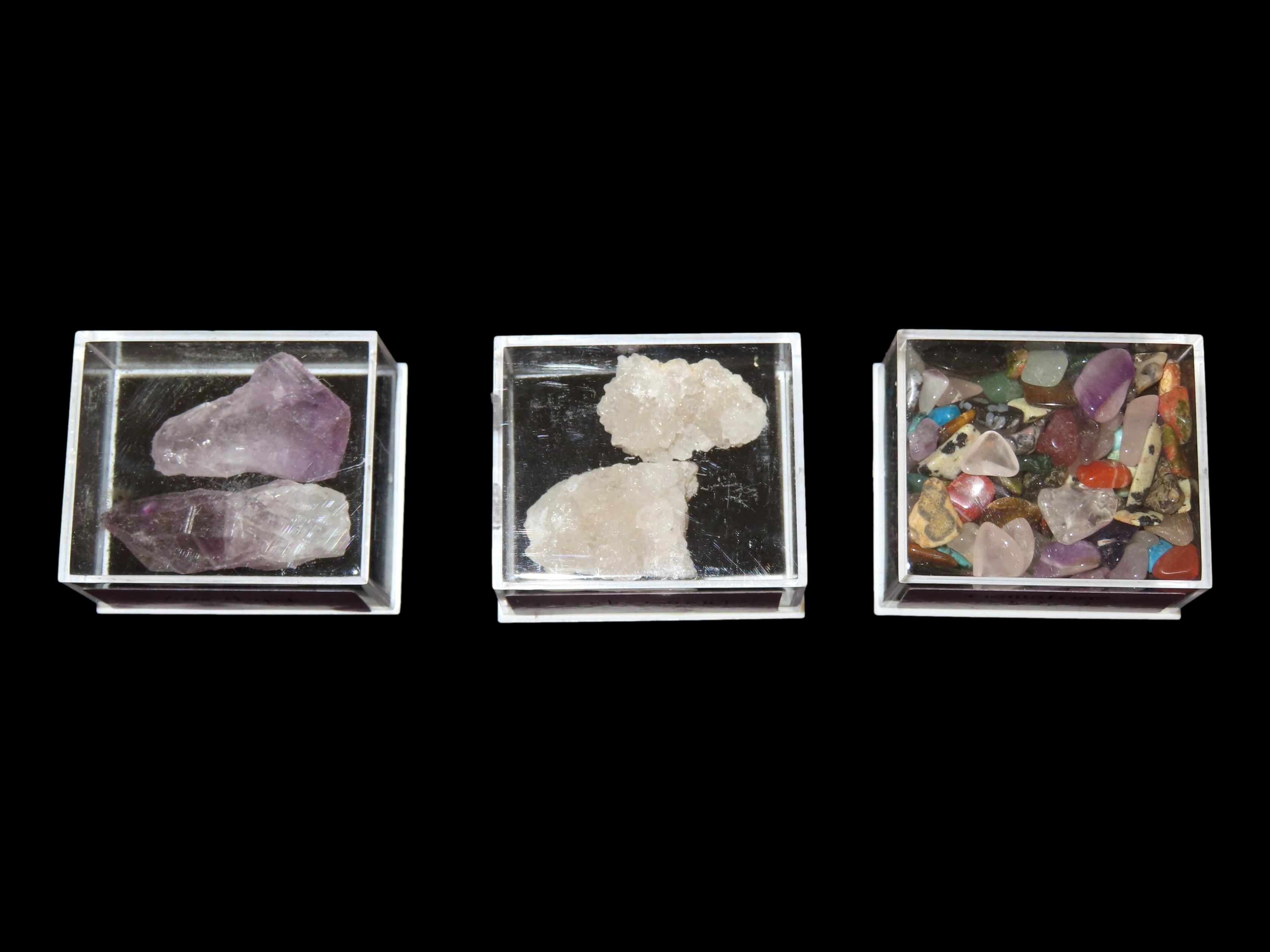 Group of 3 mineral boxes. Amethyst, Quartz & Polished Gemstone Tumbles. 1 1/2″.Auctioning as Authentic & Unaltered
