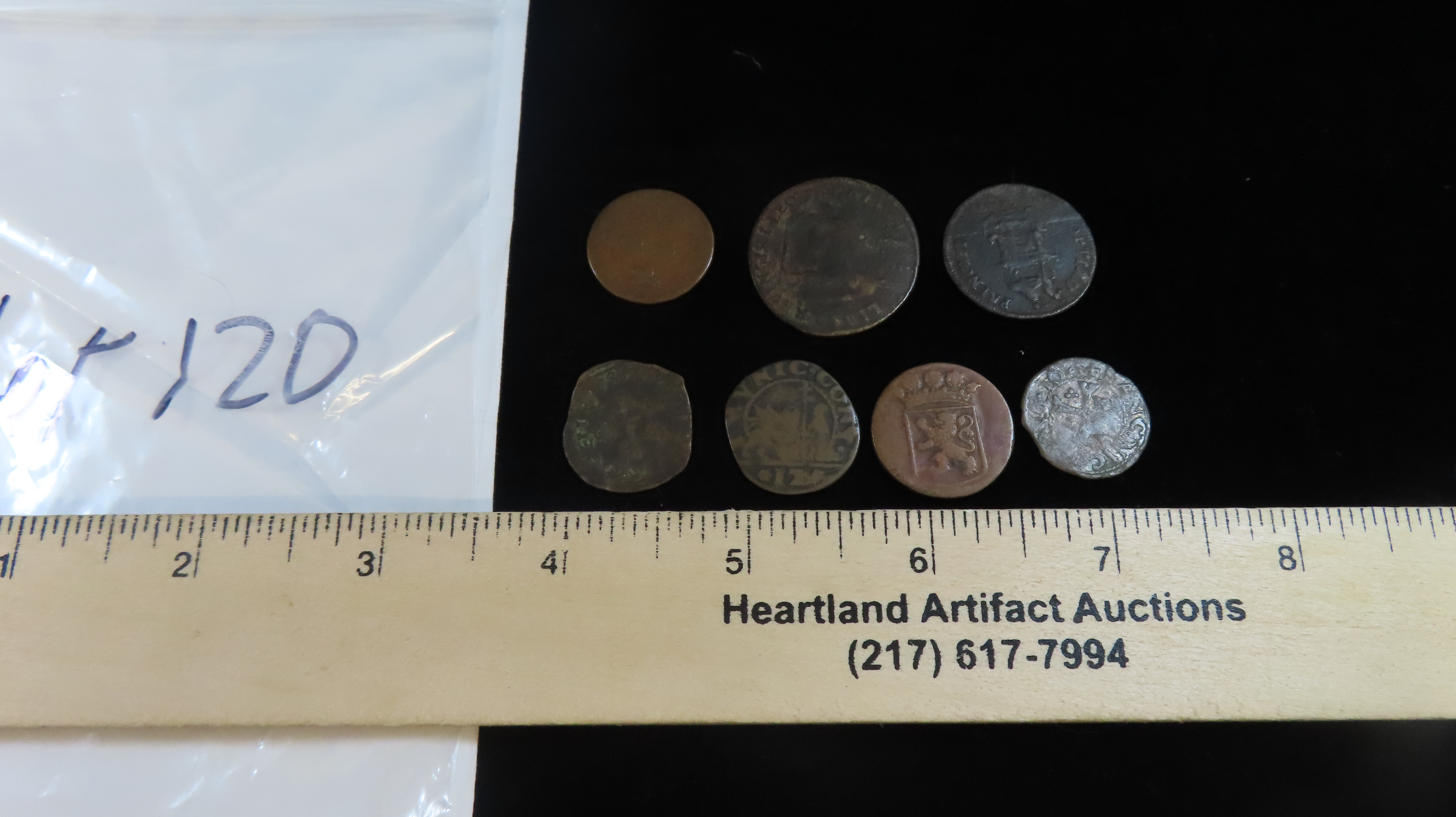 Lot of 7 Coins, Poland 1 solid 1660-1668, Mexico 1/8 real 1858-1862, Dutch Republic 1 gulden 1703-1794, Netherlands East Indies 1 duit 1726-1804, Venice 12 bagattini 1675, Bohemia 1 kreuzer 1624-1627, France Double tournois 1627-1635.
