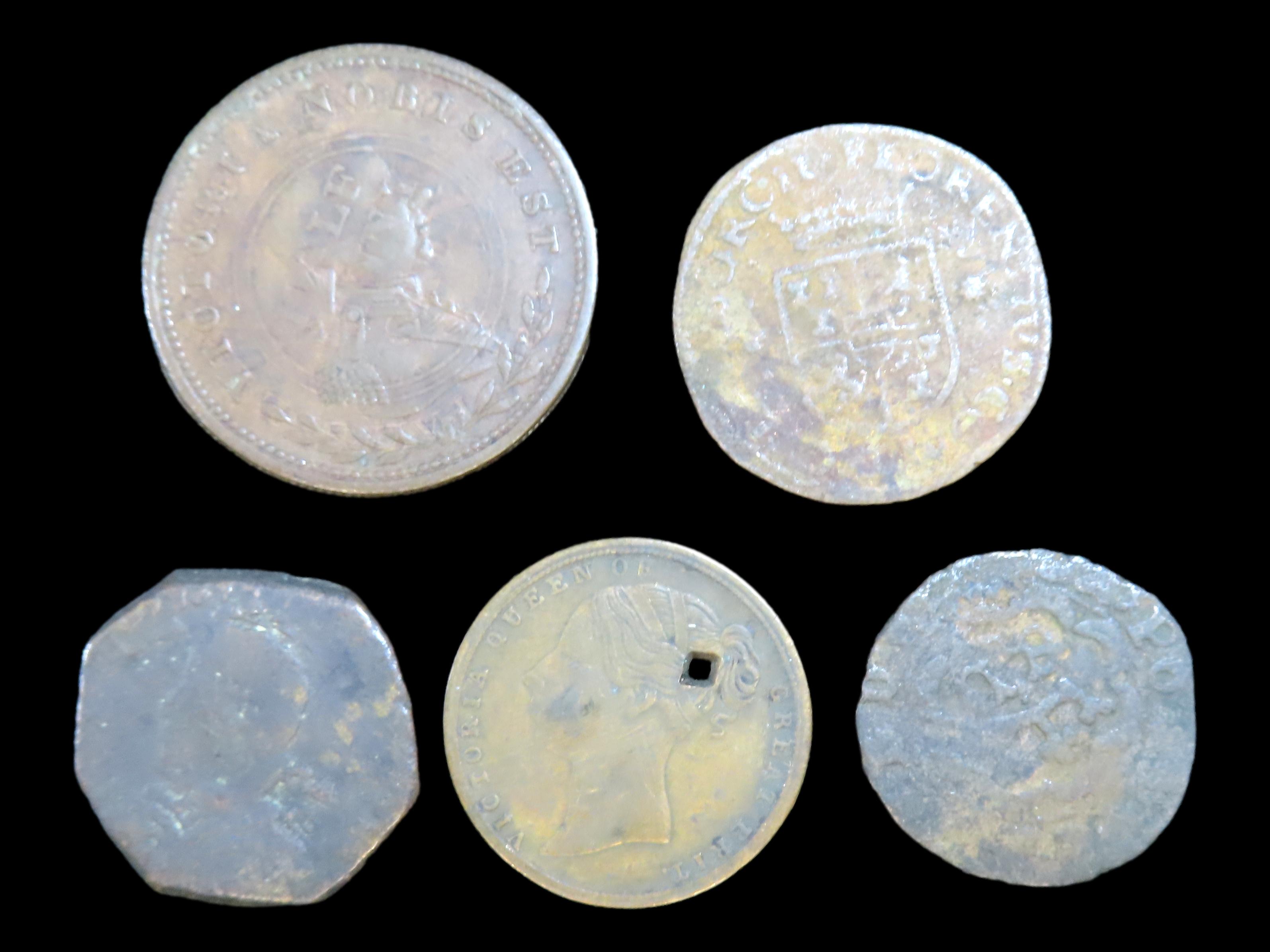 Lot of 5 Coins, Naples 1 tornese 1630-1638, United Kingdom 1/2 penny 1806-1807, Livonia 3 polker 1622-1635, United Kingdom 1 farthing 1838-1859, Portugal 1 real preto, “EDVARDVS REX PORT” on obverse 1433.