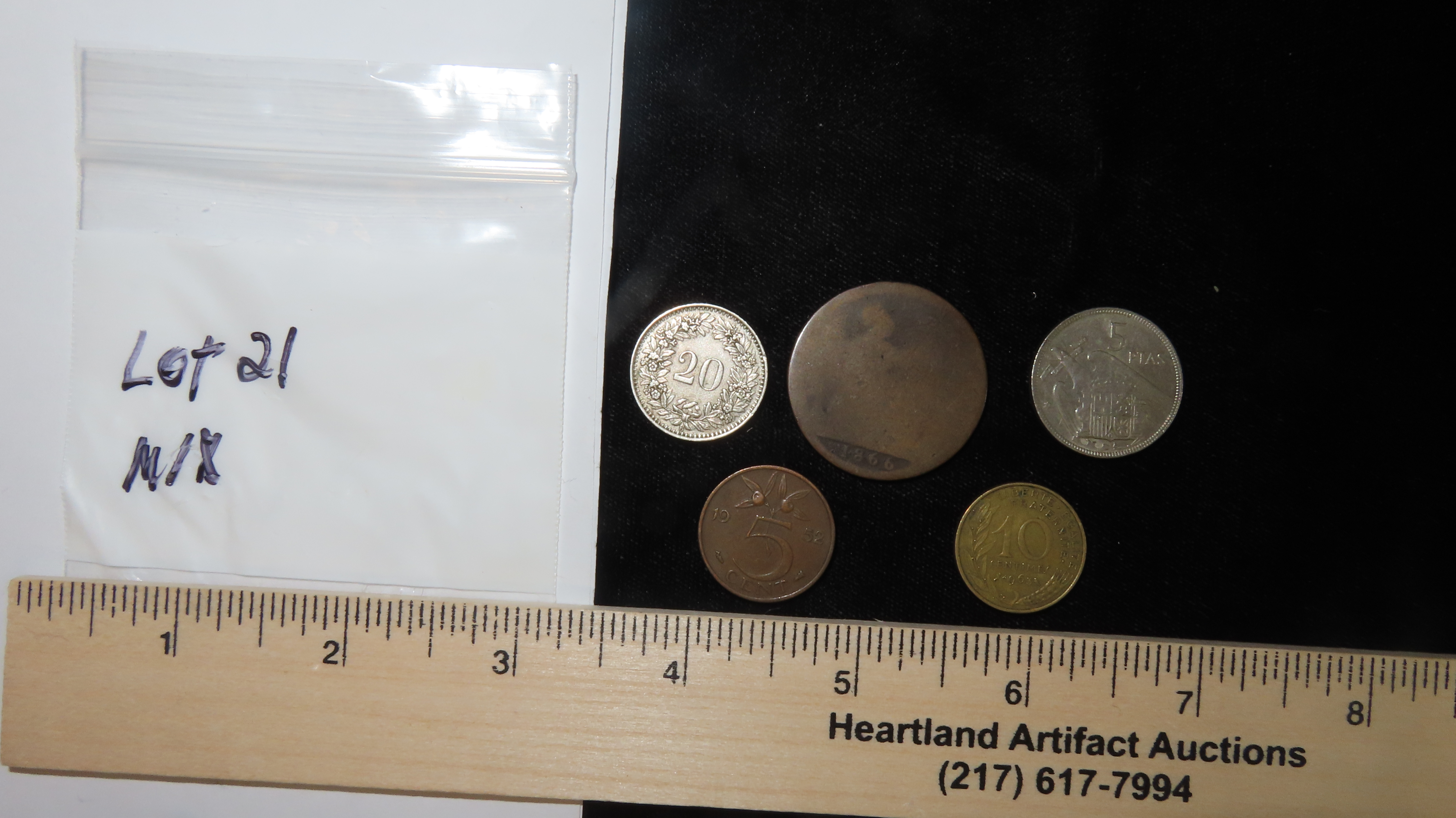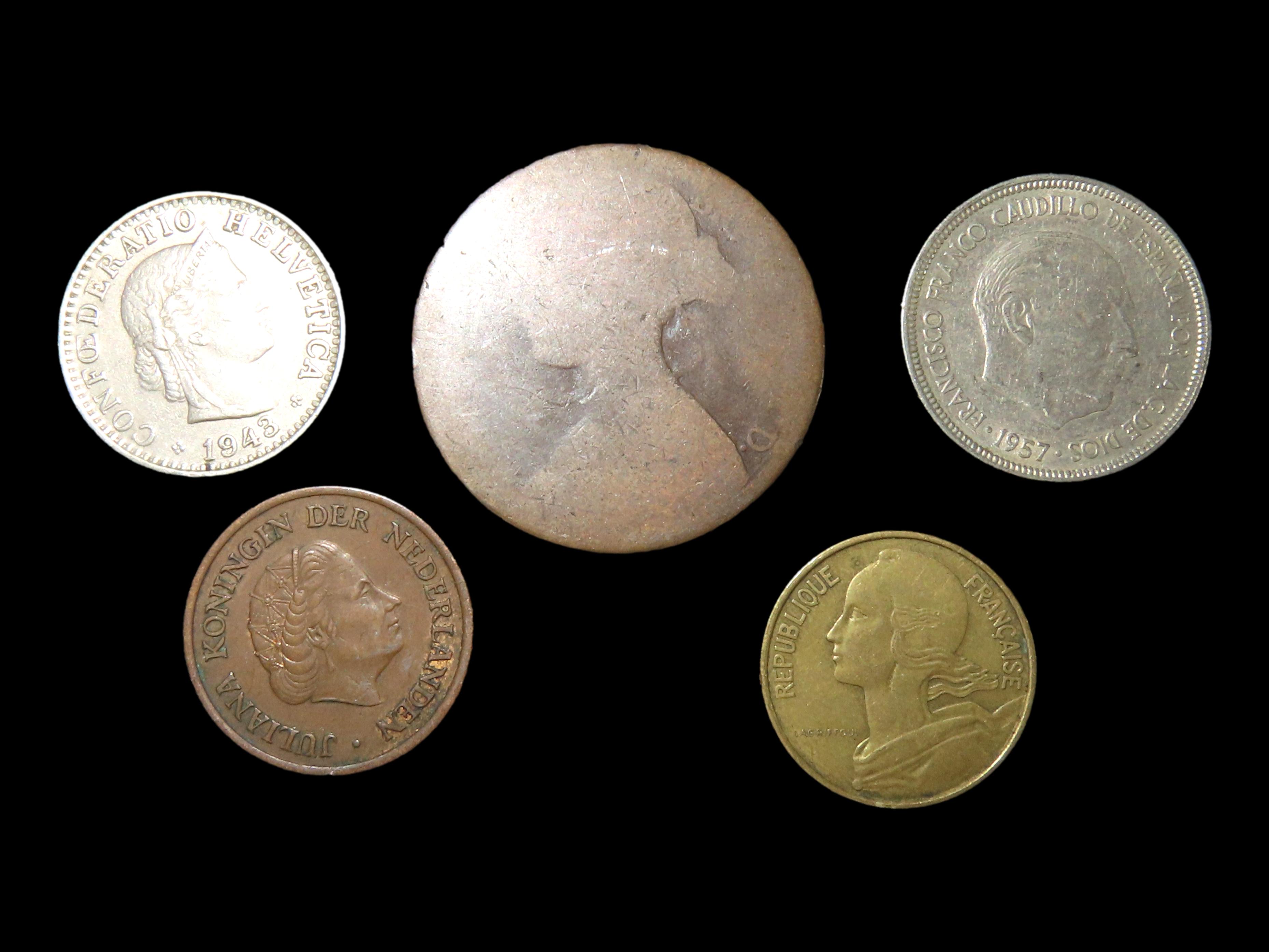 Lot of 5 Coins, United Kingdom 1 penny Bronze/brown coklor/ 1860-1874, Spain 5 pesetas 1957, France 10 centimes 1962- 2001, Netherlands 5 cents 1950-1980, Switzerland 20 rappen 1881-2024