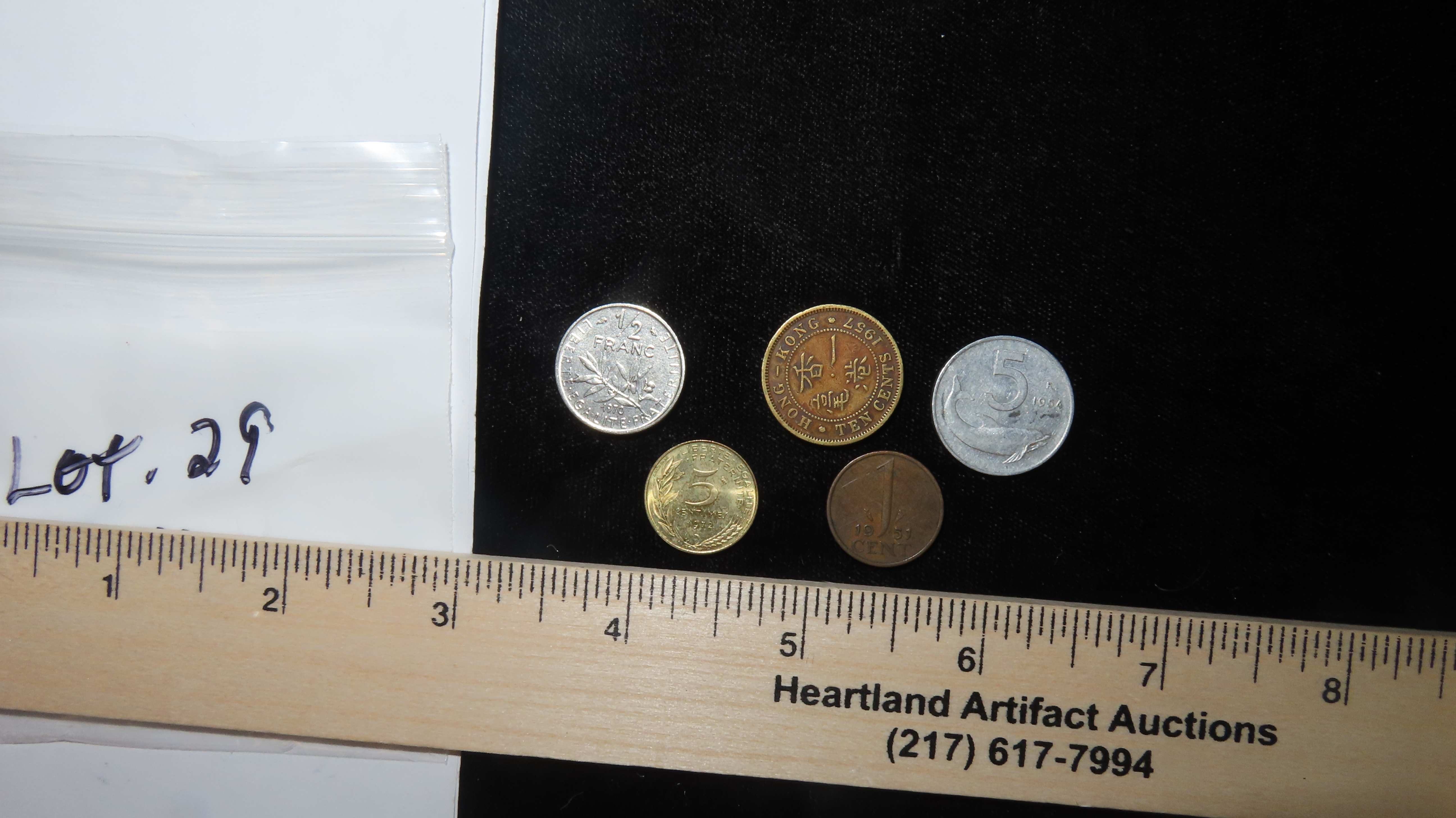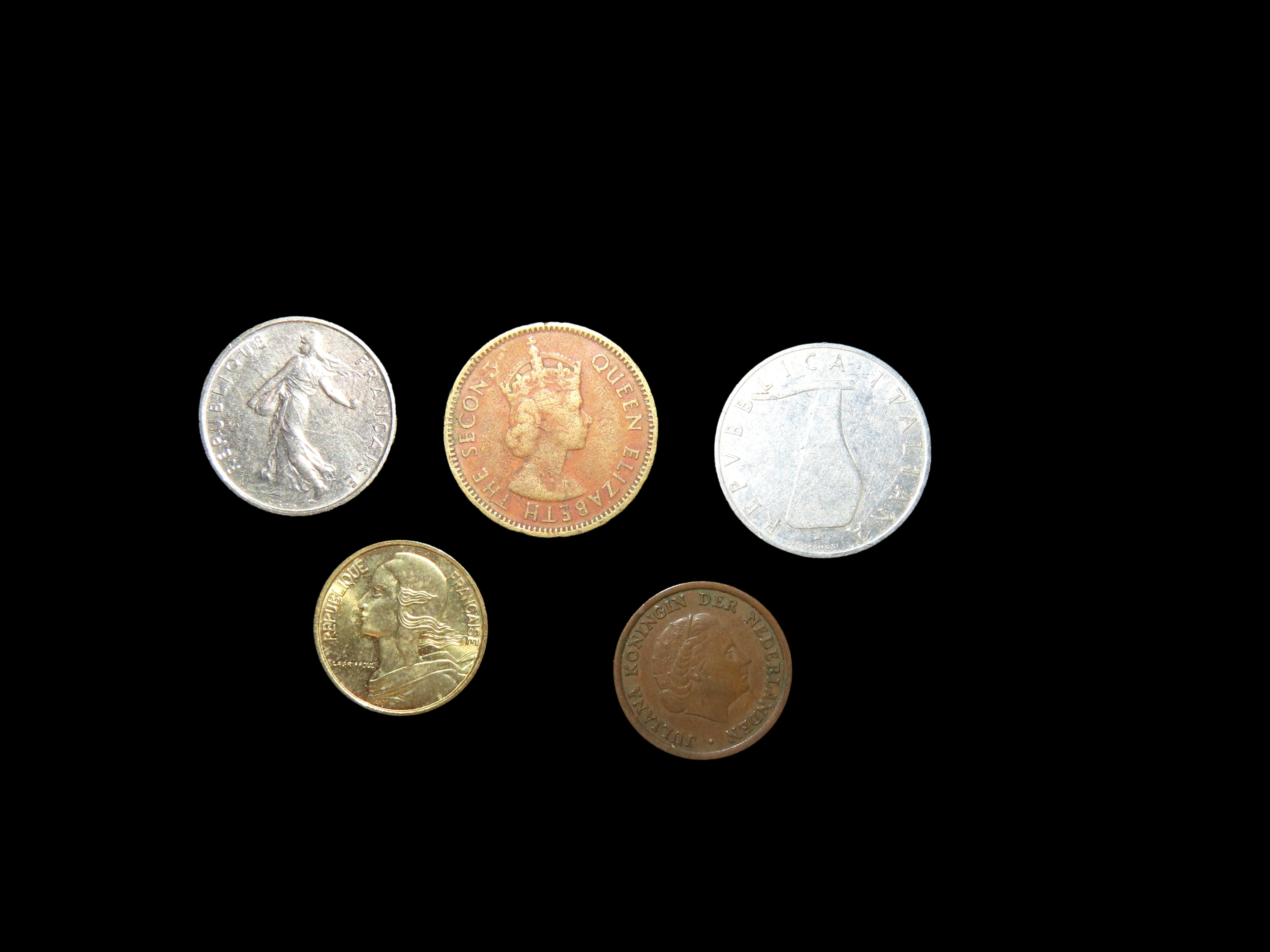 Lot of 5 Coins, Italy 5 lire 1951-2001, France 1/2 franc 1965-2001, Hong Kong 10 cents 1955-1980, Netherlands 1 cent 1950-1980, France 5 centimes 1966-2001,