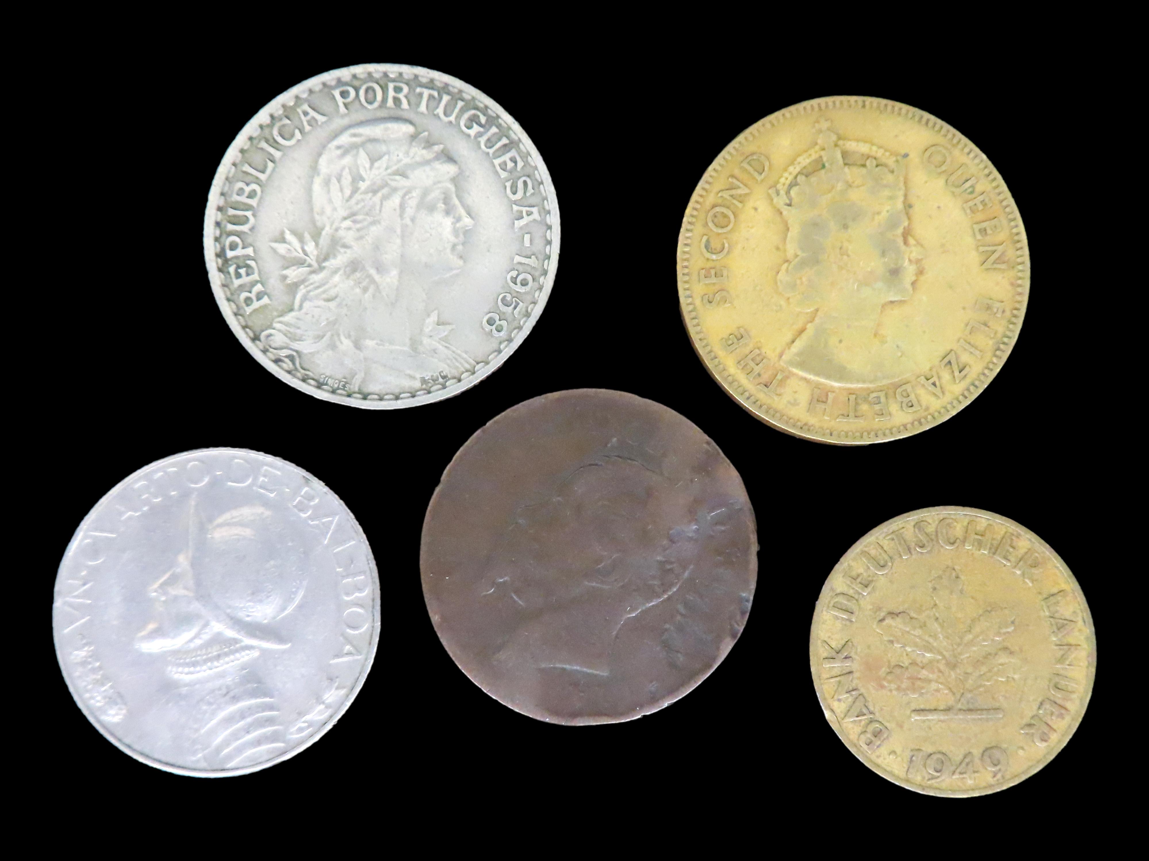 Lot of 5 Coins, Panama1/4 balboa 1966-1993, Jamaica 1 penny 1953-1963, Italy 5 centesimi 1861-1867, Portugal 1 escudo 1927-1968, Germany 10 pfennig 1949