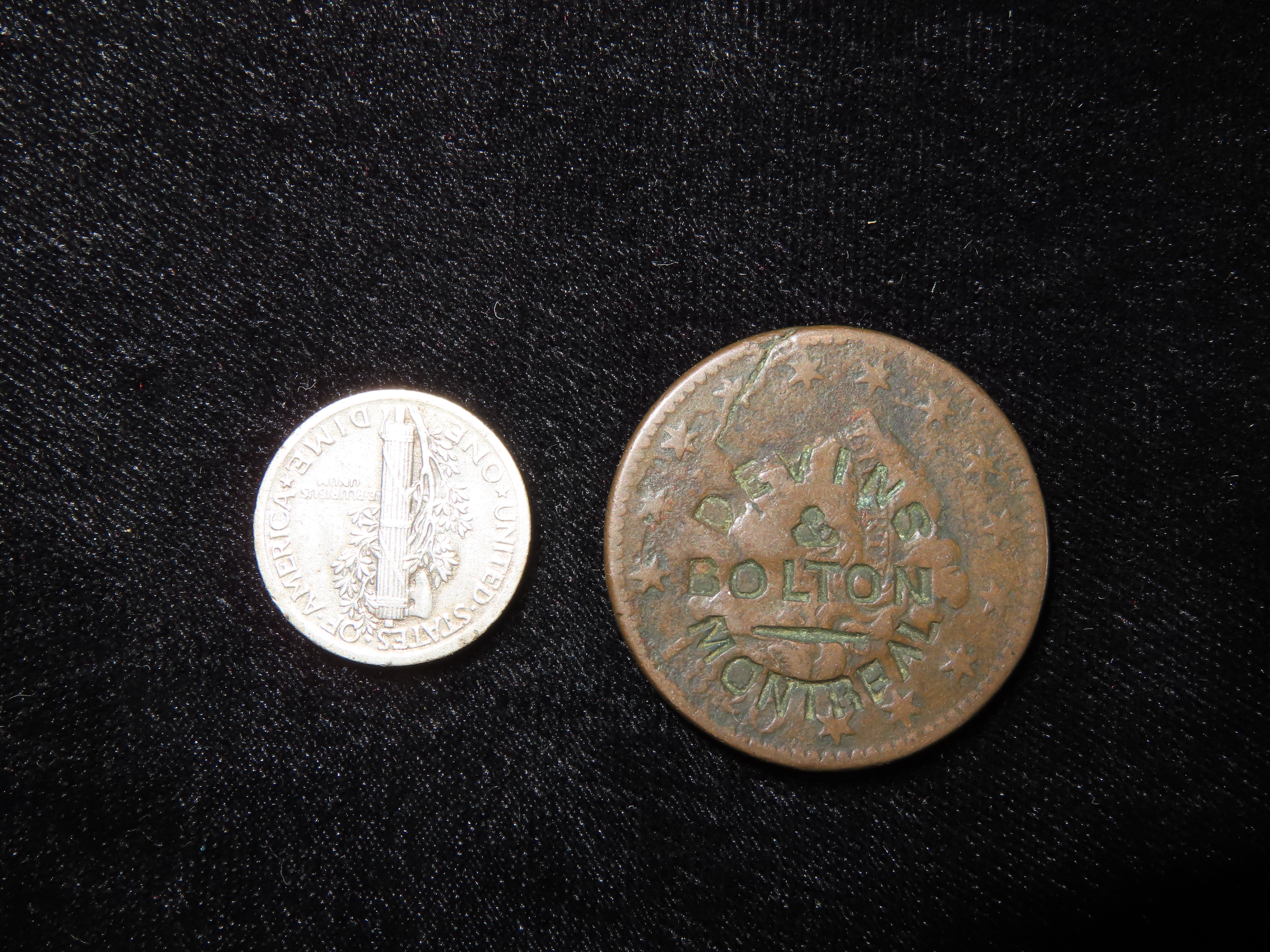 Lot of 2 Coins, USA 1 dime, Mercury Dime 1916-1945,(1919), USA 1 cent 1816-1839.