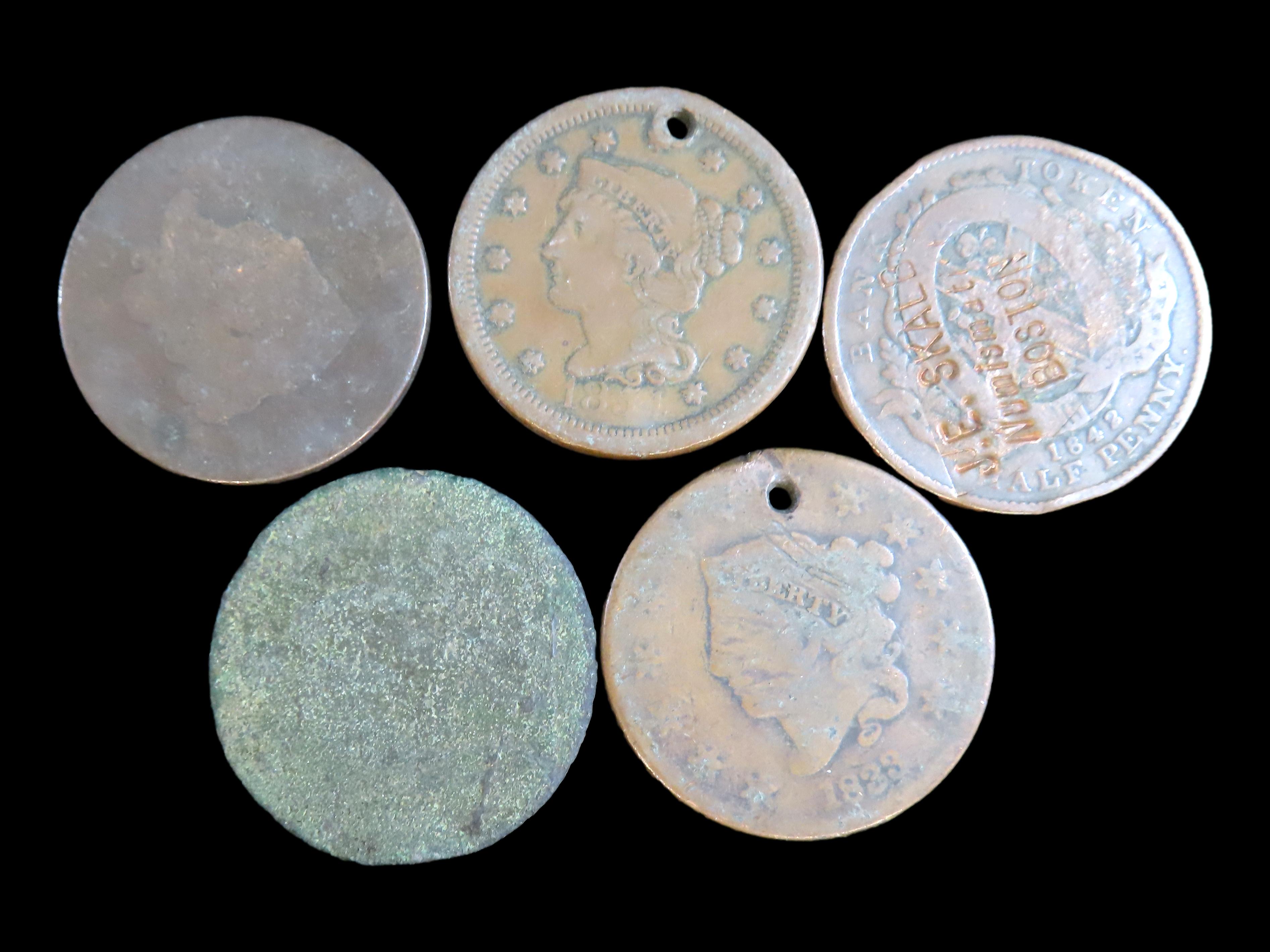Lot of 5 Coins, Canadian provinces 1/2 penny, Bank of Montreal 1842-1844, USA 1 cent 1816-1839, USA 1 cent, Lincoin Shield Penny 2010-2024, USA 1 cent 1816-1839, USA 1 cent, Liberty Head Cent 1840-1857.
