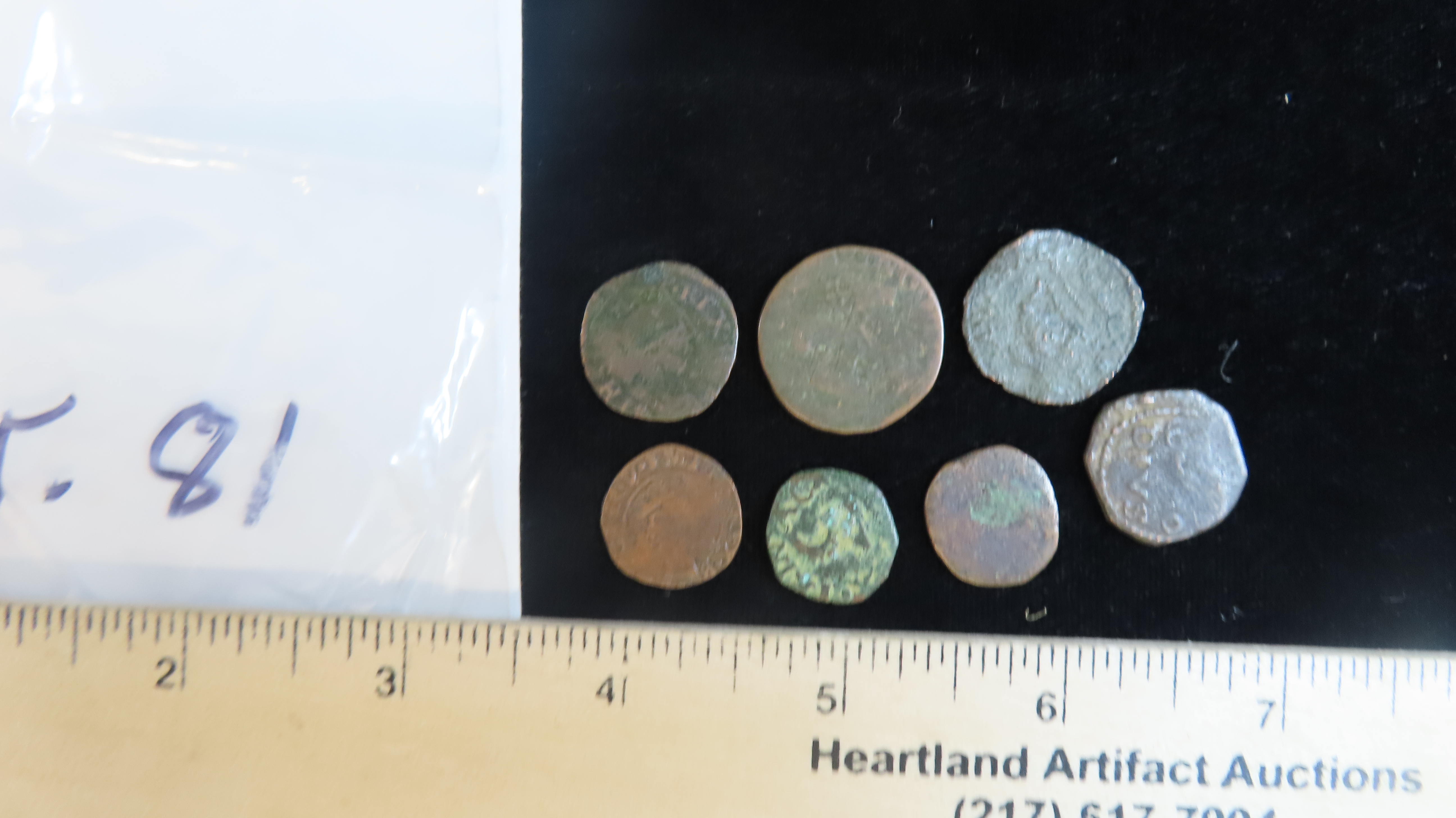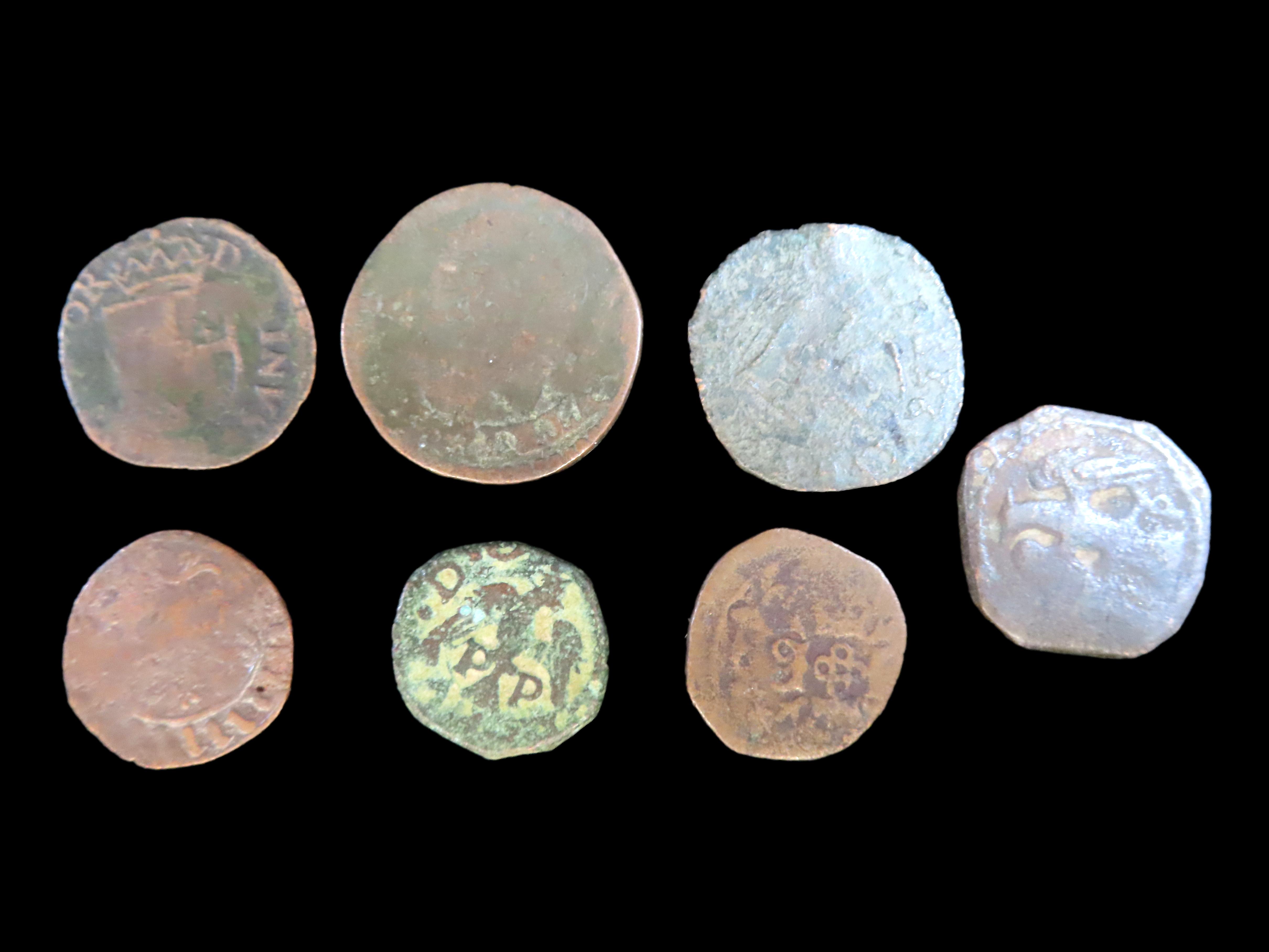 Lot of 7 Coins, Poland 1 solid 1660-1668, Sweden 1 fyrk 1578-1592, Mysore 12 1/2 cash 1799, Poland 1 solid 1614-1617, USA 1 dime, Roosevelt Dime 1946-2024, Spain 8 maravedis, Irregular shape, hand stamped 1661, USA 1 dime, Roosevelt Dime 1946-2024.