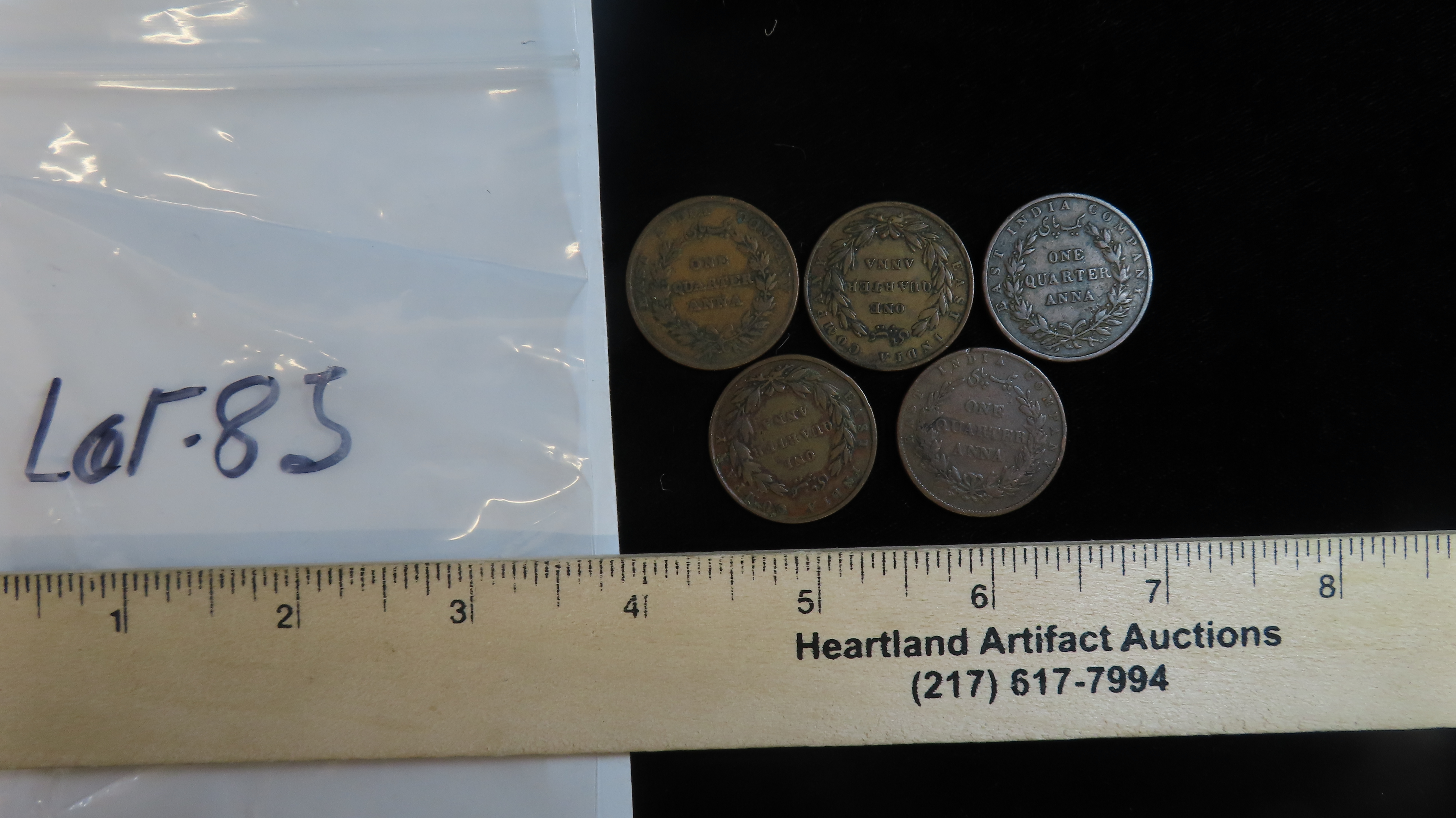 Lot of 5 Coins, India-British 1/4 anna 1857, India-British 1/4 anna 1835, India_British 1/4 anna 1835, India-British 1/4 anna 1835, India-British 1/4 anna 1835.