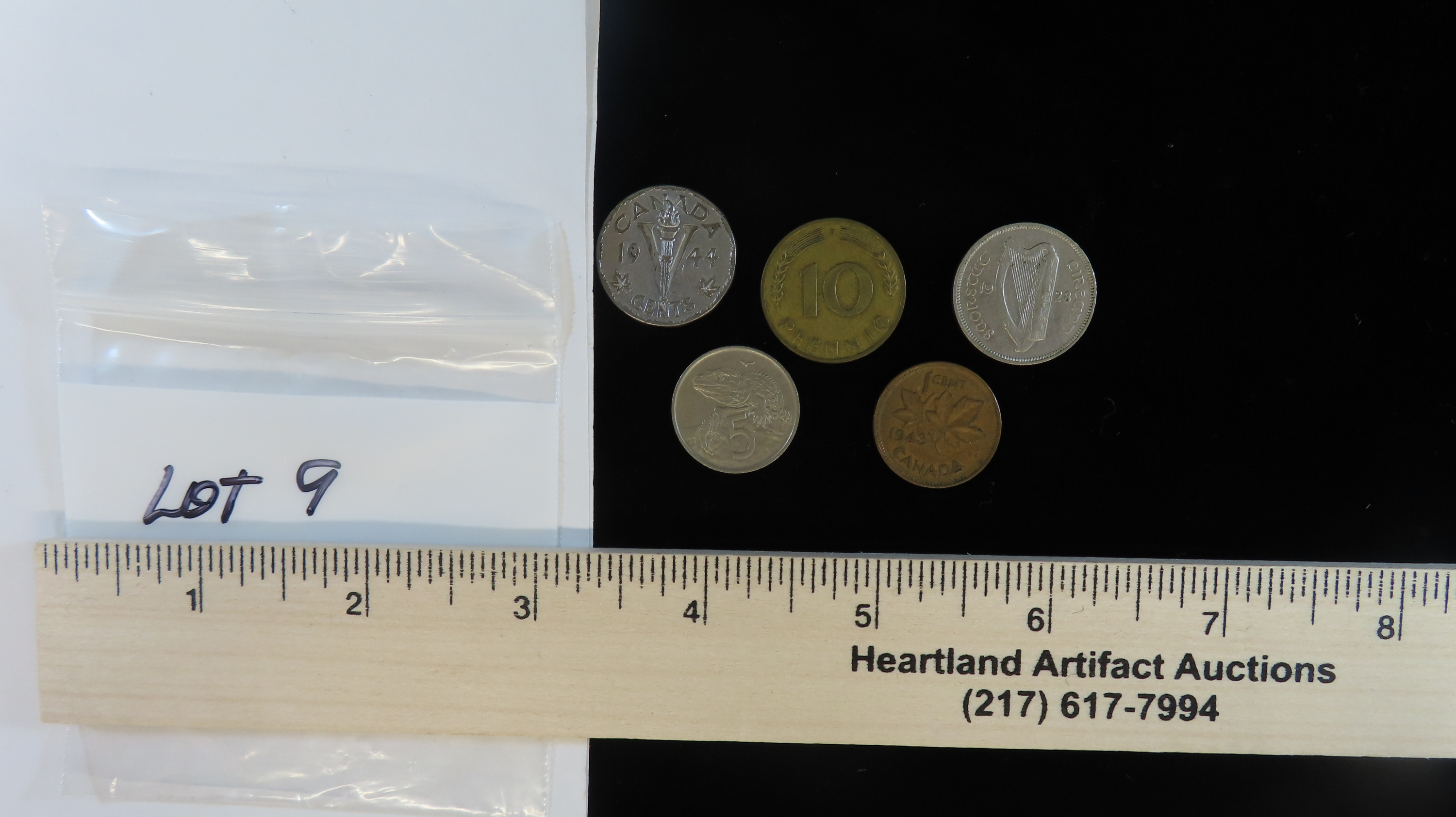 Lot of 5 Coins, Canada 5 cents 1943-1945, Germany 10 pfenning 1950-2001, Ireland 6 pence 1928-1935, New Zealand 5 cents 1967-1985, Canada 1 cent 1937-1947
