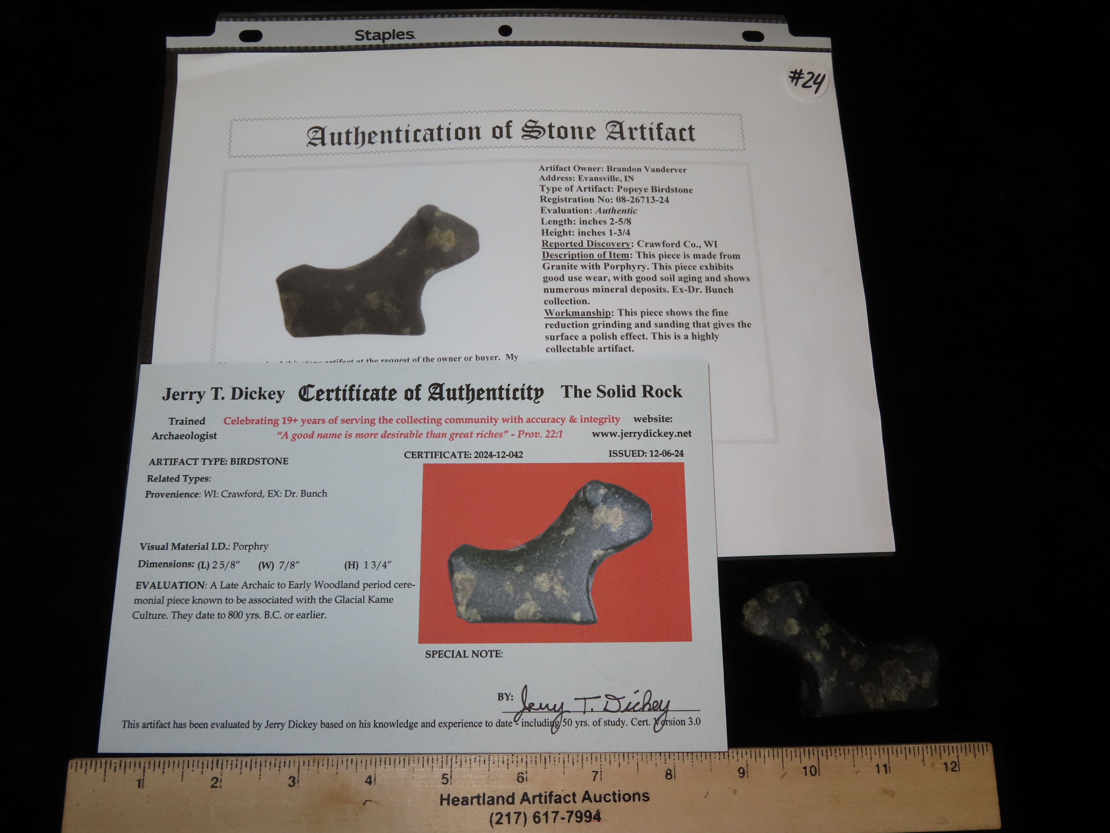 Outstanding 2 5/8″ Porphyry Popeye Birdstone, Dickey & Motley COA’s, found in Crawford County Wisconsin, ex Dr. Bunch Collection, Incredible Rare Example.