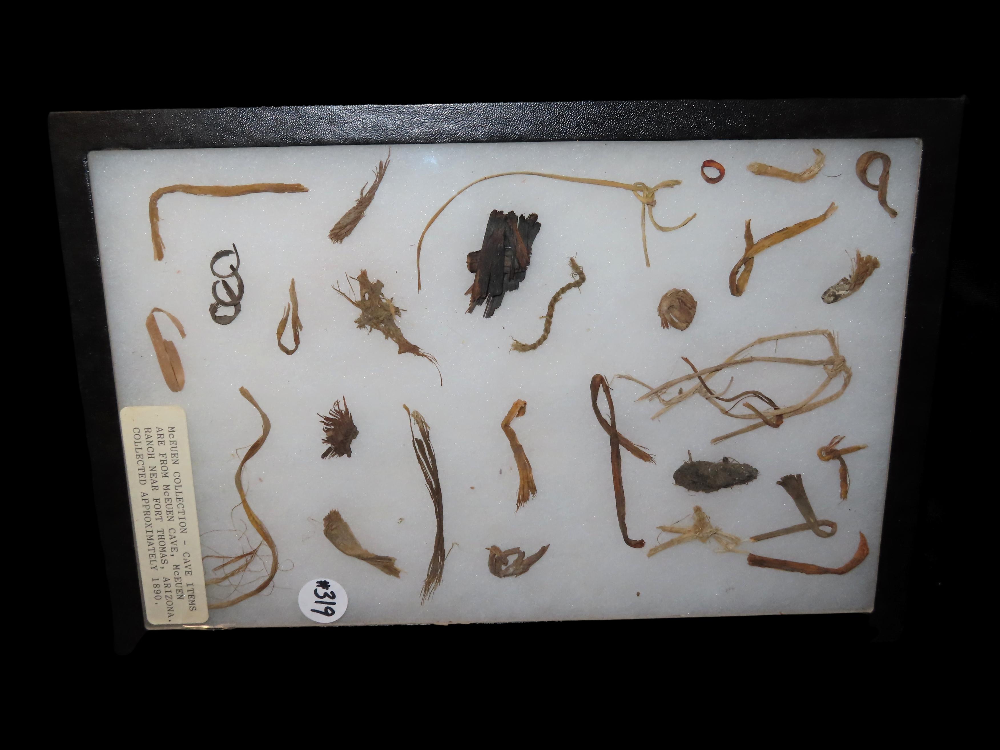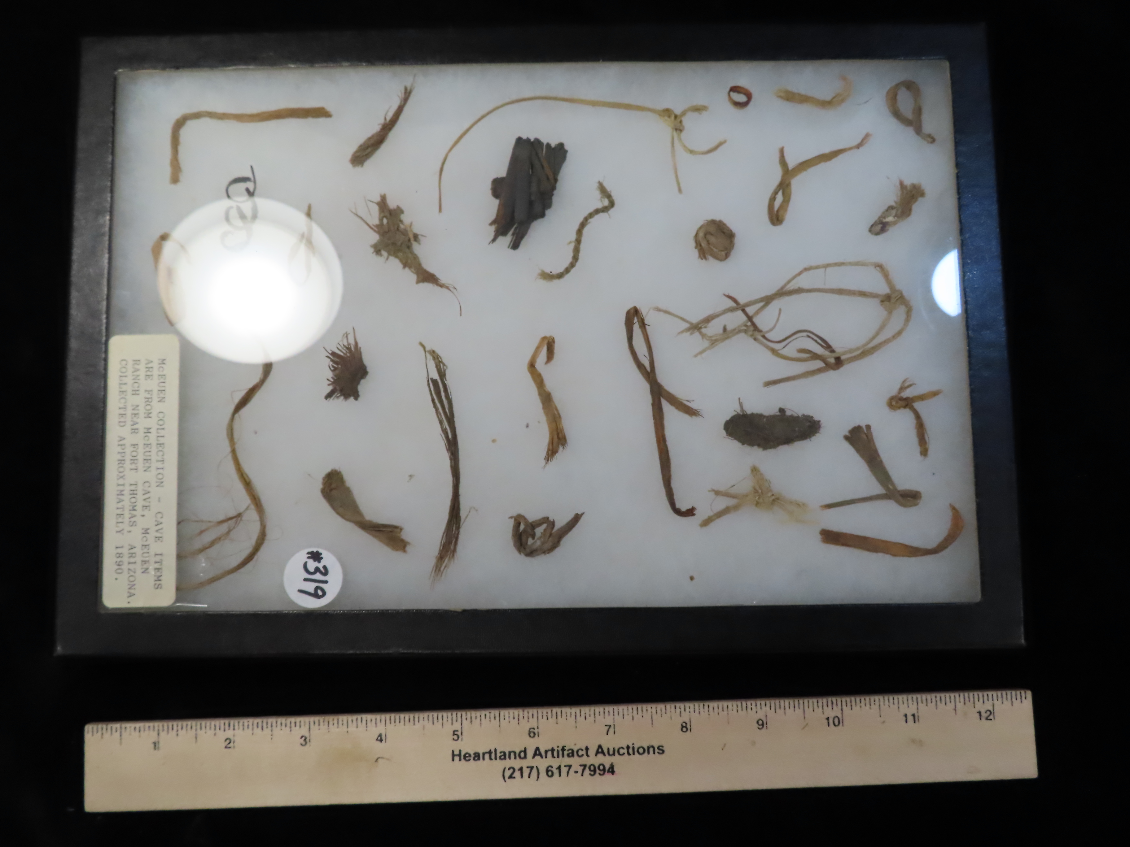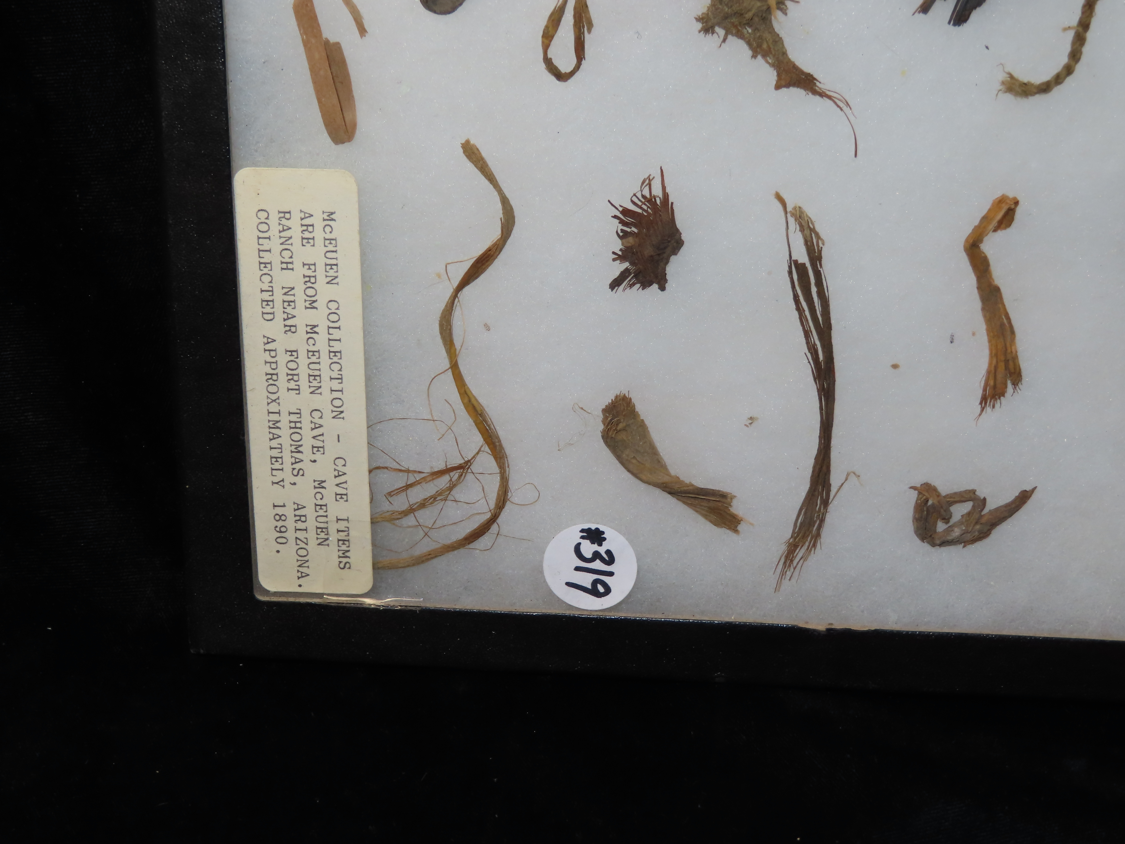 Nice 12 1/4″ by 8 1/2″ frame of Perishable material from Arizona, McEuen Collection, found in McEuen Cave on their Ranch near Fort Thomas Arizona in 1890. Nice array of different forms of string & woven material, lots of interesting pieces, about 30 total.