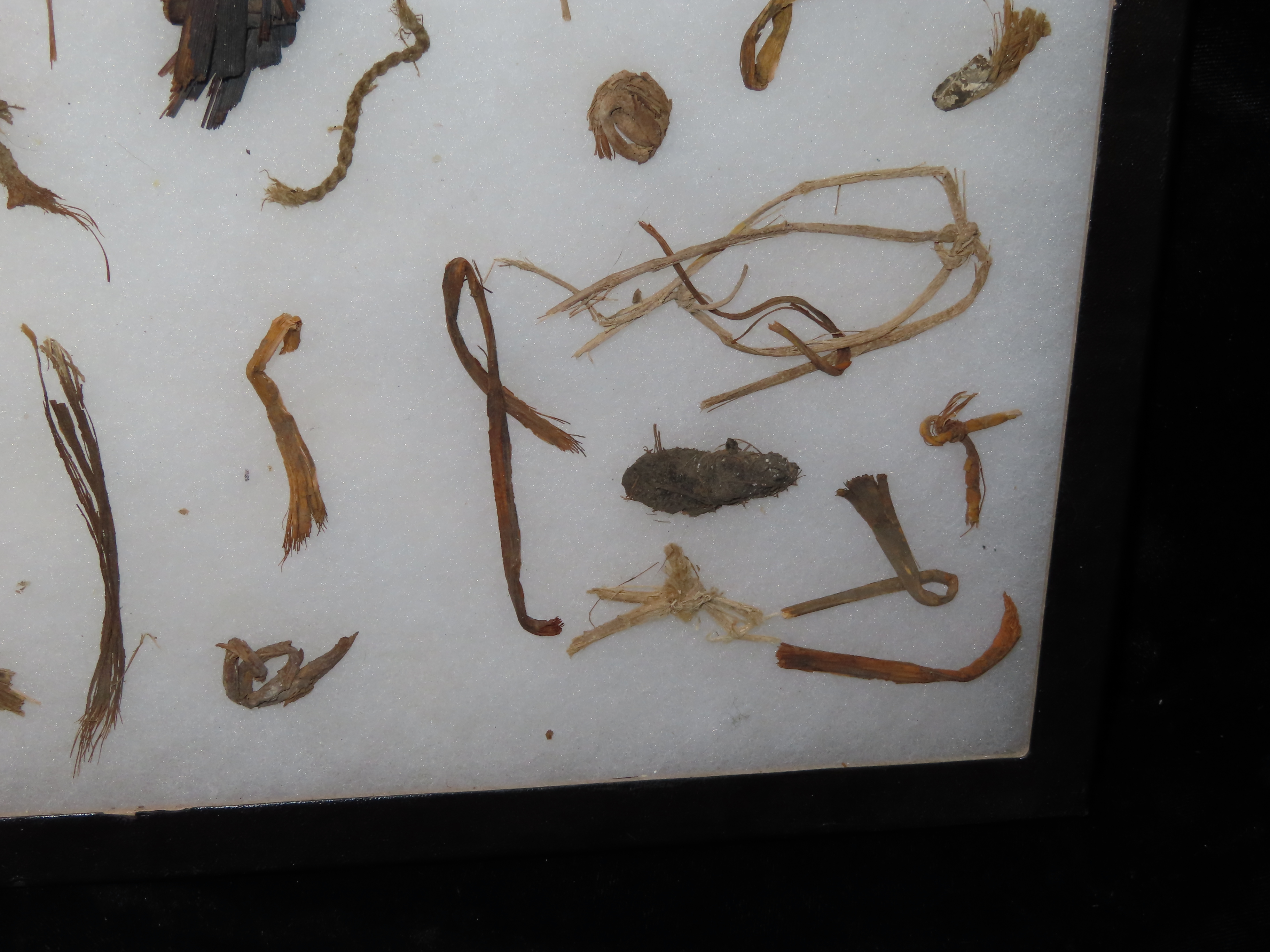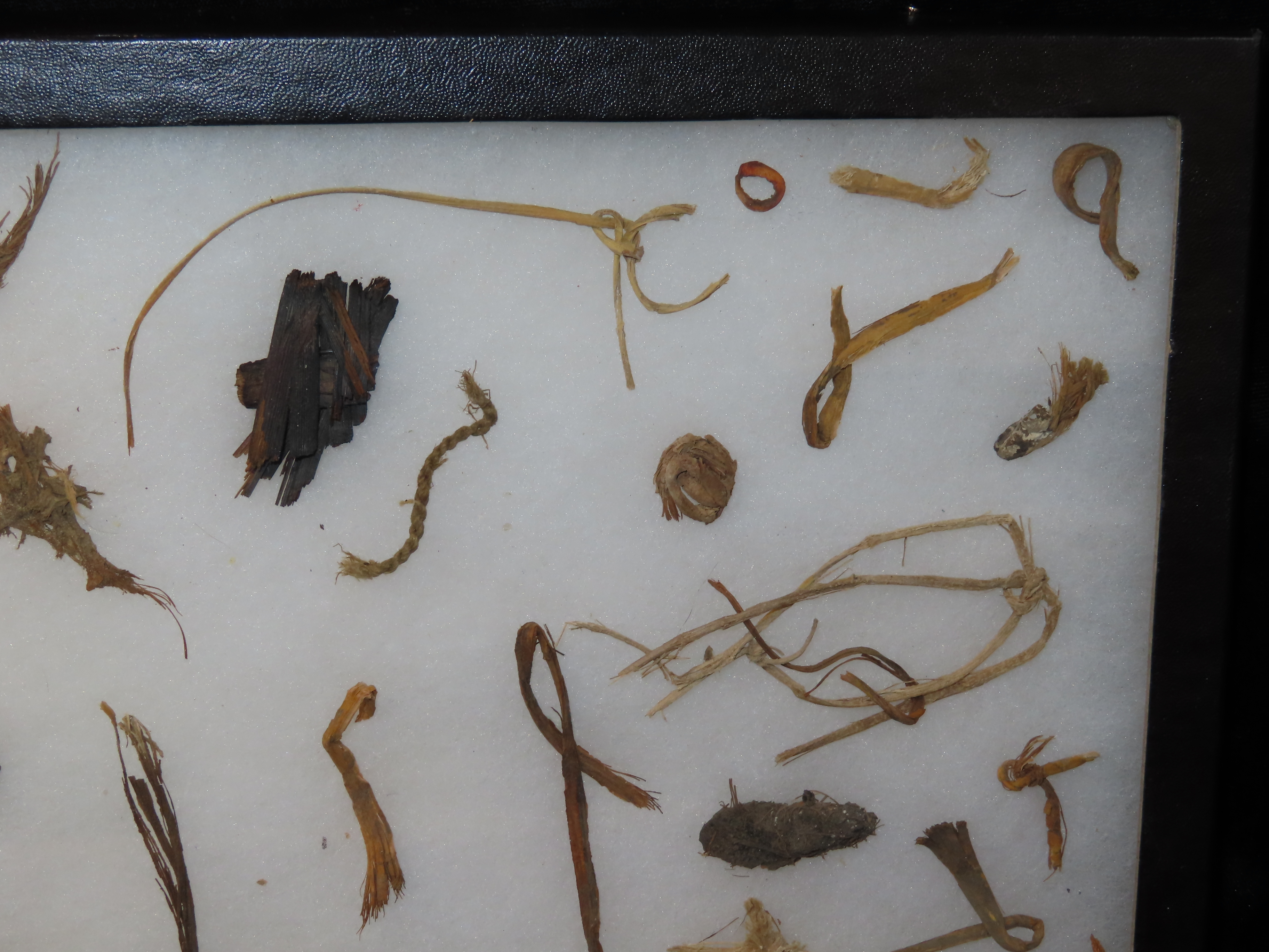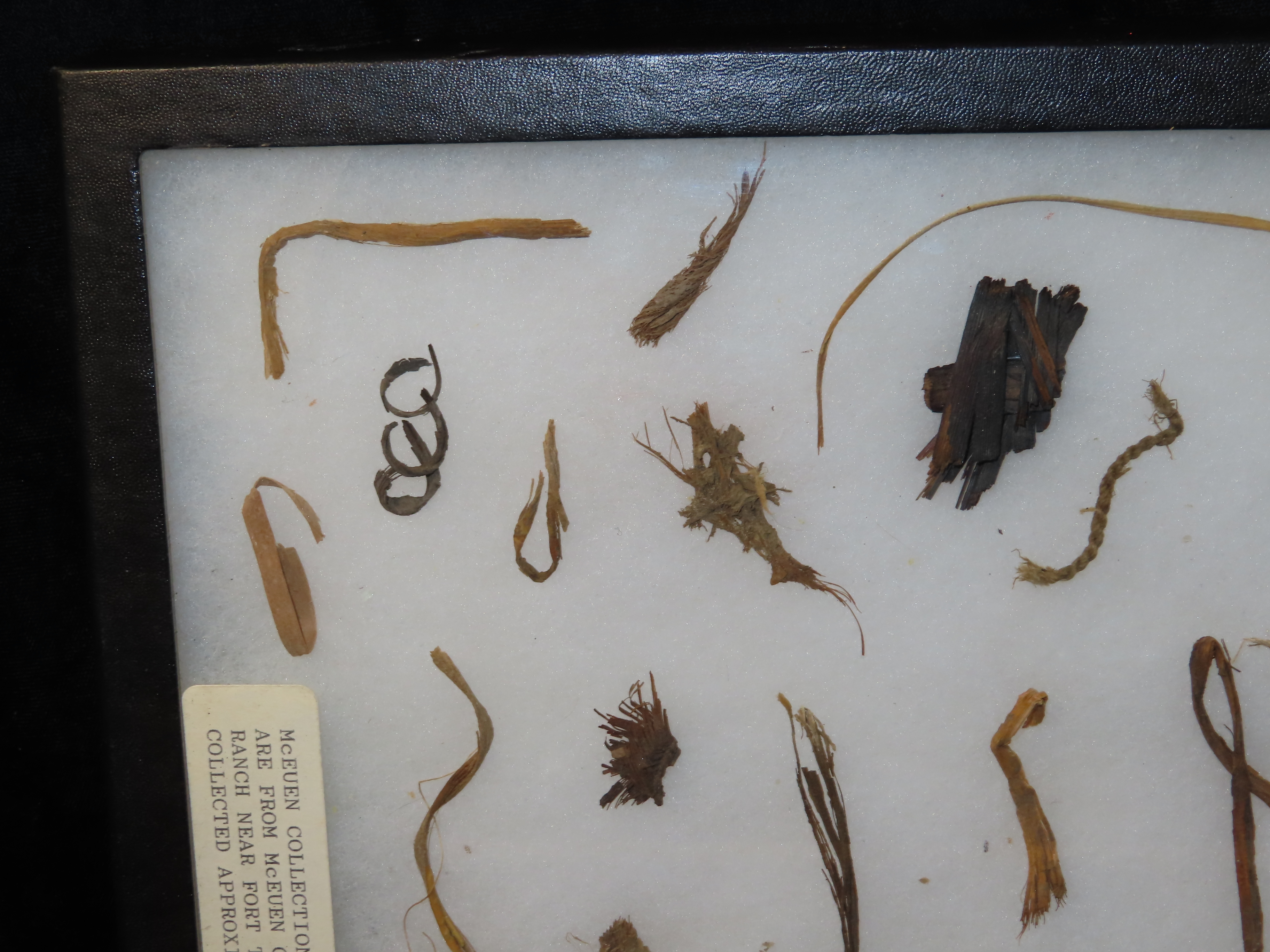 Nice 12 1/4″ by 8 1/2″ frame of Perishable material from Arizona, McEuen Collection, found in McEuen Cave on their Ranch near Fort Thomas Arizona in 1890. Nice array of different forms of string & woven material, lots of interesting pieces, about 30 total.