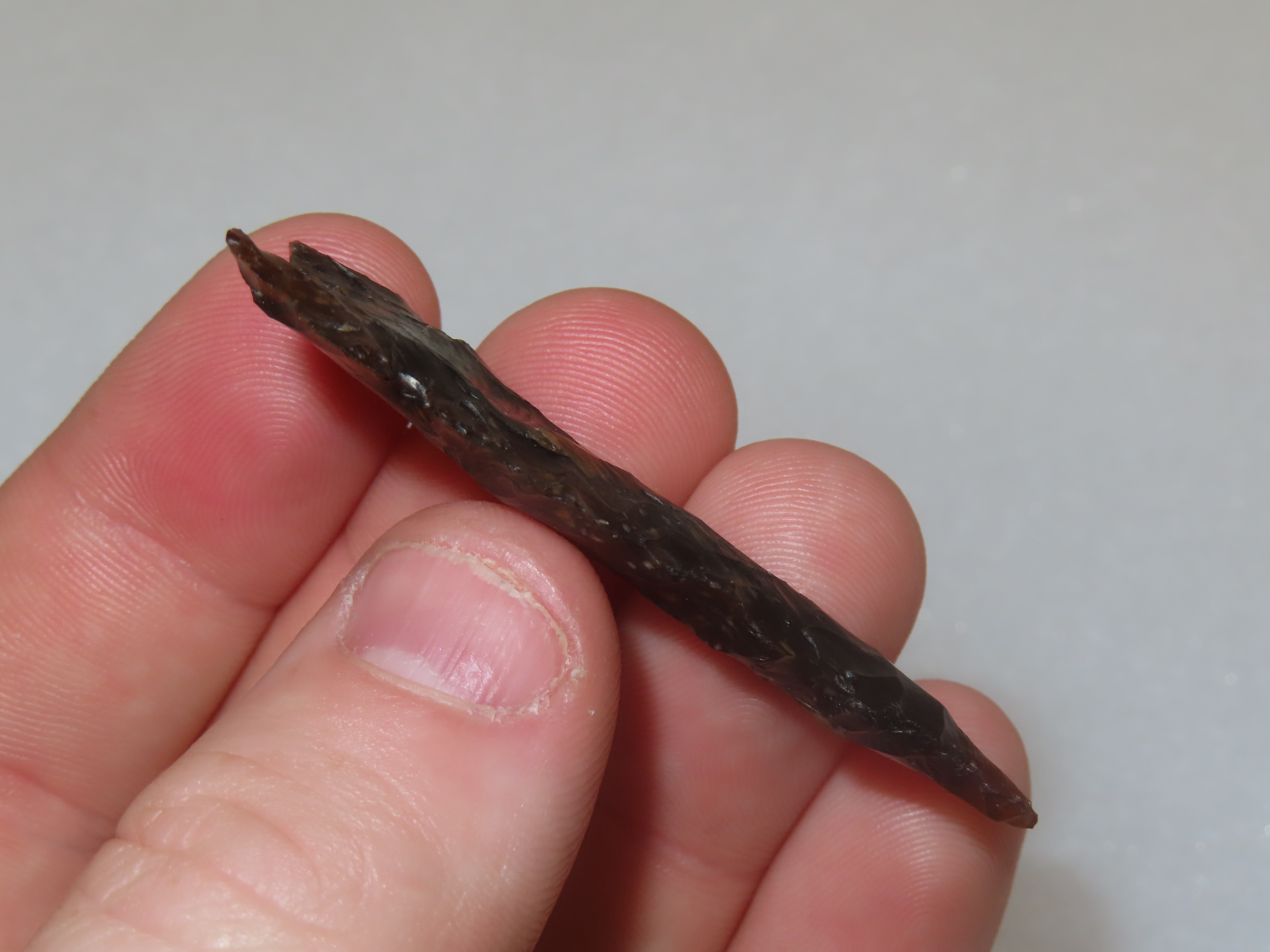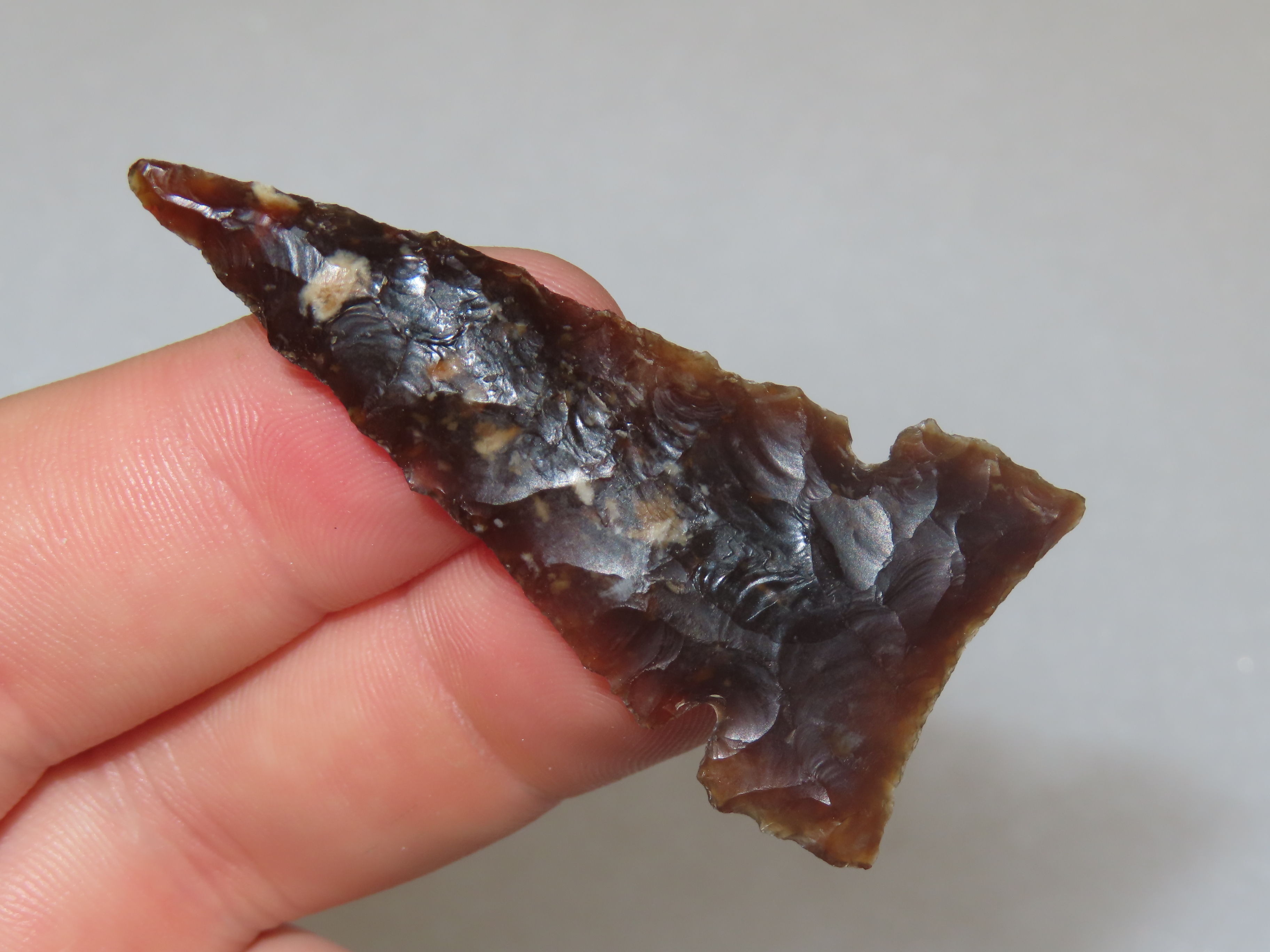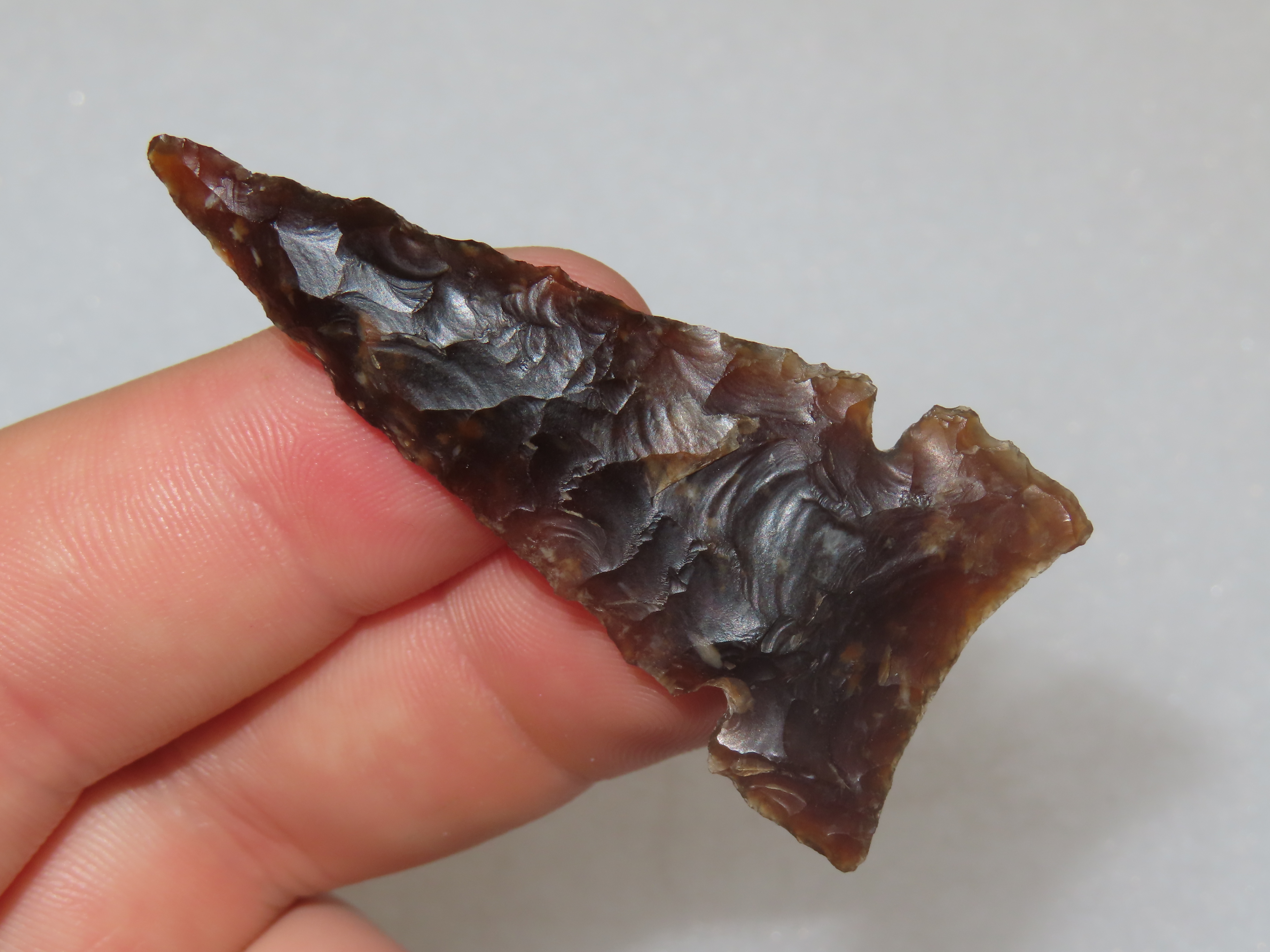 2 3/16″ Translucent Knife River Flint Desert Side notch, Stillwater County Montana, Outstanding Example, Very Well Flaked with Great Age & Patina, Indian Arrowhead