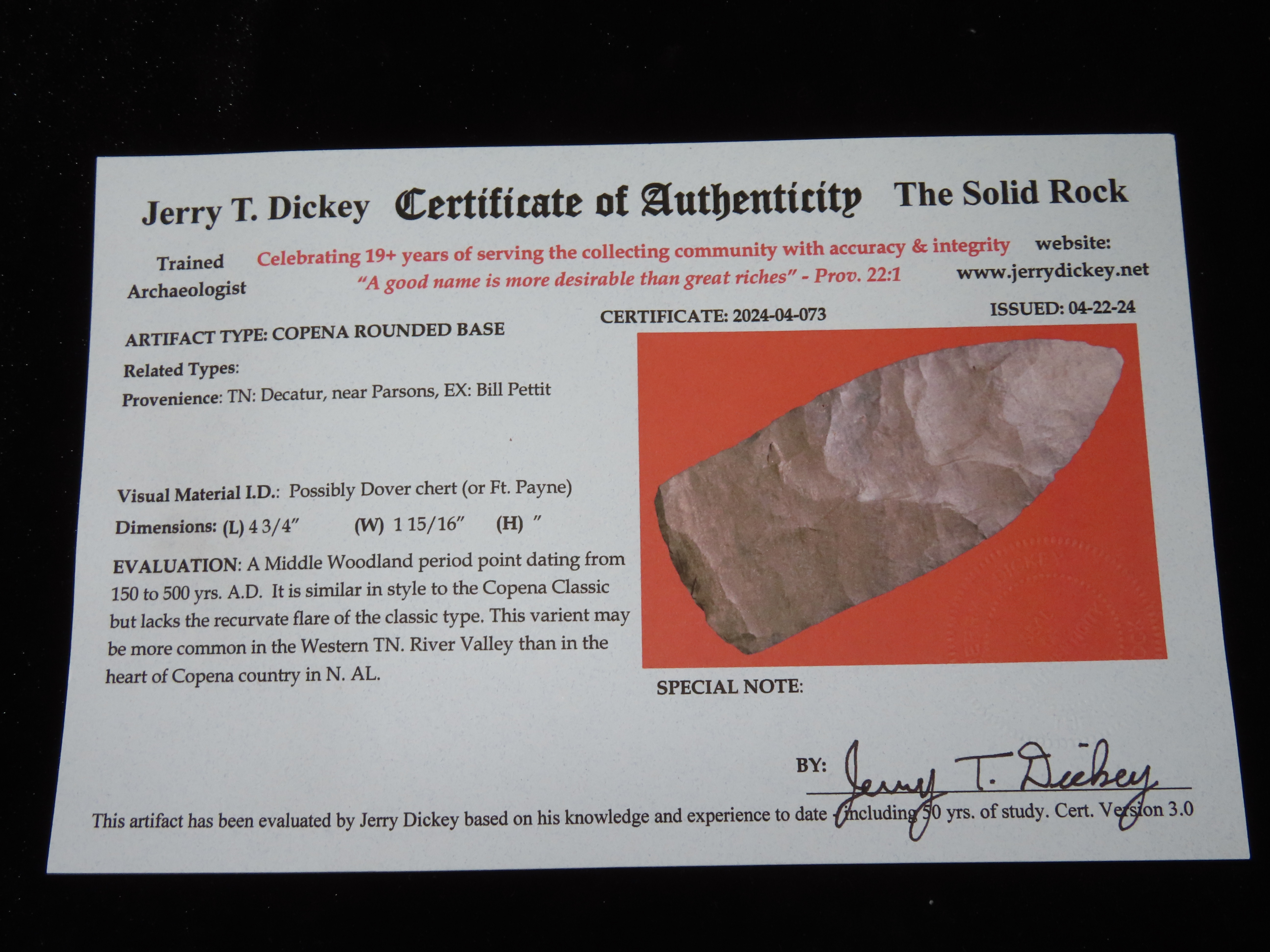 4 3/4″ Copena Rounded Base, Dickey COA, Decatur TN, Ex Bill Pettit