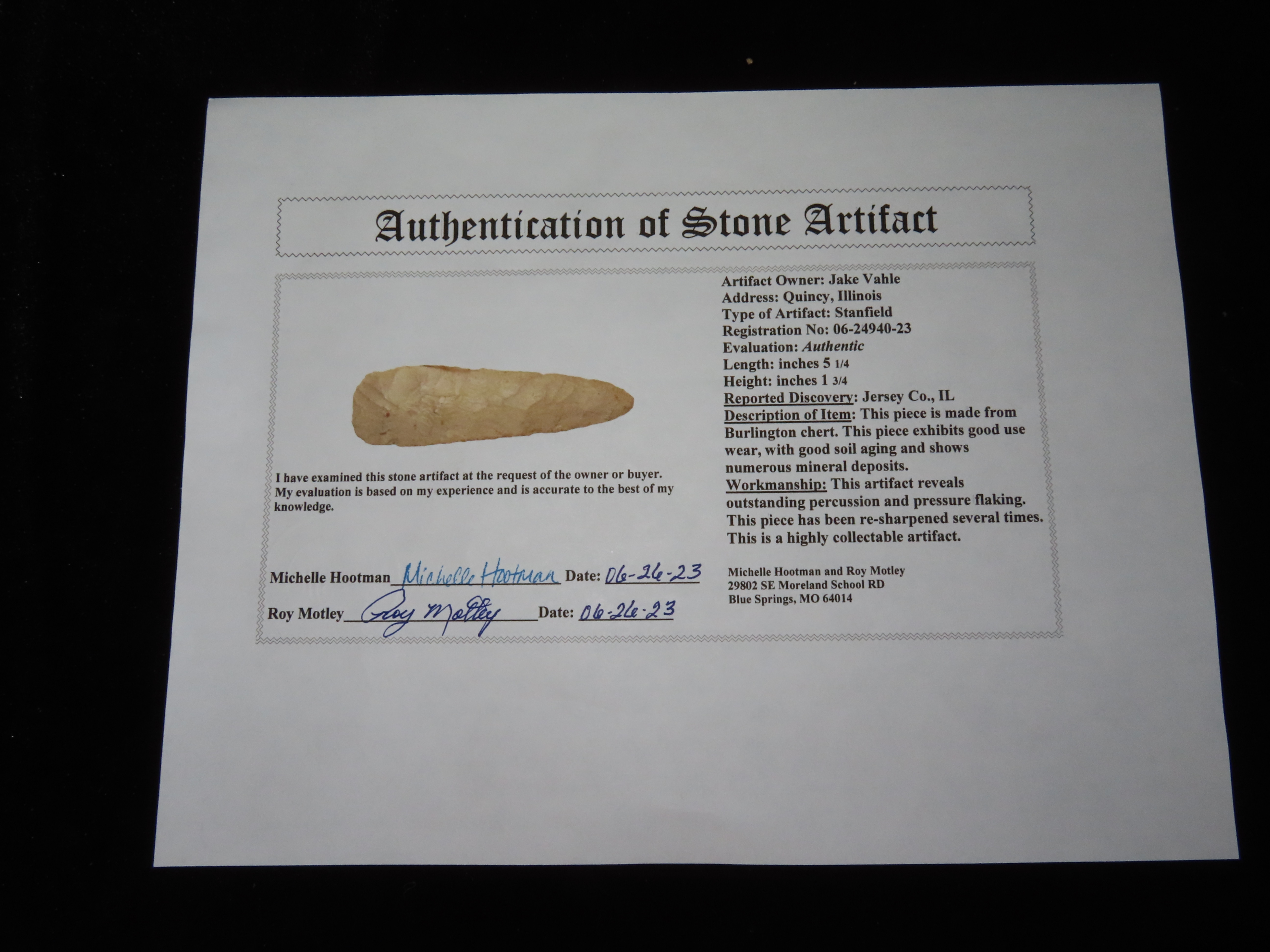 5 1/4" Stanfield Blade, Motley COA, Jersey Co. IL