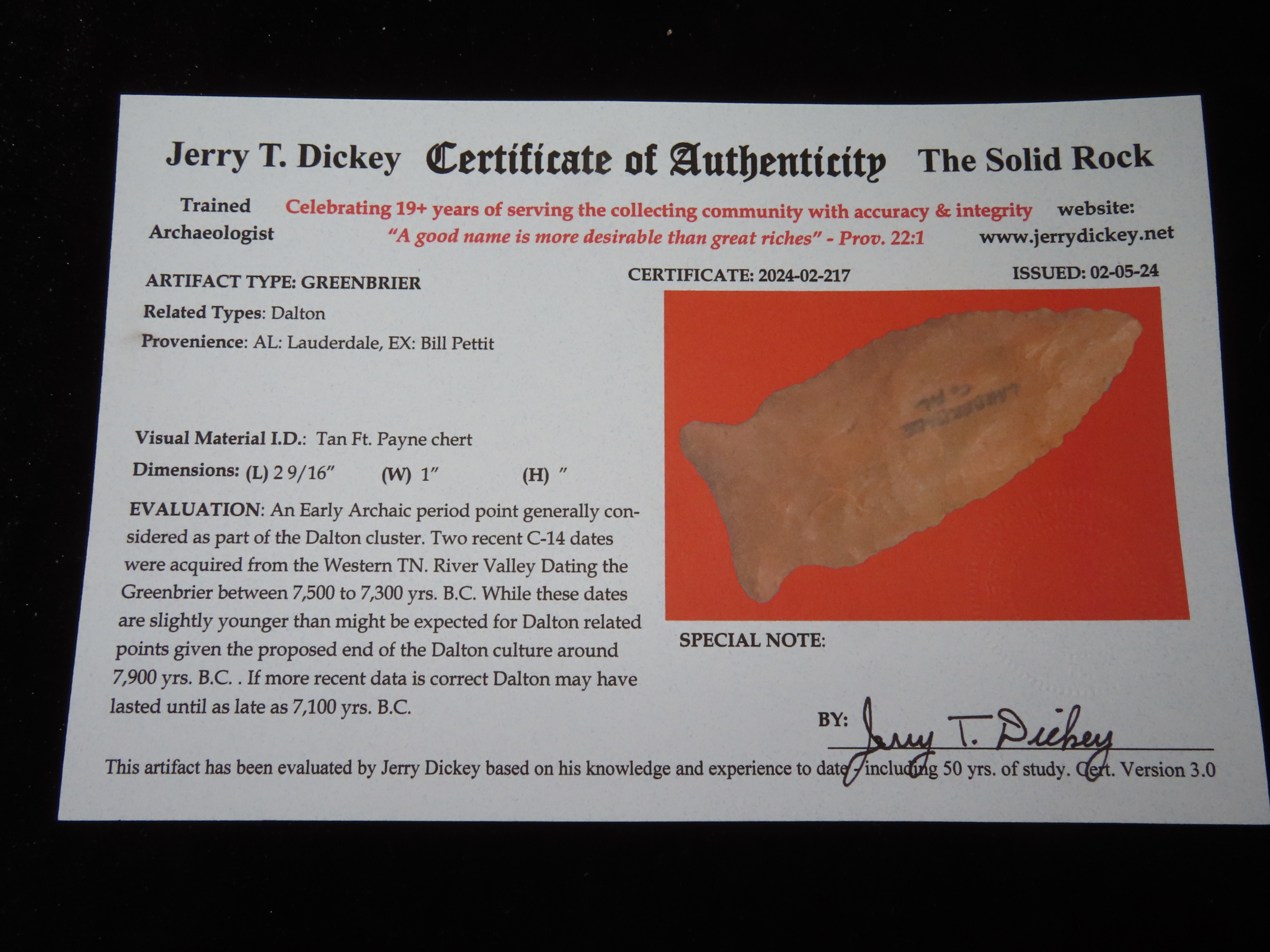 2 9/16" Greenbrier Dalton, Dickey COA, Lauderdale AL, Ex Bill Pettit