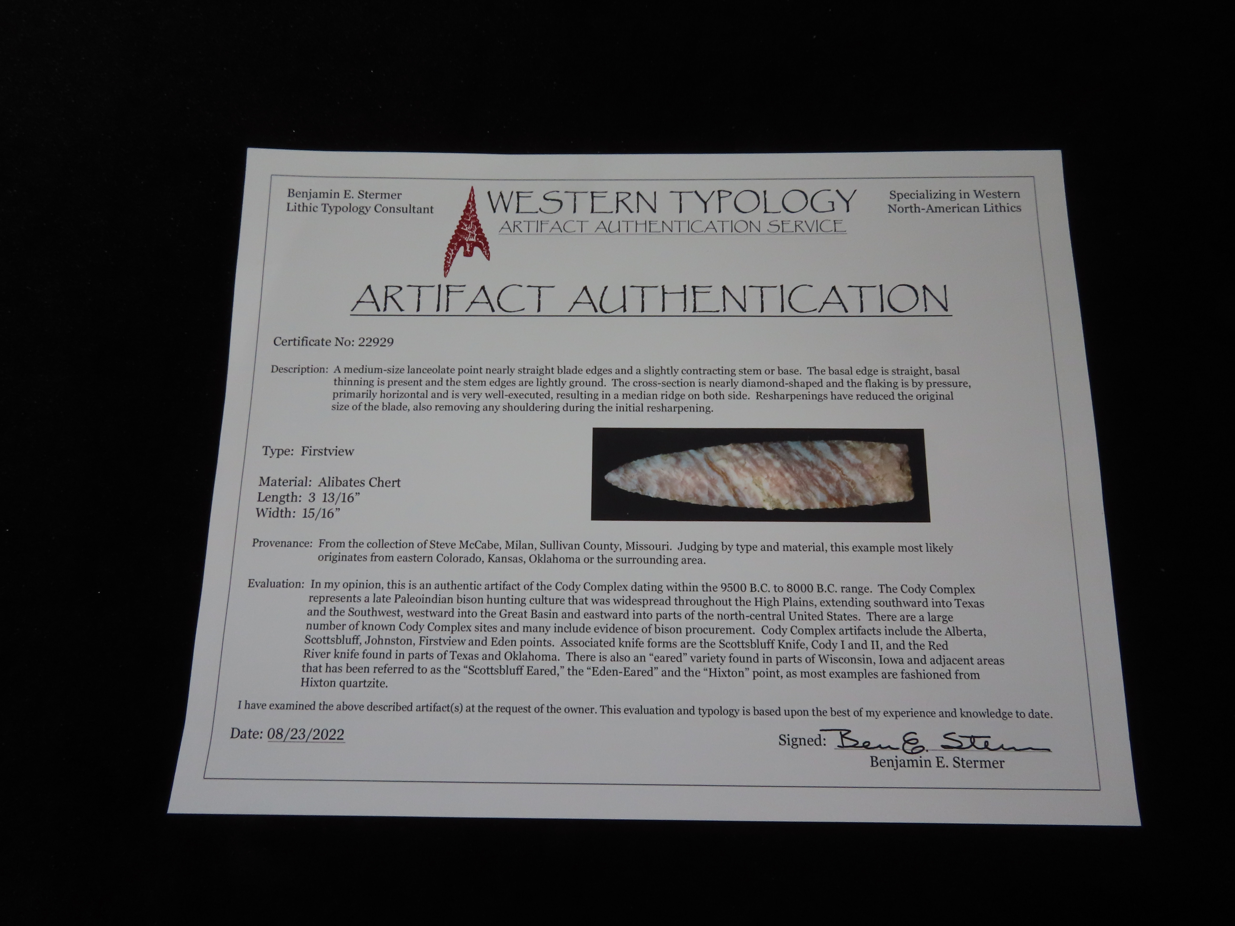 STUNNING FIRSTVIEW, 3 13/16″, Cody Complex, High Plains Paleo, Stermer COA, Alibates Chert, Colorado, Kansas