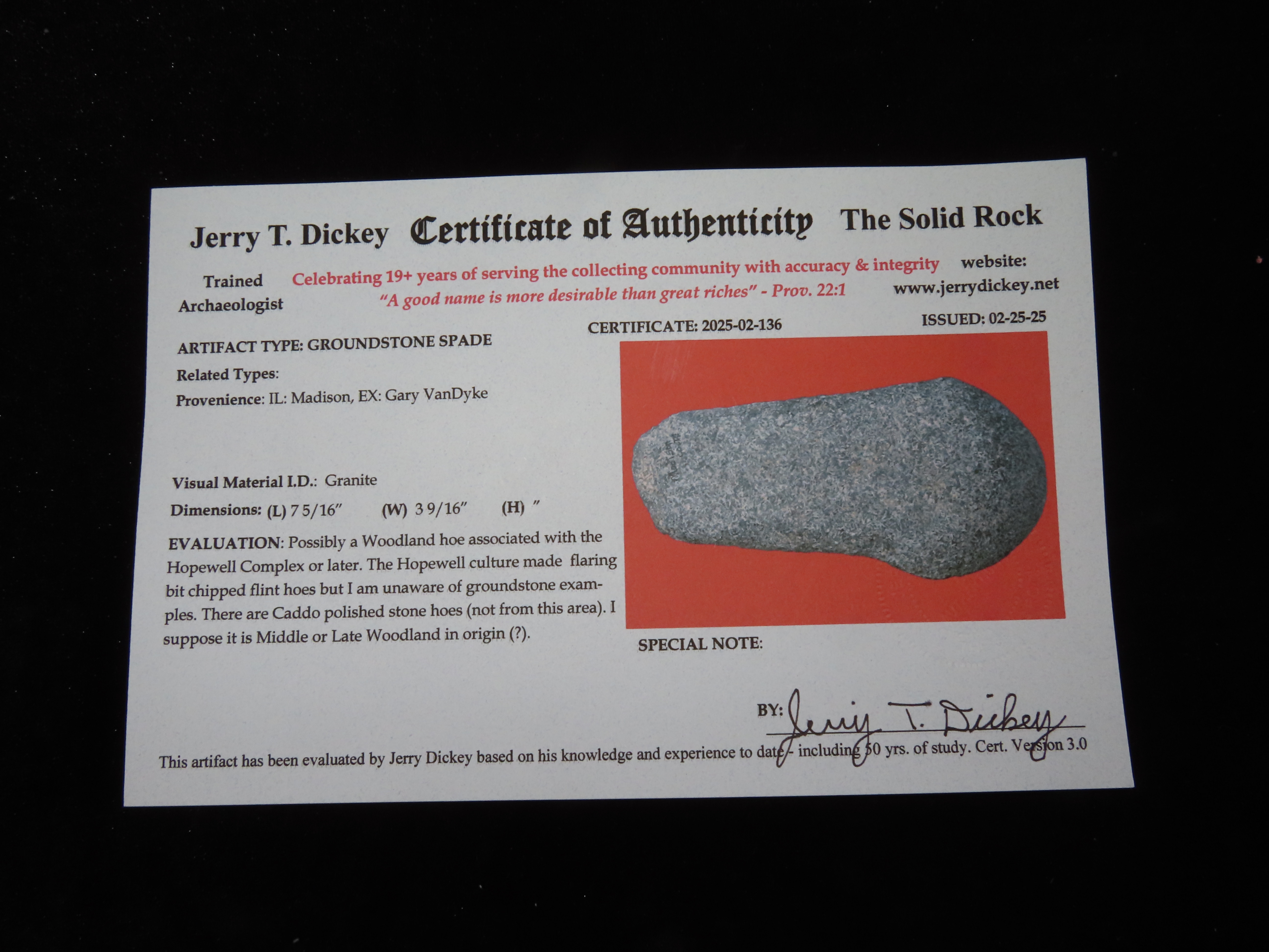 7 3/8″ Hardstone Spud, Dickey COA, EX Vandyke, Madison Co., Illinois,