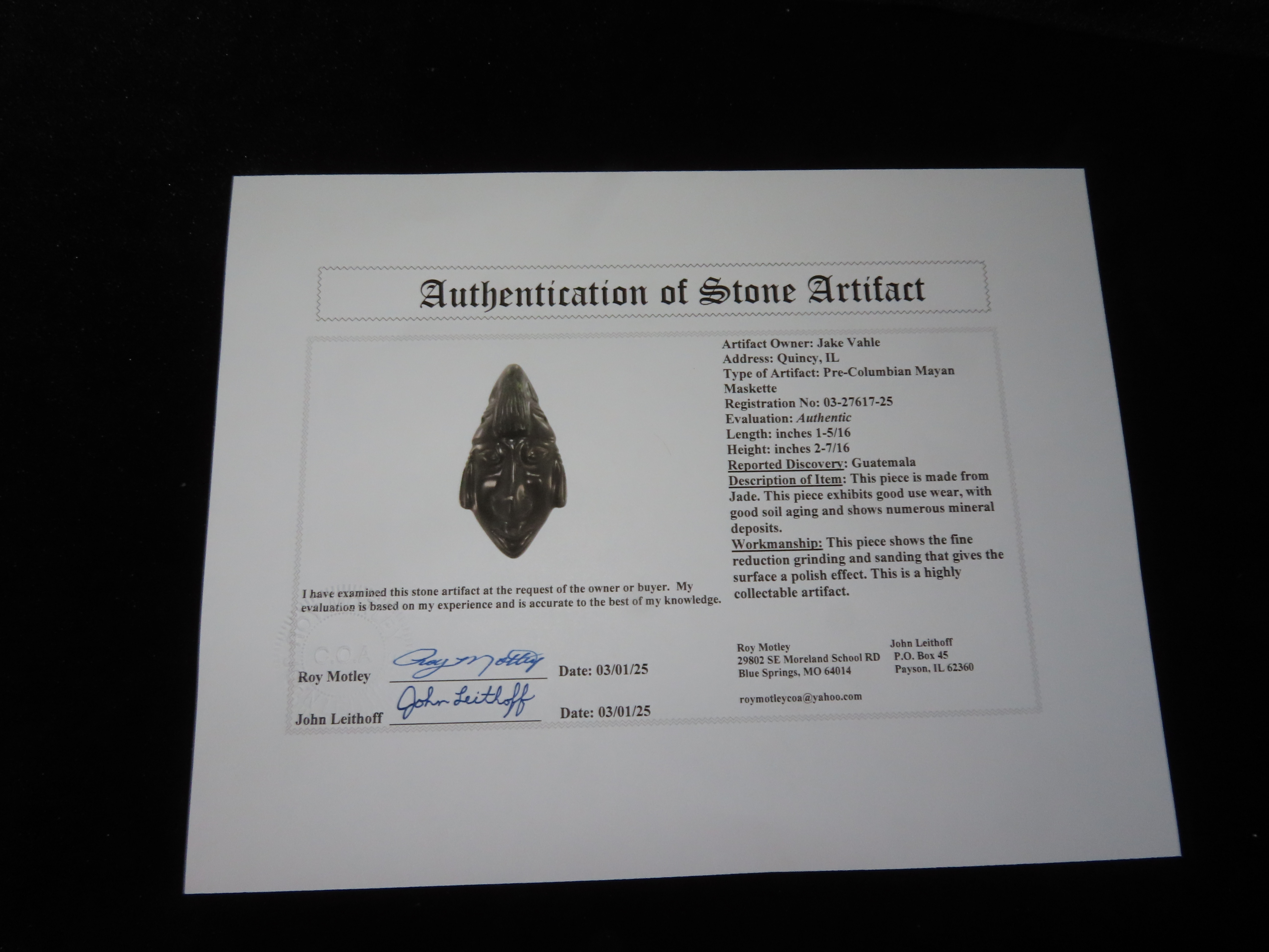 2 7/16″ Pre-Columbian Mayan Mask, Motley COA, Guatemala