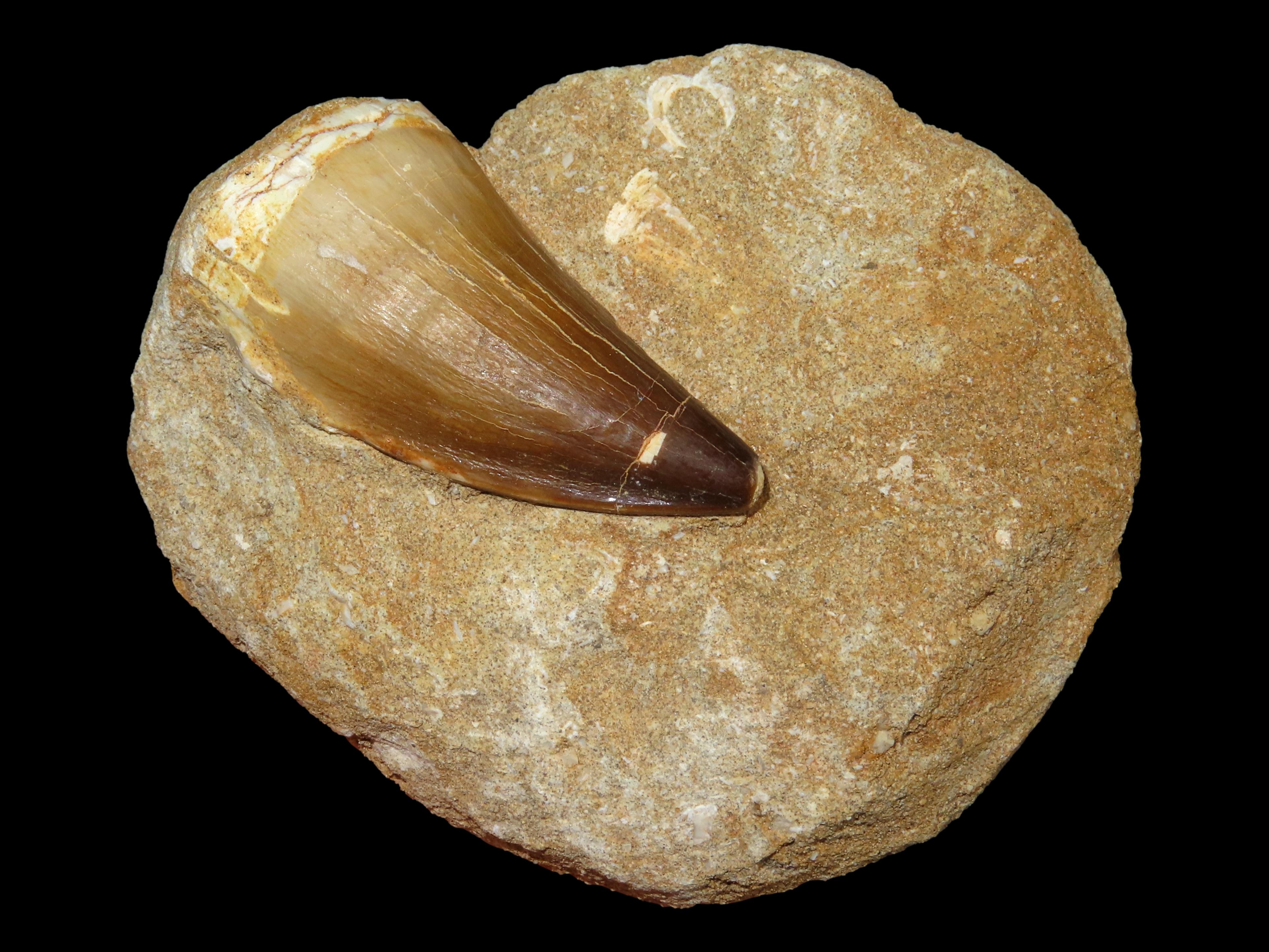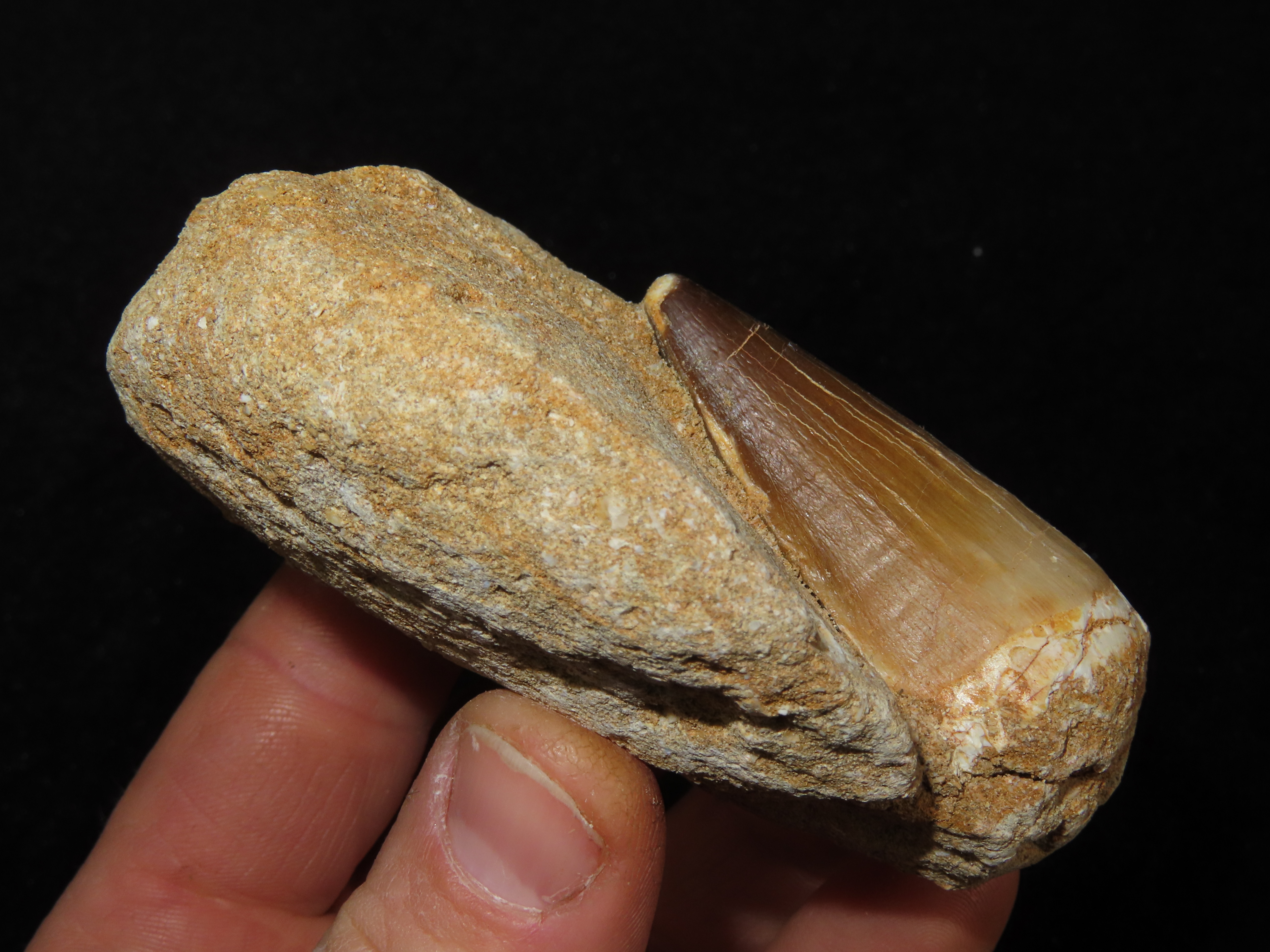 3 1/2″ X 3/14″ Mosasaur Tooth in Matrix, Mexico